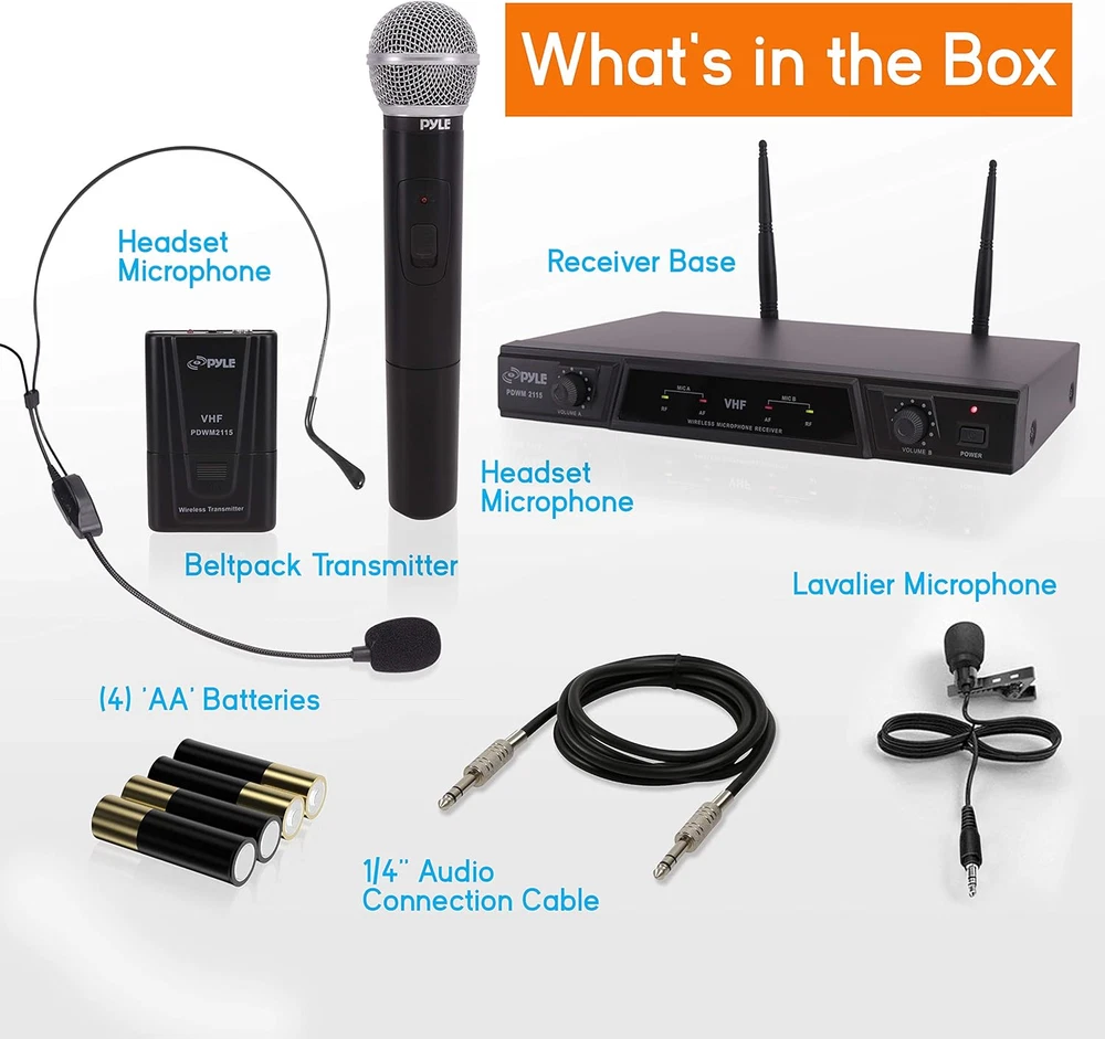 Store New Arrivals Add to Favorite View Feedback Contact Dual Channel Wireless Microphone System - Portable VHF Audio Mic Set with Clip Lavalier Lapel, Handheld, Headset, Transmitter, ¼’’ Cable, Power Adapter - for Karaoke, PA DJ - Pro PDWM2115 Description Item model number PDWM2115 Product Dimensions 9.5 x 4.75 x 14.25 inches Country of Origin China Item Weight 1 pounds Batteries 2 AA batteries required. Is Discontinued By Manufacturer No Dual Channel: This black VHF handsfree wireless microphone system by PYLE Pro has dual frequency channels and gives you 50 meters of operation range for cordless singing to karaoke music and mobility for energetic on stage performances DUAL OUTPUT JACK: The receiver base features a balanced XLR output jack to hook up your sound mixer / stereo or speaker and an AUX 1/4" phone plug for other external devices. It also has dual independent antennas and RF/AF signal LED indicator light Independent mic volume control: each dynamic or Lav mic features its own volume control so you can balance the vocals as desired for a karaoke experience that both kids and adults will enjoy. Perfect for professional engagement, conference, DJ party What's in the box: The package includes a receiver, clip lavalier lapel, handheld and headset mic, transmitter, 1/4 audio cable, and 4 'AA' Battery. The device can be used outdoor and indoor like a school classroom, church or at home for personal use WORRY-FREE SHOPPING: With the Pyle PDWM2115 we are confident of the quality of our product, therefore, we offer a 30 day money back no questions asked. VHF Wireless Microphone Receiver System with Independent Volume Control Includes Belt Pack Transmitter, Headset, Handheld and Lavalier Microphones Features: VHF Narrow Band Receiver Dual Frequency Design (Channel A/B) High Signal/Noise Ratio Performance Broad Frequency Response Range & Low Distortion Independent Adjustable Volume Control Volume Control Indicators and Status Signals Audio Output Jacks Dual Independent Channel Antennas RF Signal and AF Signal LED Indicators Radio Frequency and Audio Frequency What's in the Box: Receiver Base Wireless Handheld Microphone Headset Microphone Lavalier Microphone Beltpack Transmitter 1/4'' Audio Connection Cable (4) 'AA' Batteries Transmitter Specifications: RF Power Output: >13dBm Harmonic at higher Degree: 30KHz Modulation Pattern: FM Power Current: 70dB RF Image Rejection: -75dB Neighboring Channel / Interference: >70dB Audio Dynamic Range: 95dB T. H. D: 50 meters Power Source: AC 120V / 60Hz Dimensions: 12. 7” x 8. 5” x 1. 9” -inches Sold as: 1set Weight: 3. 85 lbs. ABOUT US We offer the best prices around on high quality products. Our E-store includes media such as books, movies, music and games while offering electronics, toys, sporting apparel, clothing, tools, general home, garden items and more. SHIPPING We are always working hard to ensure your package arrives as soon as possible. Please understand that some factors like weather, high postal traffic, and the performance of shipping companies are outside of our control. We offer free shipping to the lower 48 states and ship within 2 business days of payment, usually sooner. We do not accept P.O. Boxes. Please provide a physical address. For shipping outside of the continental USA, we only use eBay's Global Shipping Program.The item is shipped to KY and then sent to the rest of the world. International customers are responsible for all duties and taxes. Continue to check out in order to calculate costs for shipping the item to your country. Messages regarding eBay's Global Shipping Program MUST be directed at eBay EXCLUSIVELY. RETURNS We offer a 30-Day Return Policy on items which you are not completely satisfied with. You have the option for a full-refund or an exchange of the item. No returns are available on items shipped outside of the USA. PAYMENT We accept PayPal. CONTACT US This page content is yet to come Please ad us to your favorite seller and visit again later Thank You CUSTOMER SATISFACTION We try our very best to make sure every customer is completely satisfied. If there's a problem, message us! We're happy to help. WE ACCEPT Copyright © 2021 AutoDS. | All Rights Reserved