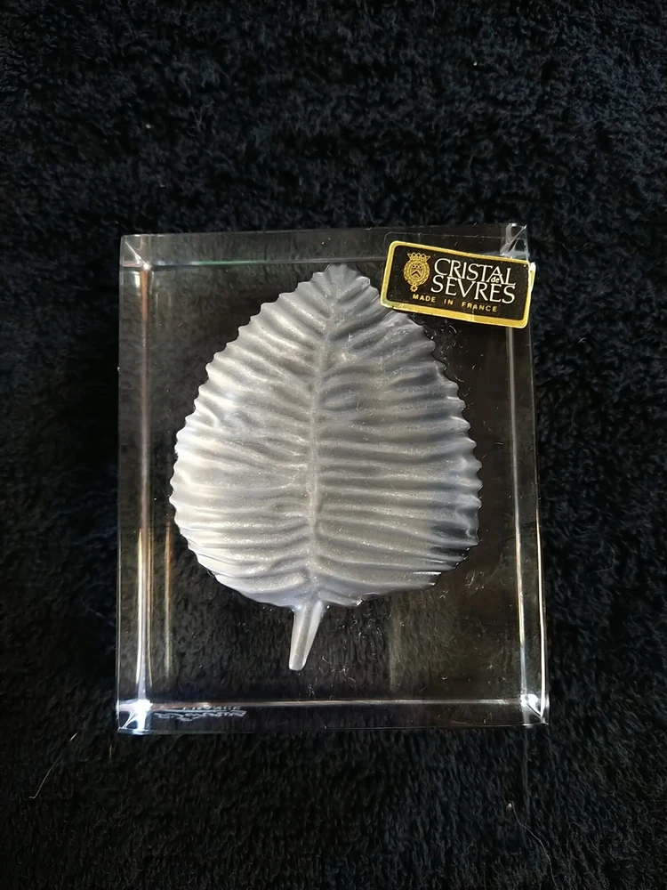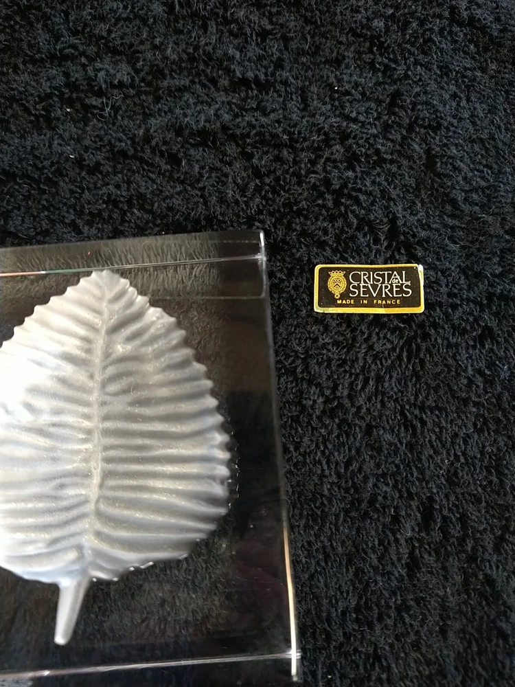 French Sevres Crystal Etched Frosted Leaf Paperweight . Vintage. Made In France. 3.25 inches tall, 2.75 inches wide and 1 inch deep. No chips or cracks that I can see. Unfortunately, the little Cristal Sevres label fell off while I was wiping it down.