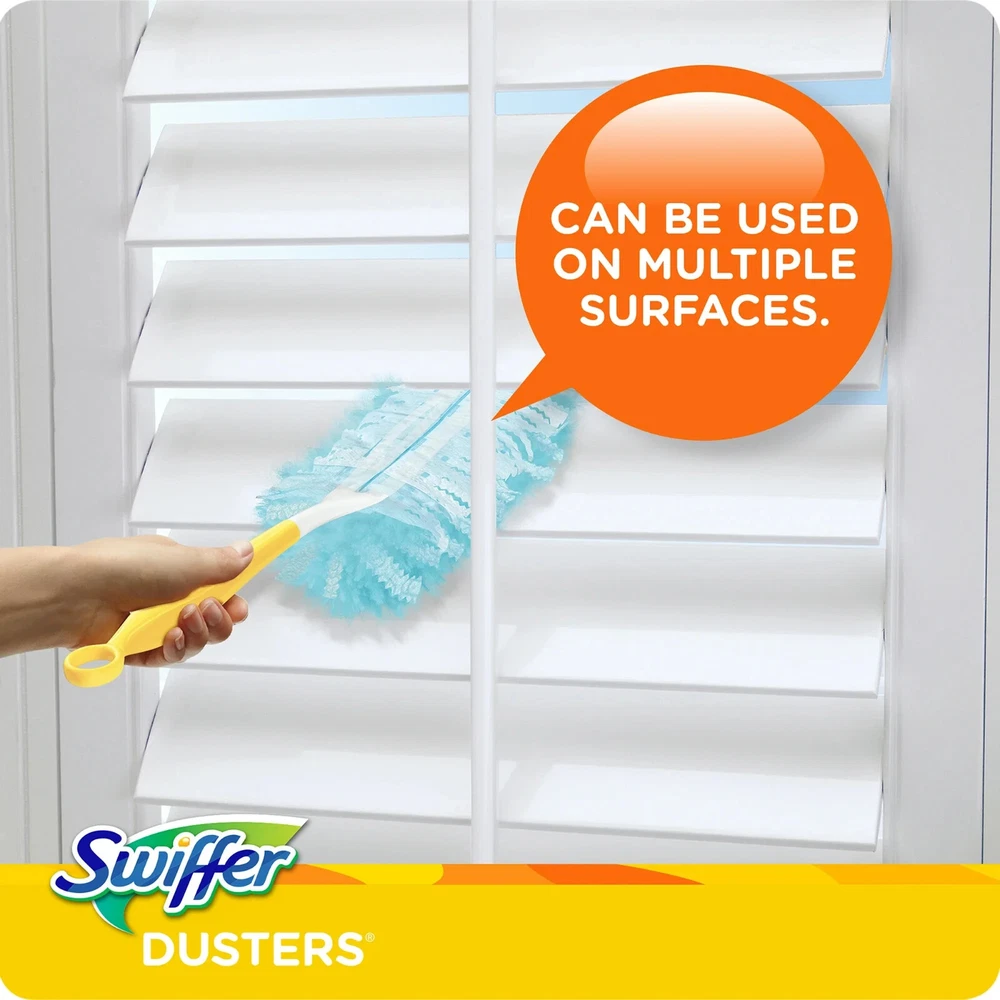 0.223 lb Swiffer Duster Starter Kit, 6" Handle Clean Multi Surface White Uniquely designed to Trap + Lock dust from even the tight spaces in your home. Specially coated fibers grab onto dust & don't let go Swiffer 180 Dusters TRAP + LOCK dust & allergens common inanimate allergens from cat and dog dander & dust mite matter Use with Swiffer Dusters short handle or Swiffer Dusters extendable handle Great for dusting electronics,dusting furniture, knick-knacks in your home or office, blinds, ceiling fans, and even your car interior Note -We do not ship to warehouse addresses -We do not ship to island addresses -We do not ship to Po Box addresse