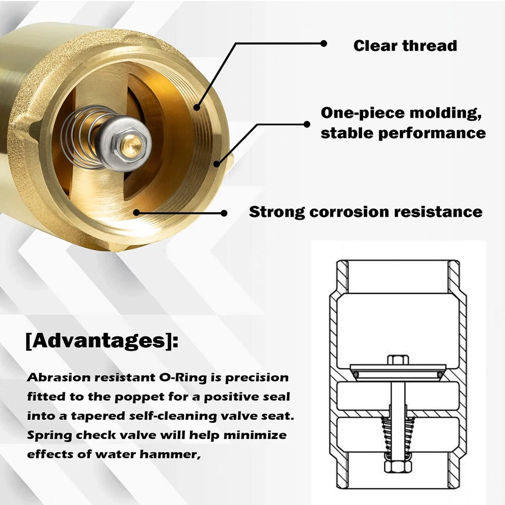 Fitment: Wide adaptability, this Check Valve works with ALL brands of pumps. Note the pipe size Features: 1) It’ unnecessary to run around searching for check valve applications. Our check valve is compatible with all bands of pumps and water systems. Both vertical and horizontal installations are available 2) 1-1/4" Check Valves effectively maintain system pressure by preventing reverse flow. Protect pumps and compressor equipment from damage caused by backflow / reverse flow. Check valves are very effective in preventing water hammer 3) Can be installed in both horizontally and vertically. Stainless Steel Spring and Fasteners. Spring-loaded poppet and O-ring assures reliable operation. Max Pressure: 200 PSI. Max Temperature: 180 F (80 C) 4) Abrasion resistant O-Ring is precision fitted to the poppet for a positive seal into a tapered self-cleaning valve seat. Spring check valve will help minimize effects of water hammer 5) Arrow on the valve this is important as the side from which the fluid enters and exits must be correct when installed Package included: Check Valve 1 1/4"