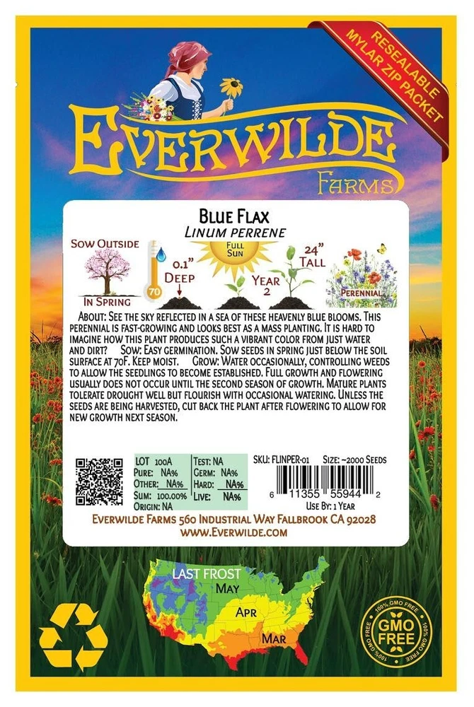 1 Ounce Mylar Packet - Blue Flax Seeds Gold Vault Mylar Zip Packet Because of the valuable fibers that can be harvested from the stems, this European native once played an important role in the production of linen fabric, ropes, and nets. Though it is no longer used for this purpose, it has become a well loved wildflower for its hardiness and perfect sky-blue color. Direct sow in late fall or early spring, planting just below the surface of the soil. This species does not transplant well. These seeds are non-GMO (Genetically Modified Organisms), and are also free from all Neonicotinoids . They are packaged in our superb Gold Mylar Mylar Zip Packaging, which gives the seeds the best storage possible, and allows you to reseal the bag for later use. The artwork and labels on the packet are loaded with information - many people comment that it is the most beautiful packet that they have ever seen. If you have never tried out our seeds before, this is your chance to experience something special!