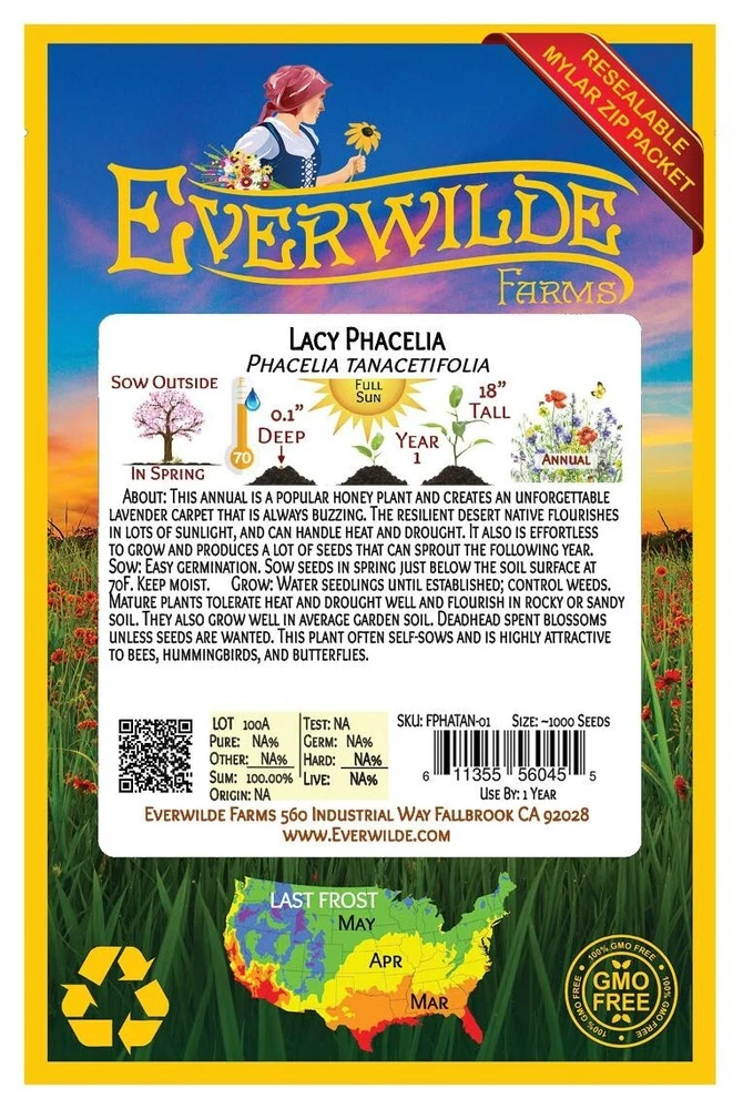 1 Ounce Mylar Packet - Lacy Phacelia Seeds Gold Vault Mylar Zip Packet This native wildflower occurs naturally in the deserts of California and Arizona. Desert gardeners appreciate this plant for its hardiness and stunning blooms, while its practical uses include making an excellent cover crop and attracting bees and other pollinating insects. The genus name "Phacelia" comes from the Greek word for "cluster," referring to the plant's growth habit. The species name "Phacelia" means "tansy-leaved," referring to the resemblance of the plant's foliage to that of the delicate tansy plant. Direct sow in early spring as soon as the soil can be worked, planting 1/4" below the soil surface since this plant needs darkness to germinate. Keep the soil lightly moist until germination. If starting the seed indoors, keep in mind that the best temperature for germination is 55-60 degrees F. These seeds are non-GMO (Genetically Modified Organisms), and are also free from all Neonicotinoids . They are packaged in our superb Gold Mylar Mylar Zip Packaging, which gives the seeds the best storage possible, and allows you to reseal the bag for later use. The artwork and labels on the packet are loaded with information - many people comment that it is the most beautiful packet that they have ever seen. If you have never tried out our seeds before, this is your chance to experience something special!