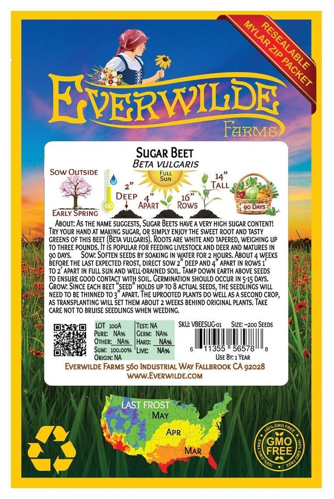 1 Ounce Mylar Packet - Sugar Beet Seeds Gold Vault Mylar Zip Packet As the name suggests, Sugar Beets have a very high sugar content! Try your hand at making sugar, or simply enjoy the sweet root and tasty greens of this beet. Roots are white and tapered, weighing up to three pounds. Popular for feeding livestock and deer. Matures in 90 days. In the mid 18th century, a German chemist by the name of Andreas Margraff found that the chemical composition of beets included sucrose similar to that of sugar cane. Sugar cane provided the only source for sugar at that time; consequently, the prices of sugar rose very high because of the necessity of importing it from foreign countries. Franz Karl Achard, one of Margraff's students, continued the research and brought the sugar beet into production for a source of sugar. For his pioneering efforts, he is called the father of the sugar beet industry. When the supply of sugar cane was lost because of war time, Napoleon declared that the sugar beet be grown in large amounts to provide sugar. This established commercial use of the sugar beet, and eventually it grew in almost every country. These seeds are non-GMO (Genetically Modified Organisms), and are also free from all Neonicotinoids . They are packaged in our superb Gold Mylar Mylar Zip Packaging, which gives the seeds the best storage possible, and allows you to reseal the bag for later use. The artwork and labels on the packet are loaded with information - many people comment that it is the most beautiful packet that they have ever seen. If you have never tried out our seeds before, this is your chance to experience something special!