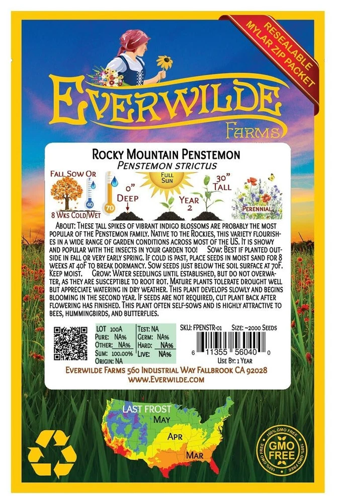 1 Ounce Mylar Packet - Rocky Mountain Penstemon Seeds Gold Vault Mylar Zip Packet John Mitchell, an 18th century American botanist, recorded the first botanical description of this plant genus; Carl Linnaeus included it in his landmark publication Species Plantarum in 1753. According to legend, Native Americans once used this plant as a versatile medicinal remedy. Its unusual common name comes from a fuzzy "tongue" in each open bloom, which gives a slight resemblance to a mouth and a tongue. The genus name "Penstemon" comes from Greek words for "five threads," referring to the stamens of each blossom. The species name "strictus" means "stiff." Direct sow in late fall, pressing into the surface of the soil since this seed needs light to germinate. For spring planting, mix the seeds with moist sand and store in the refrigerator for 30-60 days before planting. Keep the soil lightly moist until germination. This seed can also be started indoors 6-8 weeks before planting in the spring. These seeds are non-GMO (Genetically Modified Organisms), and are also free from all Neonicotinoids . They are packaged in our superb Gold Mylar Mylar Zip Packaging, which gives the seeds the best storage possible, and allows you to reseal the bag for later use. The artwork and labels on the packet are loaded with information - many people comment that it is the most beautiful packet that they have ever seen. If you have never tried out our seeds before, this is your chance to experience something special!