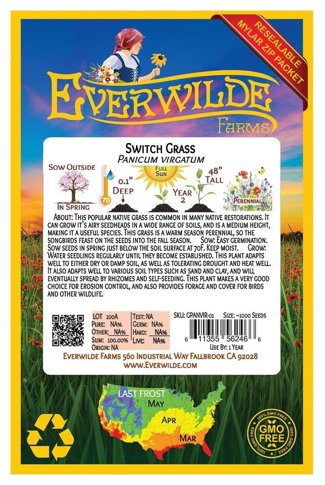 1 Ounce Mylar Packet - Switch Grass Seeds Gold Vault Mylar Zip Packet In addition to being one of the main species of the tallgrass prairie, this plant provides good forage for grazing animals and refuge for birds and other wildlife. It also has value as an ornamental plant because of its airy, copper-tinted seed heads. The genus name "Panicum" comes from the Latin word for millet, since that grain is in the same plant family as this native grass. Direct sow either in late fall or early spring. Plant the seed just below the surface of the soil, compacting the soil very firmly. Keep the soil lightly moist until germination, since this seed cannot germinate in dry soil. These seeds are non-GMO (Genetically Modified Organisms), and are also free from all Neonicotinoids . They are packaged in our superb Gold Mylar Mylar Zip Packaging, which gives the seeds the best storage possible, and allows you to reseal the bag for later use. The artwork and labels on the packet are loaded with information - many people comment that it is the most beautiful packet that they have ever seen. If you have never tried out our seeds before, this is your chance to experience something special!