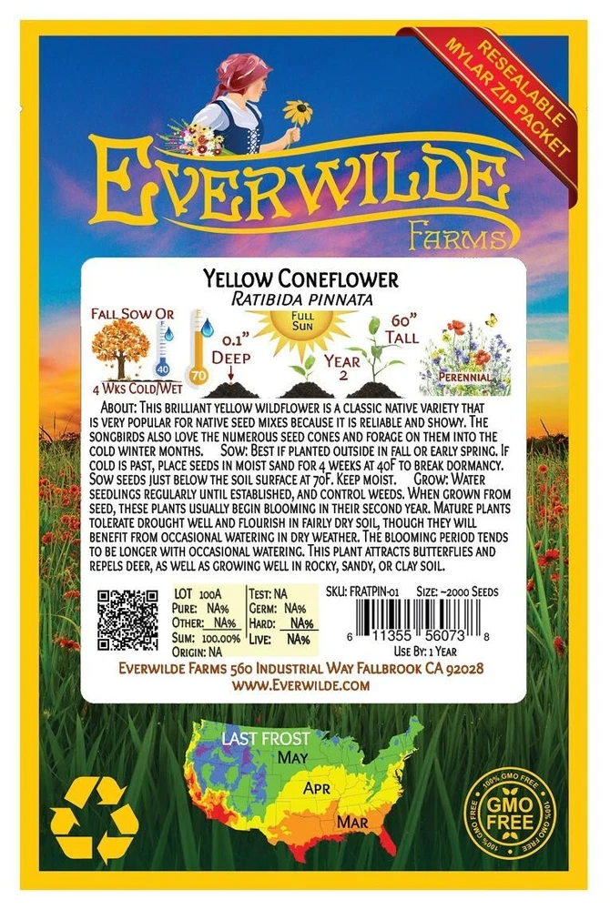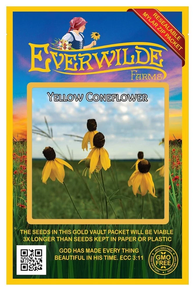 1 Ounce Mylar Packet - Yellow Coneflower Seeds Gold Vault Mylar Zip Packet Native coneflowers have a reputation for establishing themselves in soil that few other plants would tolerate. They have a long-lived persistence, and also attract butterflies and songbirds. English naturalist Thomas Nuttall first documented this species on one of his many expeditions throughout western America. The Latin name "columnifera" means "column," referring to the prominent center of each blossom. Direct sow in late fall, pressing into the surface of the soil. For spring planting, mix the seeds with moist sand and store in the refrigerator for 30 days before planting. Keep the soil lightly moist until germination, which usually takes 3-4 weeks. The seeds can also be started indoors 8-10 weeks before planting in spring. Keep seedlings lightly moist, and transplant them as soon as they have developed several leaves. These seeds are non-GMO (Genetically Modified Organisms), and are also free from all Neonicotinoids . They are packaged in our superb Gold Mylar Mylar Zip Packaging, which gives the seeds the best storage possible, and allows you to reseal the bag for later use. The artwork and labels on the packet are loaded with information - many people comment that it is the most beautiful packet that they have ever seen. If you have never tried out our seeds before, this is your chance to experience something special!