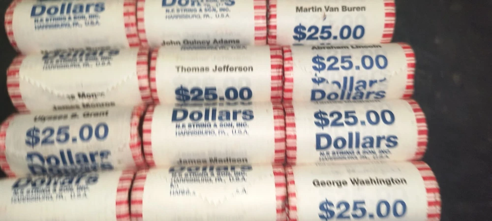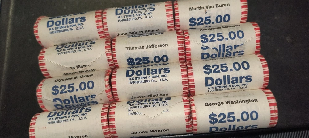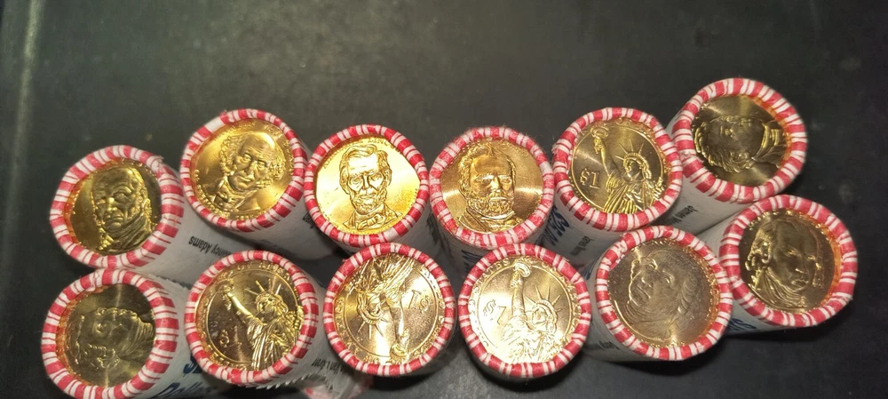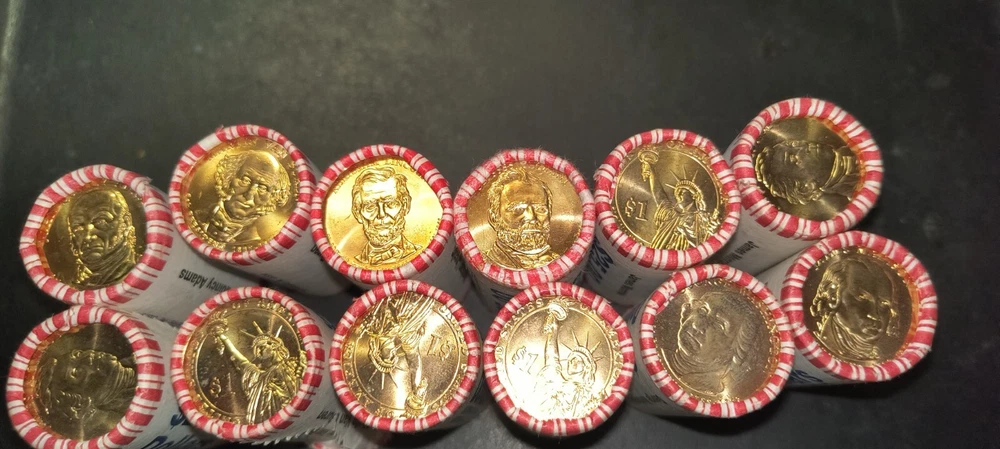 This is a roll of 25 uncirculated $1 Presidential coins Lincoln,Washington,John q Adams, Monroe, van buren,madison, Jefferson and Ulysses s. grant. please leave a message after purchase on the one you chosen or I will randomly chose one.