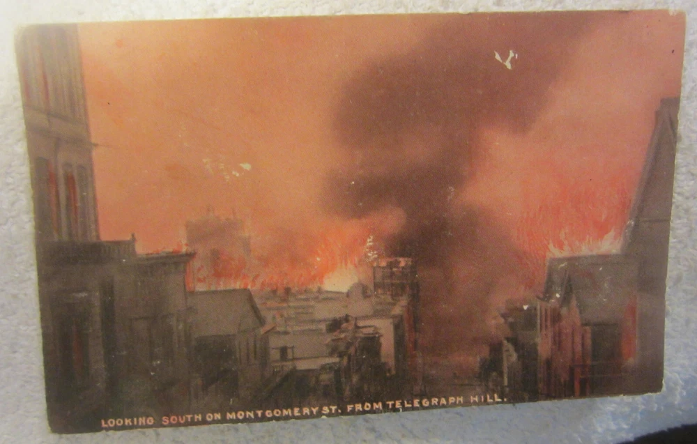 Home1 city fire San Francisco CA Looking South on Montgomery St. Vtg postcard