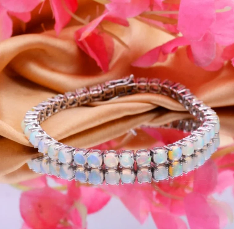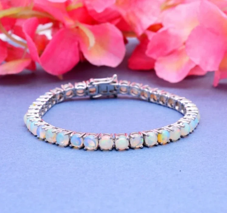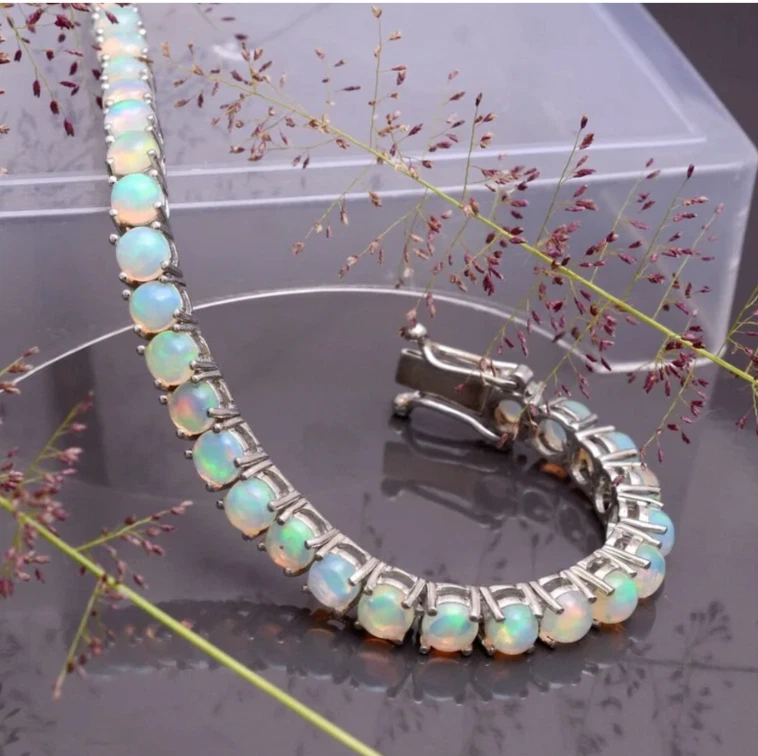 This stunning bracelet is a must-have for any jewelry collection. With a beautiful round Ethiopian Opal as the main stone, this bracelet is set in fine silver and has a curb link chain type. The box closure makes it easy to wear and the 6.5 inch length is perfect for any wrist size. This bracelet is handmade and features 35 gemstones with a total carat weight of 10. The opal is natural and has not been enhanced in any way. The bracelet is nickel-free and has a platinum over sterling silver finish. It is perfect for anniversaries or any special occasion. Beauty, luck, love, fashion, and costumes are all themes that can be incorporated into any outfit with this bracelet.