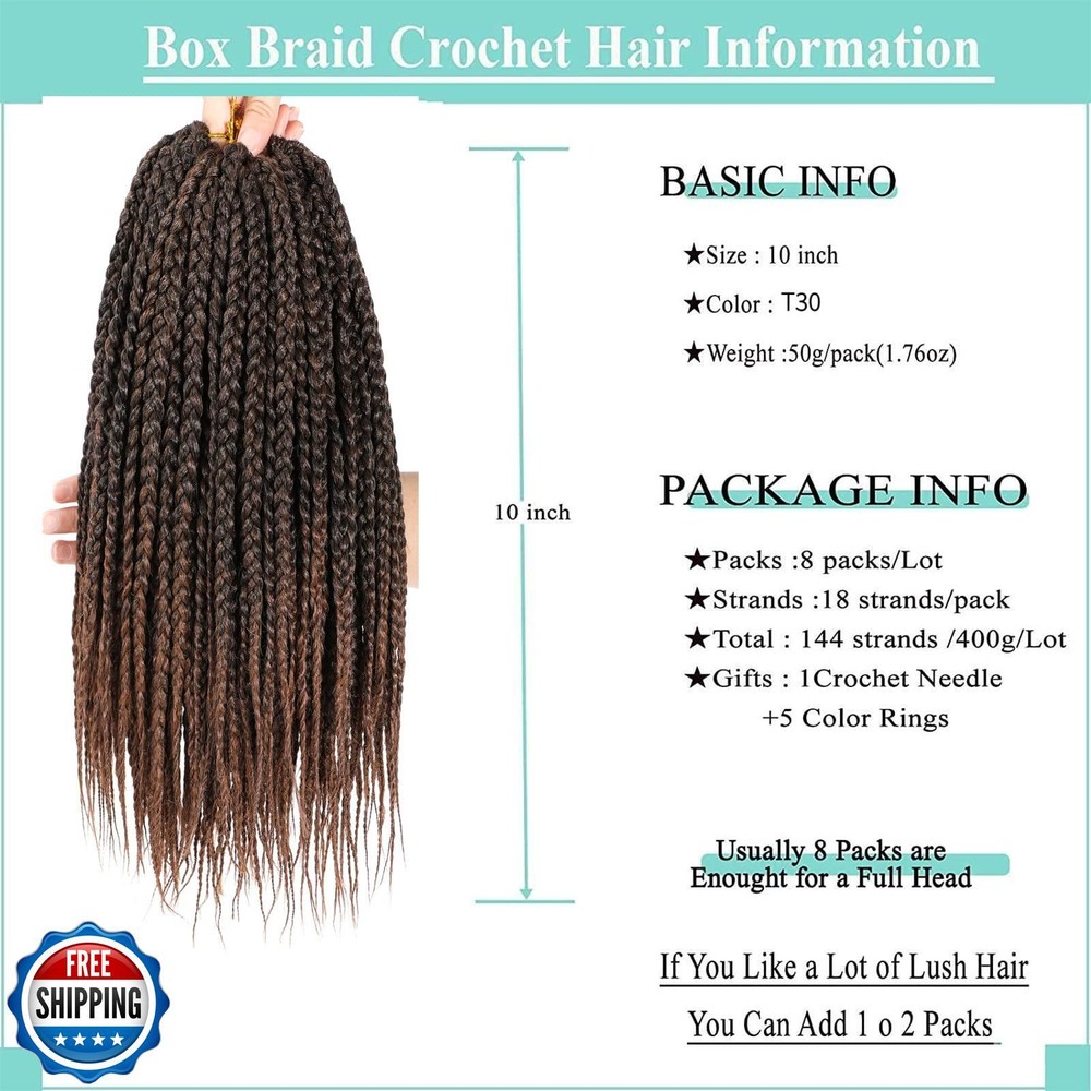 Crochet Box Braids 10 Inch 8 Packs T30 Goddess Box Braids Crochet Hair Prelooped Crochet Hair 3x Box Braided Crochet Hair Synthetic Braiding Hair Crochet Braids Hair for Black Women Features 【Crochet Box Braids Package Details】: 8Packs 10Inch Box Braids Crochet Hair is 18 Strands/Pack, Weight: 16.93oz(480g±5g)/Pack , Total 144 Strands with Gifts (1 Crochet Hook+5 Rings), 8Packs Box Braids Crochet Hair Can Make a Very Full Head. 【Box Braid Crochet Hair Material】: 100% High Quality Low Temperature Flame-Retardant Fiber Crochet Box Braids. Light & Weight, Super Soft, No Smell, Looks Very Neat and Smooth, Tangle-free, Shedding-free, Not Easy to Separate, Natural &Comfortable, Hold Long Time. 【Crochet Braids Pre Looped Easy Install & Save Time】: Individually Pre-Looped, 100% Hand-Made, It's easy to Install, the Loops are Easy to Pull Through the Crochet Braids, Easy to Work with Install, Time-Saving, Labor-Saving and Saving Money. 【 Box Braid Hair Applicable Occasions】: This Knotless Box Braid Crochet Hair Can Give You Elegant and Dignified Beauty, Suitable for Wearing on Any Occasions, Daily Life, During Work, Parties, Festivals, Weddings and So on. This Braiding Hair Extensions Can Also be Used as Birthday or Holiday Gift for Friends or Family Members. 【Flagship Hair Customer Service】: We Provide Cost-effective High-Quality Hair Products, We Can Also Give Many Professional Suggestions to Make Your Hair Look More Wonderful. Shipping Free & Fast Shipping: We offer free shipping to most of the USA with a normal delivery time of 3-7 days. However, due to the current situation, additional delivery time (up to 3 weeks) may be required for some items. Alternative Carriers: We may use alternative carriers (e.g., USPS, FedEx, UPS) to ensure your package arrives safely and on time. Due to the use of multiple carriers, we are unable to provide a tracking number automatically. Handling Time: Orders are processed and shipped within 1-2 business days of receiving cleared payment. Shipping Restrictions: Shipping to Alaska, Hawaii, Puerto Rico, Guam, and other US territories may incur shipping charges or delivery restrictions. Please contact us before ordering, or your order can be refunded/cancelled. State Restrictions: Certain items may not be shipped to California due to state regulations. Contact for Tracking Updates: If you require tracking updates or have any concerns about the delivery of your order, please feel free to contact us, and we will be happy to assist you. Return Policy 30-Day Hassle-Free Returns: If you are not completely satisfied with your purchase, you can return the item for free within 30 days of receiving it for a full refund or exchange. Easy Return Process: Contact us, and we will provide you with a prepaid return shipping label and detailed instructions. No Restocking Fee: There are no restocking fees for returns. However, the buyer is responsible for return shipping costs if the return is not due to a seller"s error. Refund Processing: Refunds will be processed within 1 business day of receiving the returned item in its original condition. Feedback Your feedback is extremely important to us. We strive to provide the best products and customer service possible. If you are satisfied with your purchase, please take a moment to leave us a positive review. If you have any concerns or issues with your order, please contact us before leaving negative feedback. We are committed to resolving any problems and ensuring your satisfaction. Contact Us If you have any questions or concerns, please feel free to reach out to our customer support team. You can contact us through the eBay messaging system. We are available Monday to Friday, 9:00 am to 5:00 pm EST, and we will do our best to respond to your inquiry within 24 hours. Thank you for supporting our small family business!