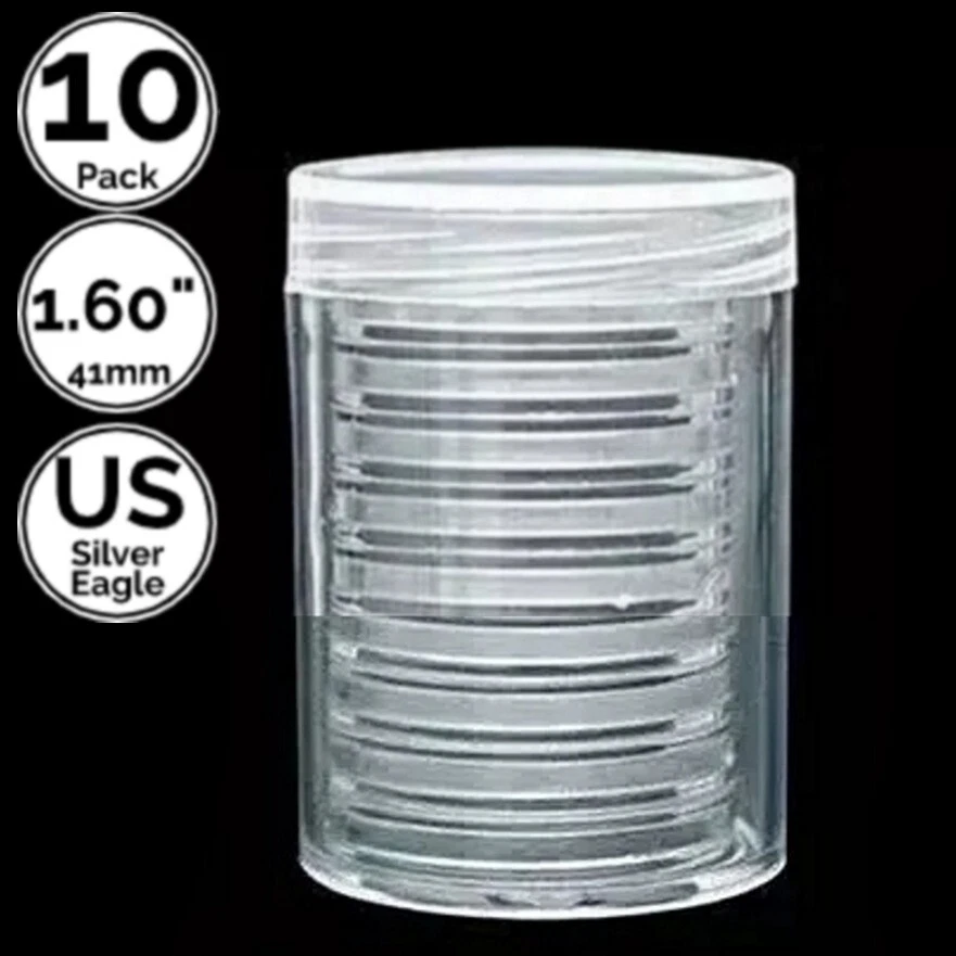 #10 Pack 1.6 Inch 41mm Coin Capsule Holders w/Tube For US American Silver Eagle #Free Shipping in the United States #Free Return #SPECIFICATIONS Inside Diameter 1.57" Inches(41 mm) x 0.12" Inch(3.0mm) Pack of 10 Pieces with Storage Tube Direct Fit US Silver Eagle/ Australian 1 Oz Silver Bullions & Hold Coins that Have Similar Diameter Brand New #PRODUCT DETAILS Crescent Opening Design, Easy to Open Tight Seal Scratch Resistant Anti Oxidation High Transparency Premium PS Material, PE Material For the Tube, PVC Free Always Coins Not Included Satisfaction & 30-DAY Free Return Guaranteed