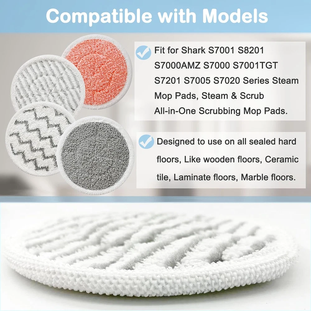 Compatible Models: Fit for Shark S7001 S8201 S7000AMZ S8001 S7000 S7001TGT S7201 S7005 S7020 Series Steam Mop Pads, Steam & Scrub All-in-One Scrubbing Mop Pads, Designed to use on all sealed hard floors, like wooden floors, ceramic tile, laminate floors, marble floors 10 Pack Design: You will get 10 packs of Shark S7001 Pads, Separately, they are Powerful scrubby pads X4, Soft touch pads X4(WhiteX2 GrayX2), Heavy scrubby pads X2 Mopping Pads Upgrade: Powerful Scrub Pads the pad is same size with the regular scrubby pads, be made of velvet and bristle brushes, super friction can break up the stubborn sticky stains easily in kitchen, balcony or entryway Microfiber Material: Effective cleaning, strong water absorption, dry fast, without fading in high temperatures. If you have any questions about the product,please contact our customer service immediately Product Description Fit for Shark S7000 Shark S7000AMZ Shark S7001 Shark S7001TGT Shark S7000 Shark S7201 Shark S7005 Shark S7020 Power Scrubbing Pad Powerful Scrubbing Pad is designed for use on stubborn kitchen stains, removes stubborn stains with force. Heavy Duty Scrubbing Pad Perfect for footprints, mud stains, etc. on living room tile and hardwood floors. Fine Soft Fiber Scrubbing Pad for dust and dander stains on cork floors. Ultra-fine soft scrubbing pad perfect for water stains left in the bathroom and highly absorbent. Steam wipes perfect for using your machine Replace the steam wipes to improve your machine's work performance and give it a new look. Super absorbent Thick material. Super absorbent Mesh Fixed Mesh Not easy to deform Not easy to fall off Washable and reusable Wash, dry and reuse to save cost and money Machine washable or hand washable With our Shark Steam Mop Pads washable design, you'll always be ready to steam away dirt and grime.