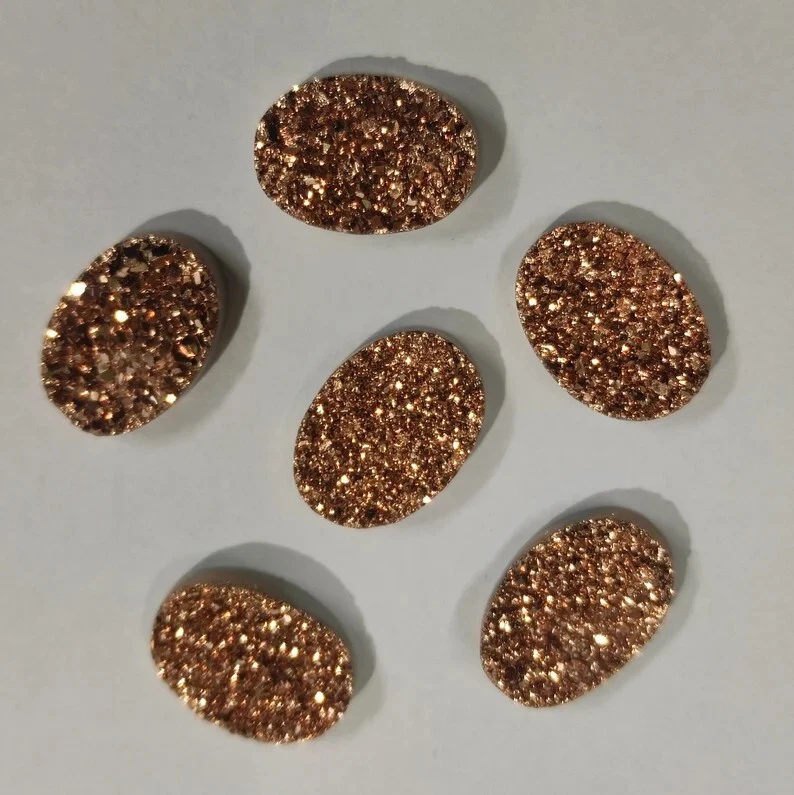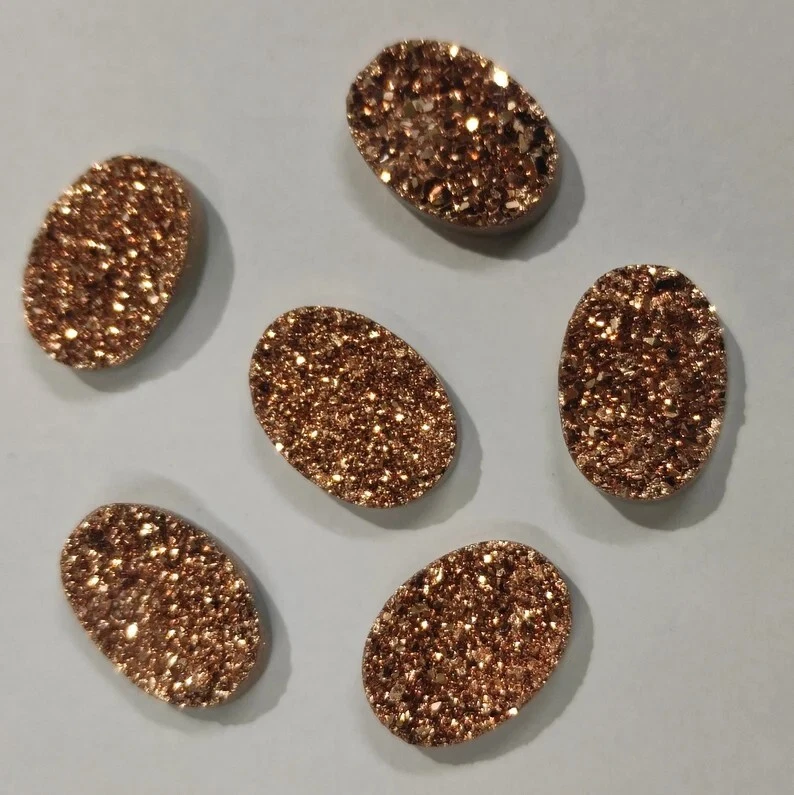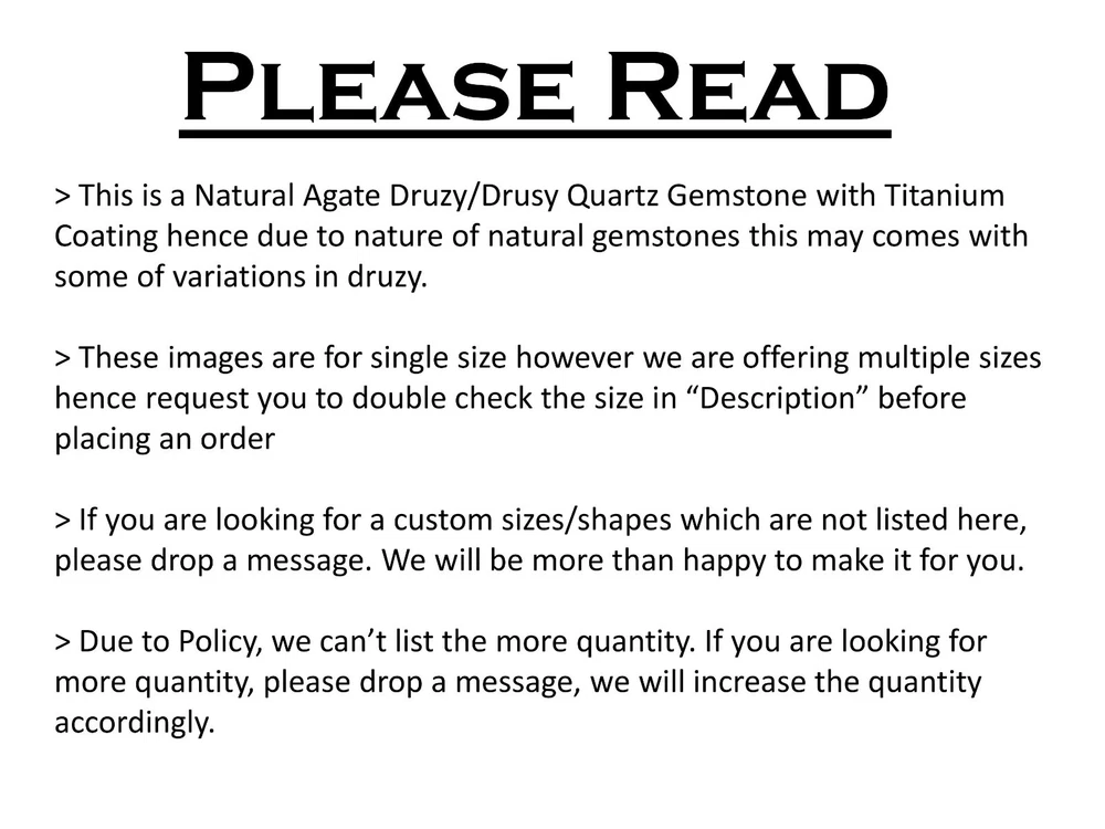 Welcome To Gempires This is a set of 10 oval-shaped Titanium Agate Druzy Quartz gemstones with a Rose Gold color. The gems have an excellent cut grade and are 100% natural with eye-clean clarity. They are not treated or enhanced and come with certification for authenticity. Handmade in India, these drusy gemstones are perfect for wholesale purchase for use in jewelry-making or other creative projects. 10 Pcs Natural Oval Titanium Agate Druzy Quartz Unique Drusy Earrings Making Lot Check My Other Titanium Agate Druzy Quartz Listings : Click Here Note: For Custom / Bulk Order, Please contact on Ebay Message Service. QUALITY ASSURANCE:- The photo may not give you the actual size, please refer to the item description for size details. Our product Images are original. We dont use Photoshop for any editing. We always do our best to display an actual image of the gemstone which is to be delivered to our customers. We check all our items and ensure the best quality standards. The item weight may vary 5% (+/-) at maximum and size may vary .10 cents (+/-) as per the gemstone standard. Return Policy:- Any reason, if you are not satisfied with our product, you may return item within 14 days from the date of product delivered. The Item must be returned in its original condition. Return shipping will be paid by buyer. Shipping Policy: At Gempires, we offer two shipping options for our customers: Standard Shipping: 13-15 Days Express Shipping: 5-7 Days Standard Shipping: Our standard shipping option takes approximately 13-15 days for delivery. Please note that this is an estimated time frame and may vary depending on your location and any unforeseen circumstances. We strive to ensure that your order is processed and shipped as quickly as possible. Express Shipping: If you need your order delivered quickly, we offer an express shipping option that takes approximately 5-7 days for delivery. This option is available at an additional cost, which will be displayed during the checkout process. Please note that this time frame is an estimated delivery time and may vary depending on your location and any unforeseen circumstances. Handling Time All orders are processed and shipped within 1-2 business days after payment has been received. Once your order has been shipped, you will receive a tracking number via Ebay notifications, which you can use to track your package. Custom Duty Note Please note that we are not responsible for any customs or import duties that may be charged once the package reaches your country. These charges are the responsibility of the buyer and are not included in our shipping fees. We take great care in packaging our products to ensure that they arrive at your doorstep in pristine condition. However, if your package arrives damaged or you have any other concerns about your order, please don't hesitate to contact us. We will do our best to resolve any issues and ensure that you are satisfied with your purchase. Feedback Policy:- At Gempires, we value your feedback and strive to provide the best customer experience possible. We welcome your reviews and appreciate your time in sharing your thoughts about your purchase with us. If you are satisfied with your purchase and our service, we would love to hear about it. Your positive feedback can help other buyers make an informed decision about our products and services. If for any reason you are not completely satisfied with your purchase or our service, please reach out to us before leaving a negative review. We are committed to resolving any issues that may arise and ensuring your satisfaction. Thank you for choosing Gempires for your natural gemstone needs. Your feedback is valuable to us, and we look forward to providing you with exceptional service in the future. Best Regards Gempires