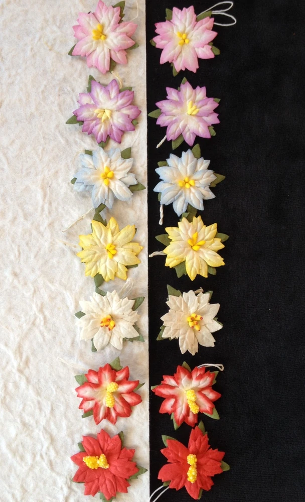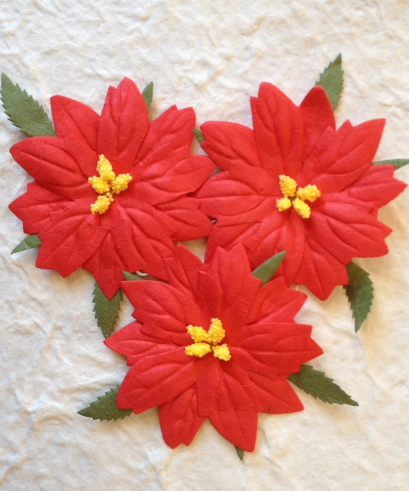This listing is for 10 large, red mulberry paper Poinsettias. The pollen is three dimensional. These beautiful, winter flowers are approximately 2 1/2" (63 mm) in diameter not including the leaves. There is a short loop on the back for easy attachment to your project. These will be wonderful for embellishing your holiday cards, tags, gift bags, and packages. These are available in a smaller red (Photo 5), white, yellow and variety pack(Photo 6). See my store, Mulberry Bear 2. Powered by eBay Turbo Lister The free listing tool. List your items fast and easy and manage your active items.