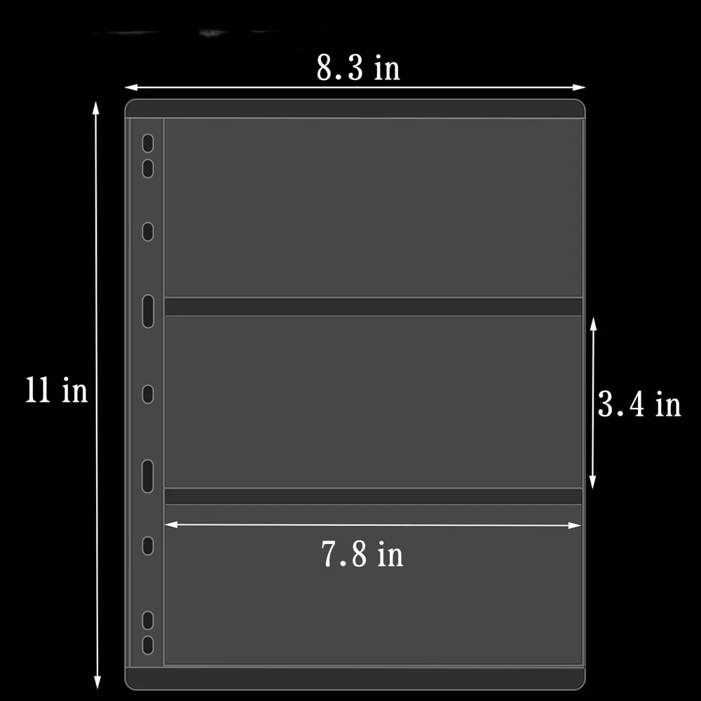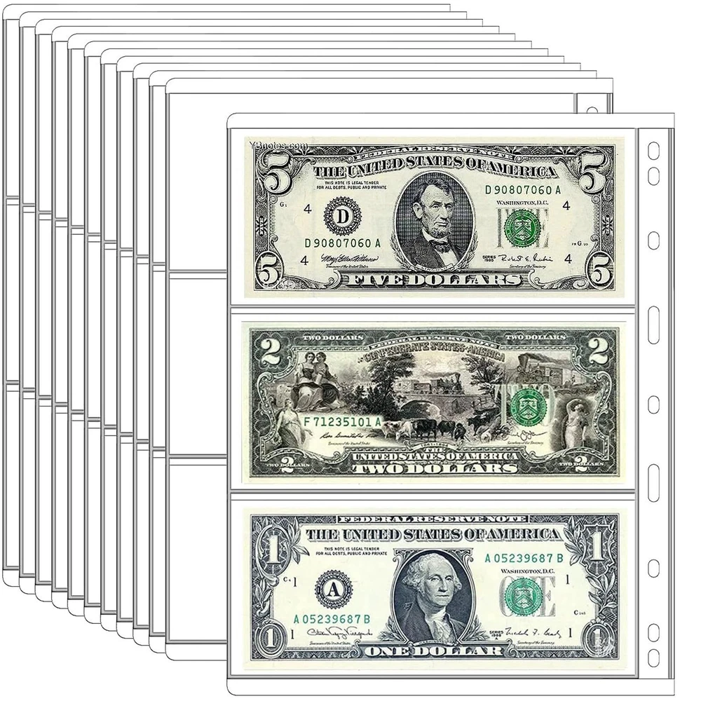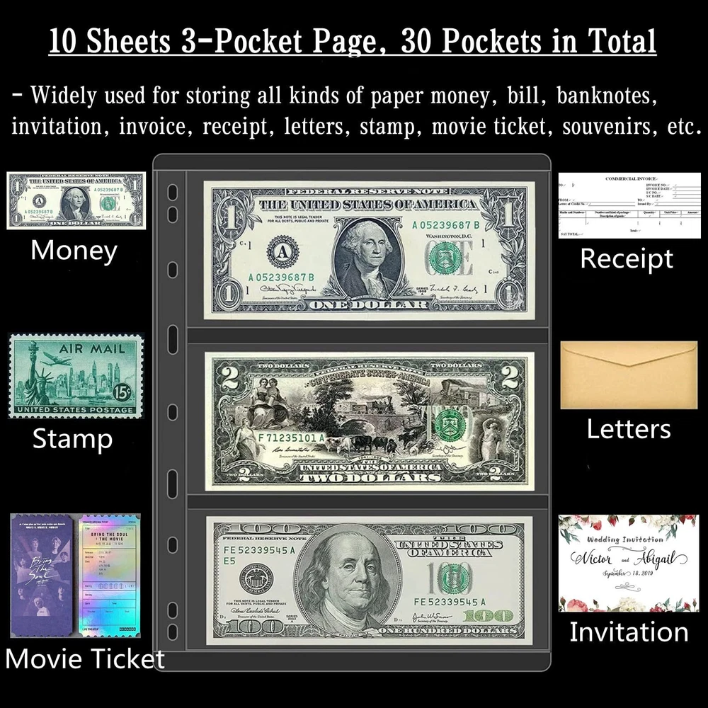 【10 Sheets Currency Collection Page】 -- The package includes 10 sheets paper money collecting pages, 3 Pockets per sheet. Pocket Size: 7.83x3.43 inch. Suitable for storing most sizes of paper money, bill, banknote, stamp, souvenirs etc. 【Professional Design】-- There is a transparent protective film over the page, please remove the protective film before use. 【Thickened Pages with High Transparency on Both Sides】-- ①.28c thick collecting pages, much thicker than most pages on the market. ②.Highly transparent on both sides, can clearly show your paper money both sides, facilitate to view and exchange. A wonderful way to store and display your collection. 【Premium Material】-- Made of acid free PVC without softener, no harm to paper money/currency, dust-proof and non-toxic, perfect for displaying currency and keeping them clean as well. 【9 Holes Design】-- The premium page with 9 holes,suitable for many sizes of binder, especially for US standard 3-ring binder. Page size: 28 x 21cm/11 x 8.3 inch(L*W).