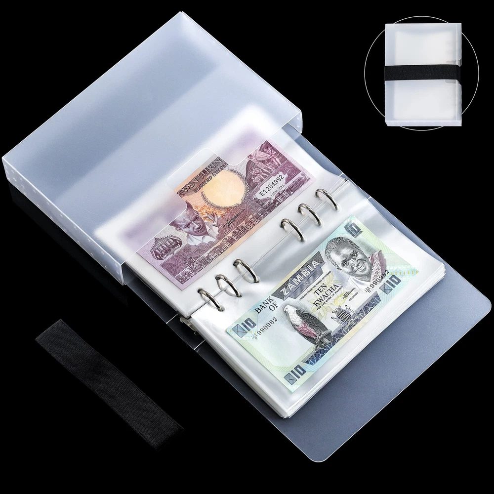 Each collecting process is a romantic journey. Paper currency album can help you protect your precious collection. Moisture-proof, water-proof, stain-proof and corrosion-proof to provide your treasures a safe harbor. It is easy to use and clean, and only needs to be wiped with a wet rag. If you have any questions after receiving the product, please contact us in time. We will serve you wholeheartedly. Features Material: acid-free PVC, OPP Color: transparent Capacity: 100 sheets Dimensions: 17.3 x 10.4 cm /6.8 x 4.1 inches (inner page) 19.2 x 13.0 cm /7.5 x 5.1 inches (cover) 19.8 x 13.8 cm /7.8 x 5.4 inches (protective case) Applicability: Accommodate paper collectibles smaller than 17.0 x 9.4 cm /6.7 x 3.7 inches. Generally applicable to all US dollars, euros, Canadian dollars and A, B, C, D, E, F, G series pounds sterling. Packing: 1 x Currency Album (100 pages, protective case, elastic strap included) 【PRODUCT SIZE】- 17.3 x 10.4 cm /6.8 x 4.1 inch loose-leaf inner pages/pockets, 19.2 x 13.0 cm /7.5 x 5.1 inch cover with 19.8 x 13.8 cm /7.8 x 5.4 inch protective case. 【LARGE CAPACITY】- 100 ultrahigh-transparency pockets can accommodate paper currency, bills, tickets, documents, invoices, etc. less than 17.0 x 9.4 cm /6.7 x 3.7 inches. 【6-RING BINDER】- Metal 6-ring binder similar to a Filofax Personal, with 4 holes of 0.75 inches apart and a hole of 2.0 inches apart, suitable for corresponding hole-spacing binders. 【MULTI-PROTECTION】- Quality OPP inner pages, acid-free PVC cover and protective case effectively provide triple protection. Keep banknotes free of dust, moisture and scratches. 【BONUS DESIGN】- Fully transparent design ensures the visibility of your collection, which can be displayed and appreciated anytime and anywhere. Equipped with a 30cm elastic strap to prevent the album from sliding sideways.