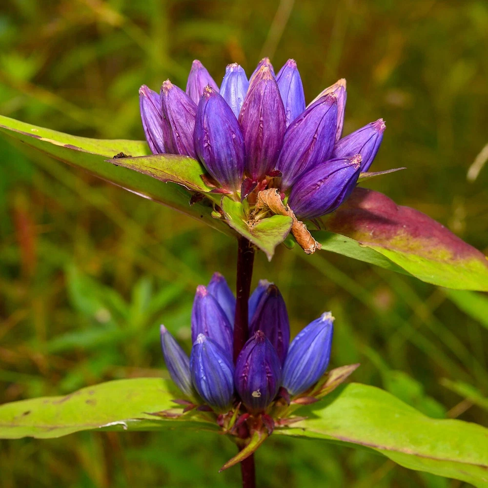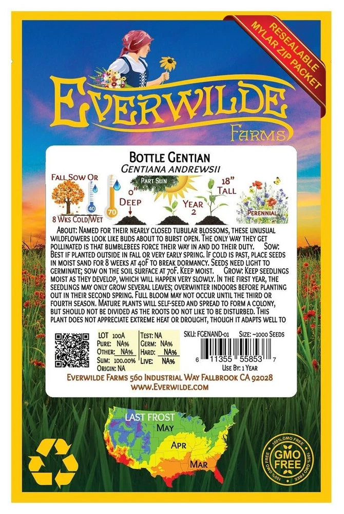 XL Mylar Packet - Bottle Gentian Seeds Gold Vault Mylar Zip Packet These unusual wildflowers, named for their nearly closed tubular blossoms, look like buds about to burst open. In order to pollinate them, bumblebees and other large bees must force their way into the small opening at the top; the unique design of the blossom expands just enough to allow passage. The Gentiana genus was named after King Gentius, an ancient ruler of the kingdom of Illyria who, according to legend, discovered the many medicinal benefits of this family of plants. The species name "andrewsii" honors Dr. Henry C. Andrews, a 19th century English botanist and renowned botanical artist. To break this seed's dormancy, mix the seed with moist sand and store it in the refrigerator for 60 days before planting. Scatter the seed on the surface of the soil, then press it in lightly. Keep the soil moist, but water carefully to avoid disturbing the seed. Germination may be slow. Transplant two seedlings each in individual pots, handling carefully to prevent breaking the hair-like roots. These seeds are non-GMO (Genetically Modified Organisms), and are also free from all Neonicotinoids . They are packaged in our superb Gold Mylar Mylar Zip Packaging, which gives the seeds the best storage possible, and allows you to reseal the bag for later use. The artwork and labels on the packet are loaded with information - many people comment that it is the most beautiful packet that they have ever seen. If you have never tried out our seeds before, this is your chance to experience something special!