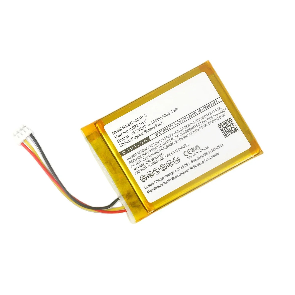1000mAh L0721-LF Battery Replacement Compatible with JBL Clip 3 Portable Bluetooth Wireless Speaker with Installation Tools. Replacement for the Following Battery Model/Part Numbers: L0721-LF. Intended for/Compatible with the Following Bluetooth Speaker Models: JBL Clip 3, JBLCLIP3BCAMOAM, JBLCLIP3BLKAM, JBLCLIP3BLUAM, JBLCLIP3GRNAM, JBLCLIP3GRYAM, JBLCLIP3PINKAM, JBLCLIP3REDAM, JBLCLIP3SANDAM, JBLCLIP3SQUAD, JBLCLIP3TEALAM, JBLCLIP3WHTAM, JBLCLIP3YELAM. 3.7V 1000mAh 3.70Wh Lithium-Polymer Rechargeable Battery Pack. Includes Free Installation Tools. 1 Year Replacement Warranty.
