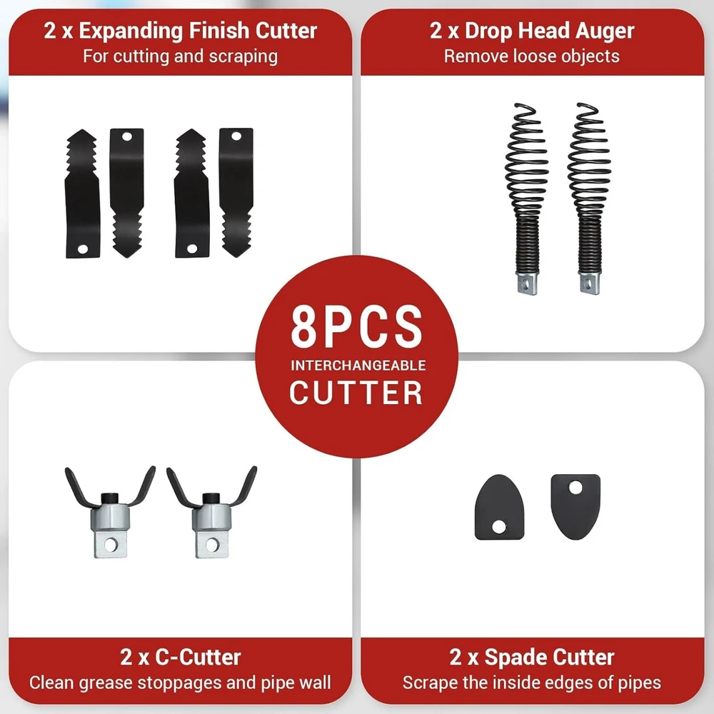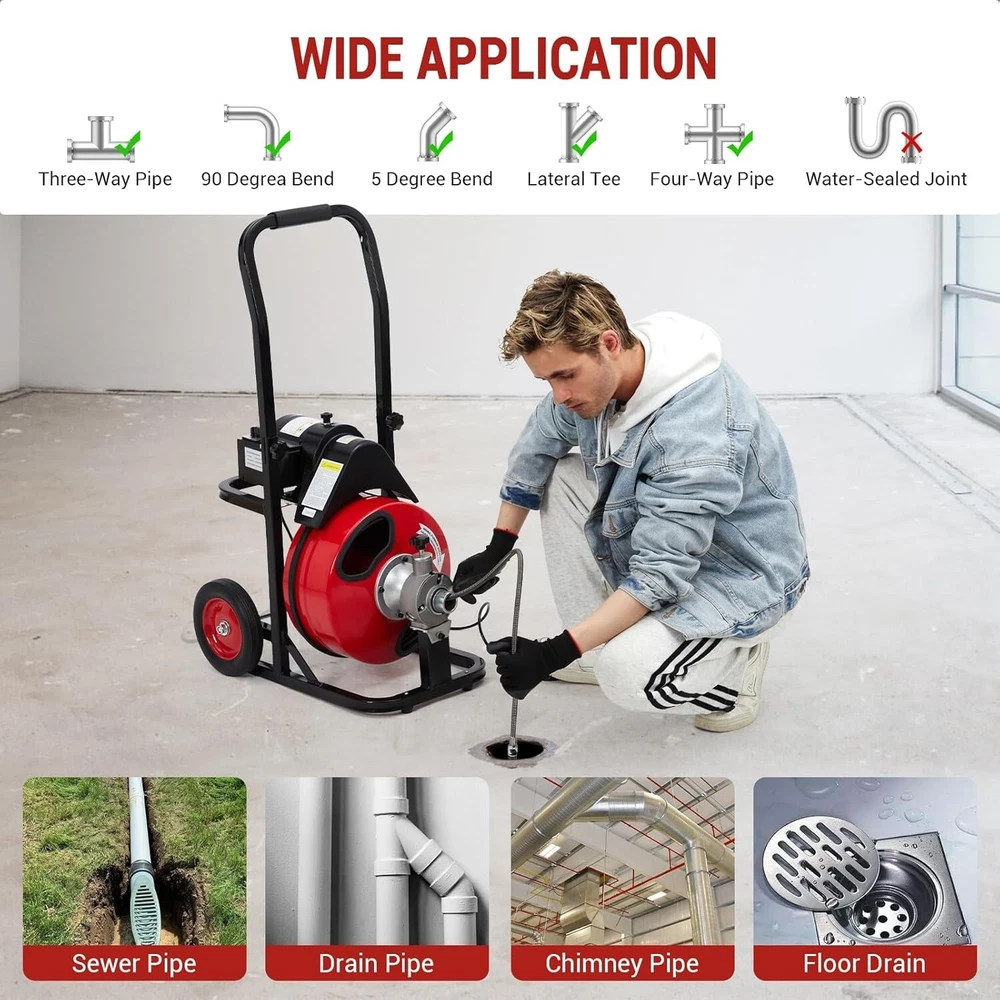Description: 1. Material: The snake auger cleaner is equipped with 100 feet high-quality manganese steel cable, diameter is 1/2 inches, it has excellent resistance to breakage, rust and corrosion, without the hassle of tangles 2. Design: By using the CW/OFF/CCW knob and air-activated foot switch, you can easily control the steel cables to help you finish cleaning pipes efficiently. 3 Function: Our drain cleaning machine boasts a powerful 250W high-speed motor, ensuring reliable and efficient performance. And it has a semi-enclosed drum, allow you to conveniently observe the remaining cable length. To ensure safety, it has a built-in GFCI to protect the operator from electric shock. 4. Tip: Our drain cleaner machine is equipped with two shock-absorbing wheels allow for easy mobility on stairs and uneven surfaces. The detachable handle comes with a comfortable grip while allowing for easy storage when the machine is not in use. In addition, the tool hook makes it convenient for you to store and replace cutters and tools. 5. Occasion: It can go through various curved pipes from 1 to 4 inches to clear various clogs, keep the drainage smooth.This electric drain snake auger is designed to effectively solves clogging problems in pipes, floor drains, sinks, toilets and more. Ideal for helping eliminate unpleasant odors and troublesome cleaning, perfect for homes, restaurants, office buildings, factories and schools. Package Include: 1x Drain Cleaner Machine With Kits