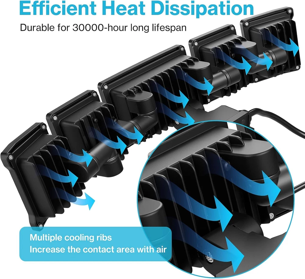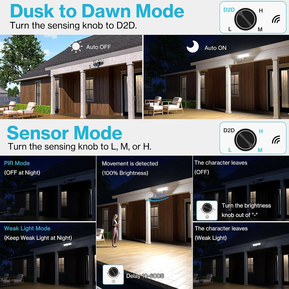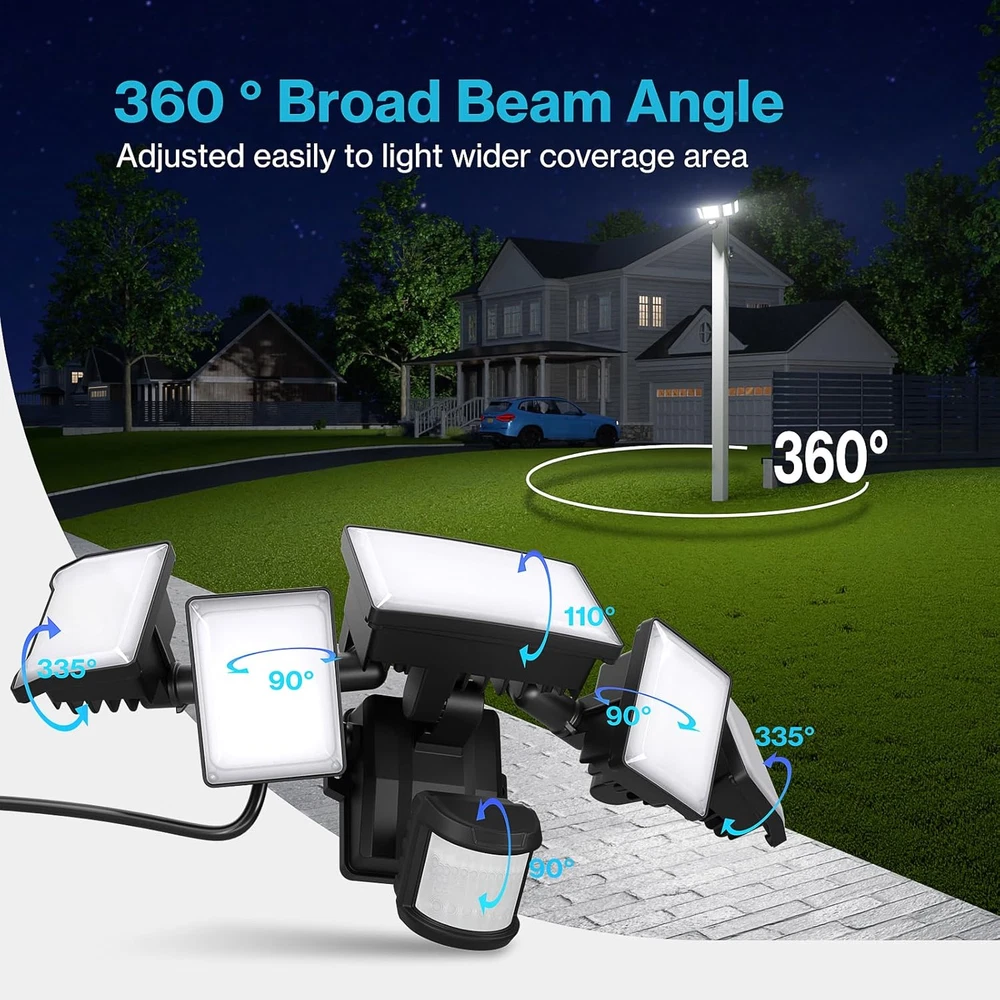 Super Bright & Energy Saving: 100 W outdoor LED flood light features 168 high-quality LED units, providing an impressive brightness of 10,000 lumens; It also saves over 80% on your electricity bill compared to a 500 W traditional halogen lights Plug and Play: This plug in motion sensor outdoor light is easy to install and power on with your outlet. No hardwire or junction box needed. It could be mounted on wall or eave with screws(included) Adjustable Motion Sensor: Easily change sensor range, Weak light brightness and time of sensor; The motion security light has up to 72 ft detection range, the stepless adjust timer can be set for tests modes or 10-600 s duration 4 Lighting Modes: Test Mode, Dusk to Dawn mode, Motion Sensor mode and Weak light Mode. Weak light mode allows light turn on at night and stay on 10%-30% brightness, turn to full bright if motion detected; You can freely switch modes to meet your diverse needs by swivel button Wider Illumination Range: Equipped with 5 adjustable heads, this flood light can be angled to suit your specific needs. Customize 360° beam angle, provides a wider lighting coverage, illuminating an area of up to 1977 ft² with ease. Optically designed filter, the light is softer and anti-glare, protecting the eyes of your family IP65 Waterproof: Plug in security light performs well in outdoor environment, like garage, deck, barn, backyard, porch, and front of house; Floodlights are reliable even in rain and snow Product Description More Information about Olafus Plug in Motion Sensor Outdoor Lights High Brightness The motion detector flood light can produce 10000 lumen of bright, cover 1977ft² area 5 Adjustable Lights 355° up and down, 90° side to side, reach 360° no dark gaps. Floodlight is directed to anywhere needed and easy to customize light coverage. Effective Heat dissipation The plug in flood light is made of die-cast aluminum and fin type structure, effective in dissipation. Ip65 Waterproof Plug in security light performs well in outdoor enviromnent and works noramlly even in rainy or snowy day. Easy to Install and No Electrician Needed Easy installation 4.92FT Cord 1 Motion Sensor Mode 2 Dusk to Dawn Modes 3 Weak Light Mode Wall Mount Eave Mount Garage Backyard Yard Swimming Pool Why does the flood light always on during the day? In test mode, turn on the dim mode and the light will stay on (10%~30% brightness) during the day. This function is to test whether each function of the floodlight is working properly. How to make the flood light turn off during the day? Please exit the test mode. (Turn button 1 counterclockwise to exit test mode)