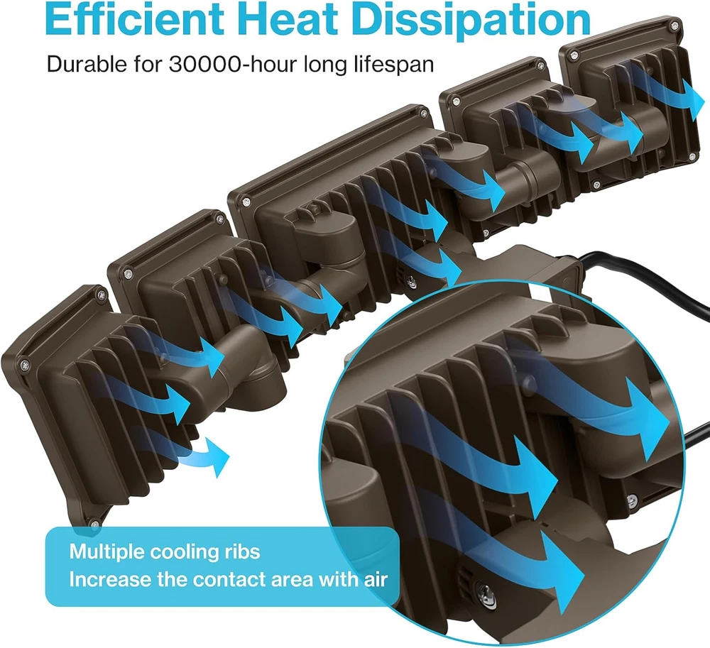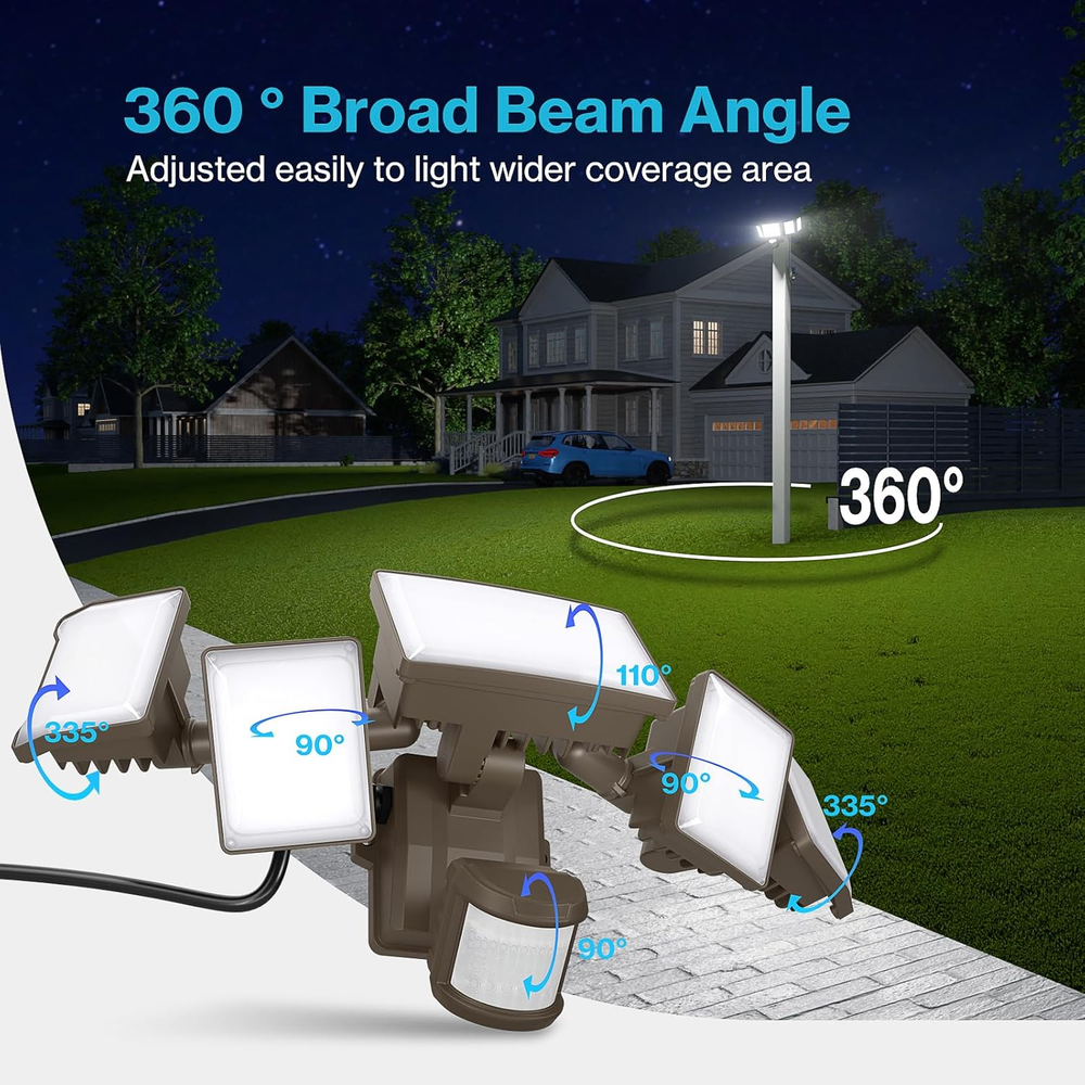 Super Bright & Energy Saving: 100 W outdoor LED flood light features 168 high-quality LED units, providing an impressive brightness of 10,000 lumens; It also saves over 80% on your electricity bill compared to a 500 W traditional halogen lights Plug and Play: This plug in motion sensor outdoor light is easy to install and power on with your outlet. No hardwire or junction box needed. It could be mounted on wall or eave with screws(included) Adjustable Motion Sensor: Easily change sensor range, Weak light brightness and time of sensor; The motion security light has up to 72 ft detection range, the stepless adjust timer can be set for tests modes or 10-600 s duration 4 Lighting Modes: Test Mode, Dusk to Dawn mode, Motion Sensor mode and Weak light Mode. Weak light mode allows light turn on at night and stay on 10%-30% brightness, turn to full bright if motion detected; You can freely switch modes to meet your diverse needs by swivel button Wider Illumination Range: Equipped with 5 adjustable heads, this flood light can be angled to suit your specific needs. Customize 360° beam angle, provides a wider lighting coverage, illuminating an area of up to 1977 ft² with ease. Optically designed filter, the light is softer and anti-glare, protecting the eyes of your family IP65 Waterproof: Plug in security light performs well in outdoor environment, like garage, deck, barn, backyard, porch, and front of house; Floodlights are reliable even in rain and snow Product Description More Information about Plug in Motion Sensor Outdoor Lights High Brightness The motion detector flood light can produce 10000 lumen of bright, cover 1977ft² area 5 Adjustable Lights 355° up and down, 90° side to side, reach 360° no dark gaps. Floodlight is directed to anywhere needed and easy to customize light coverage. Effective Heat dissipation The plug in flood light is made of die-cast aluminum and fin type structure, effective in dissipation. IP65 Waterproof Plug in security light performs well in outdoor enviromnent and works noramlly even in rainy or snowy day Easy to Install & No Electrician Needed Easy installation 4.92FT Cord 1 Motion Sensor Mode 2 Dusk to Dawn Modes 3 Weak Light Mode Wall Mount Eave Mount Garage Backyard Yard Swimming Pool
