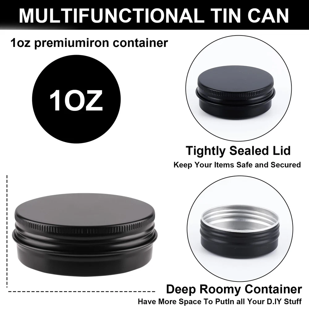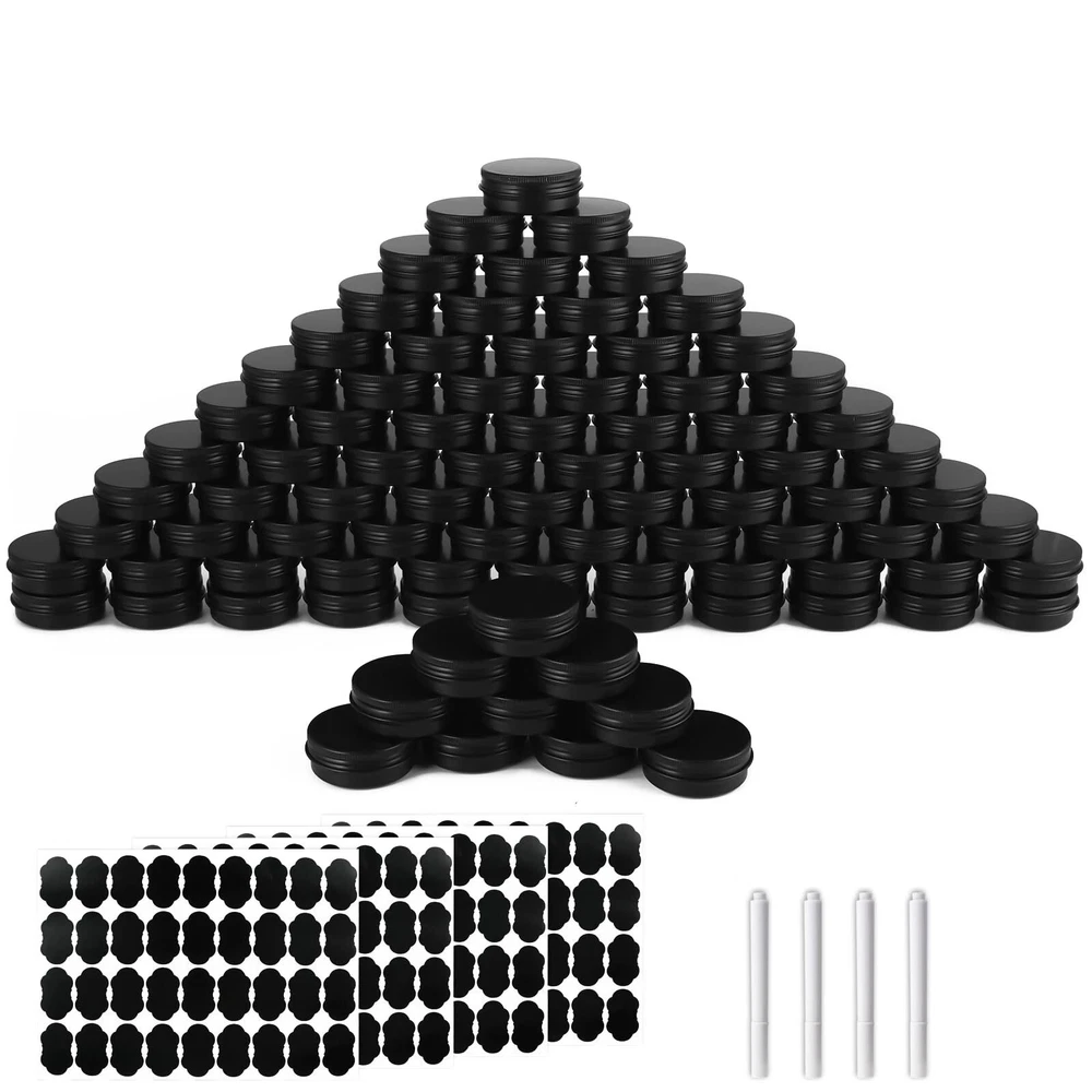 ABOUT US: is a professional company focus on people's real needs in life. After years of researching and concluding, we finally create this premium aluminum tins to meet your multiple needs. With food-grade material and superior craftsmanship, you can never go wrong with Package Contains:You will get 102 PACK with screw cap aluminum metal box, and 105 black stickers, and four erasable pens Capacity: 1 oz/30 ml, 2" diameter x 0.8" height ! SPECIFICATION: 1. Material: Aluminum 2. Capacity: 1 Oz 3. Color: Silver 4. Dimension (Diameter): 2 inches diameter * 0.8 inch height 5. Net Weight:1 ounces / 30 ml 6. Package Information: 102 x Aluminum Storage Cans Why Choose 's Metal Round Tins? - Premium material and superior craftsmanship, rust-proof, leak-proof, and durable. Can be used for several years. - Upgraded screw lid, easy to use. - Lightweight and compact, easy to store or carry around. - Multifunctional and suitable for various usages. WARM TIPS: ① The color may slightly differ from the picture mainly due to different light and monitors, please kindly understand. ② We provide 24-hour online customer service, please don't hesitate to contact us if you have any questions or suggestions and we will reach you at the soonest. 【Package Contains】102 aluminum tin cans with screw lids,4 pieces of white markers,105 pieces of black labels.Usage for salves/lotions 【Capacity/Small Gifts】Stores up to 1 oz/30 ml,Useful for storing many small items that you can also share with your family or friends 【Premium & Safe Material】Made of high-quality metal aluminum, the tin can is beautiful in shape, light in weight yet durable, Smooth surface ,can be labeled with small labels for easy identification. tins are perfect for storing homemade skincare products 【Sealing and Leak-Proof】The metal aluminum tin can adopts a tightly sealed screw twist lid structure, it can prevent liquid from leaking efficiently.The best gift for your friends or family who love making jars or cosmetics by themselves. 【Wide Application】- These empty aluminum containers are perfect be widely used to make candles or store DIY ointments, food storage, beard balms,DIY balm, cosmetic packaging, candy storage, and so on.