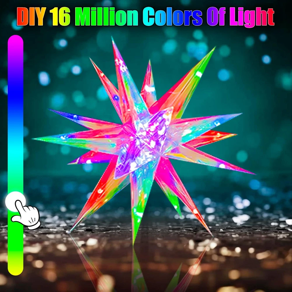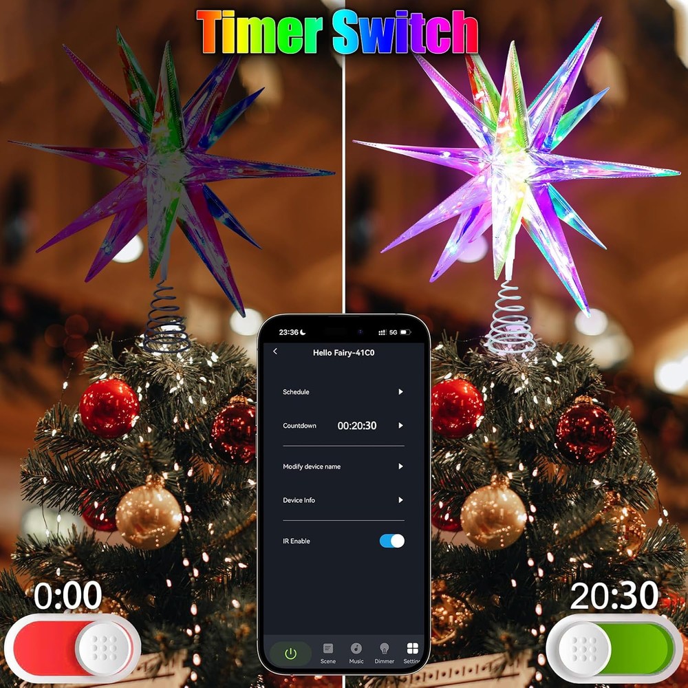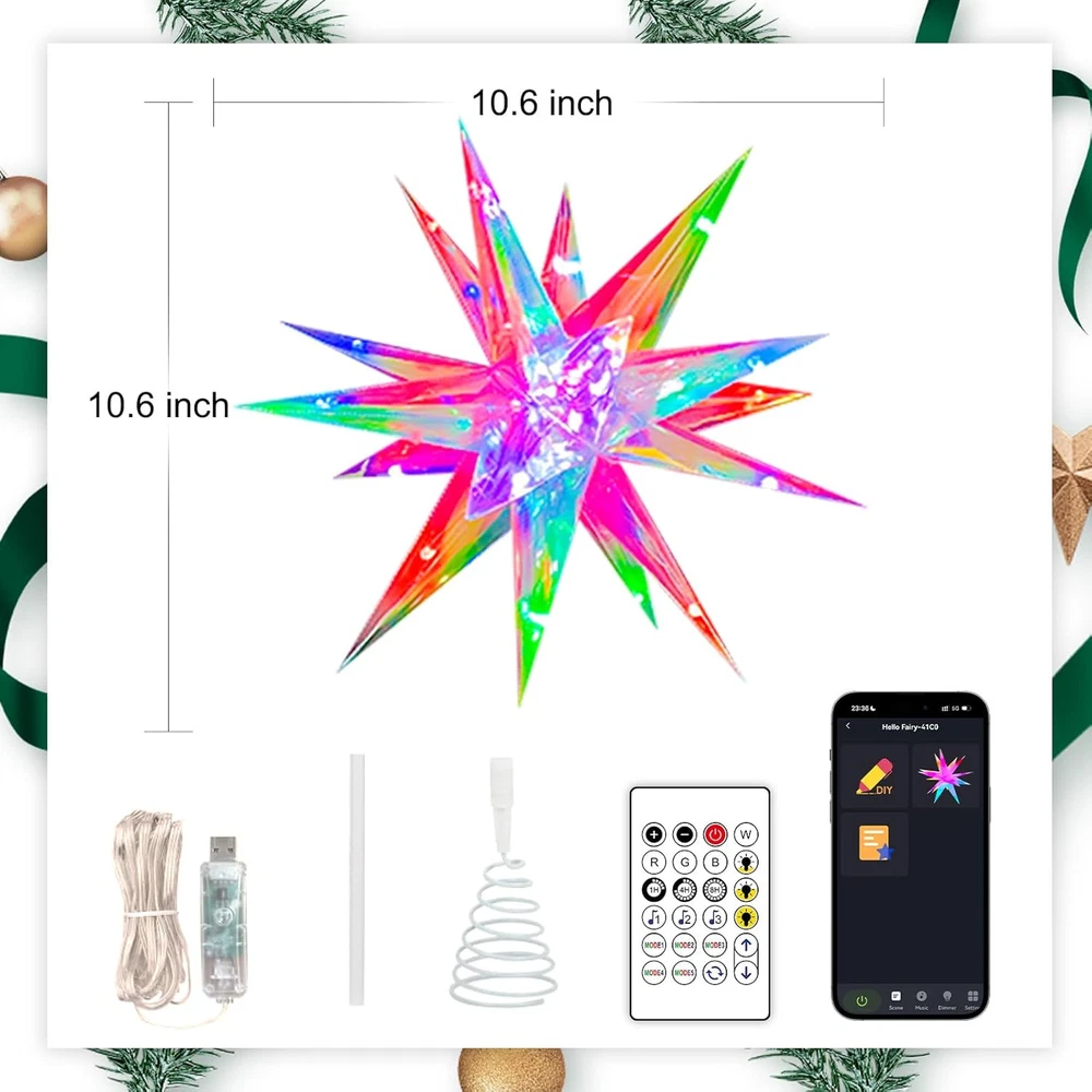 Christmas Star Tree Topper, 10.6" Smart Top of 18 Lights, Color Product Details Color: Color Material: Plastic Brand: TAOQQI Size: 18 Lights Occasion: Christmas Batteries Required?: Yes Theme: Christmas Product Dimensions: 8.6"D x 3.1"W x 8.6"H Recommended Uses For Product: Decorating Christmas tree Manufacturer: TAOQQI Item Weight: 9.1 ounces Item model number: 18 lights Batteries: 1 Lithium Polymer batteries required. (included) 【Best Decoration for Christmas】Our Christmas star tree topper is the perfect Christmas decor. The PET Magic Color Film and bright LEDs create a spectacular display. The film works wonders with light, producing a beautiful, shimmering effect. The LEDs are high-quality, giving strong illumination. The Christmas tree top star fits any tree size. They add elegance and festivity, making your tree the centerpiece. They fill your home with the Christmas spirit, making your holiday season more magical. 【APP and Remote Control】Our Xmas tree star is the best of both worlds with the App and remote control. The app, accessible within the Wi-Fi range, has an intuitive interface for easy adjustments. You can manage over 16 million colors, 80 scenes, and DIY mode. The remote allows quick on-the-spot changes. Whether you're on the couch or near the tree, you can control the lighting to create the perfect ambiance. 【Four Music Modes】Smart Christmas tree star topper has four music modes, these Xmas tree toppers are a delight. The lights sync with holiday melodies, creating a magical harmony. They dance and flicker rhythmically, adding an immersive touch to celebrations. Be it a slow carol or an upbeat tune, the Christmas tree topper the musical experience, becoming an entertainment focal point. 【High-Quality LED Lights & Timer Switch】The LED lights in our Christmas star toppers are premium. They're bright and energy-efficient, reducing your energy bill. Their long lifespan saves on replacement costs. With consistent brightness, the look is uniform. With this star lighted tree topper, you can adjust brightness for different occasions. Plus, there's a handy timing switch. Set on/off times for energy-saving and added user-friendliness. 【Easy to Install and Use】Installation is easy with clear instructions, and no special tools are needed. The controls, via app or remote, are user-friendly. You can quickly change settings. After the holidays, disassemble and store the toppers easily in a small space, protecting them for future use.
