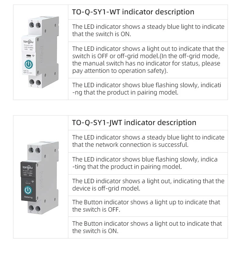 Features: Remote control at anytime from anywhere by TUYA / Smart Life app on mobile ,no distance limit. Schedule /Timing, countdown, cycle timing & metering function Voice control by Amazon Alexa echo dot / Google assistant / Yandex Alice Loop Timing/real-time monitoring Of electricity consumption (In TO-Q-SY1-JWT) Parameter: Working voltage:AC90-280V,50/60Hz Current type:63A(Suggest under 40A) Wireless type:Wi-Fi 2.4GHz Support system:Android\iOS Notice: Wiring: Power must enter from the top and must be Live line + Neutral Line (L+N). It has NO overcurrent protection, can not set current ,voltage in APP.
