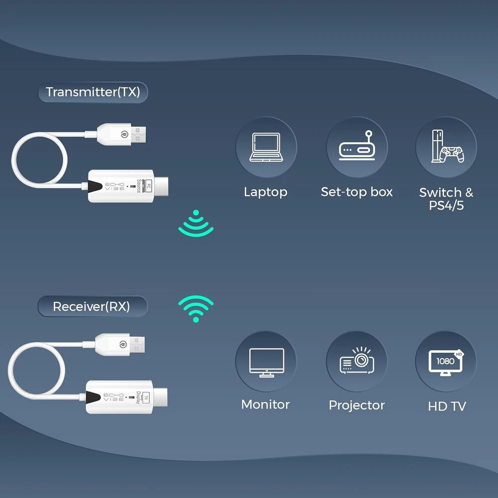 Sleek Pocket-Sized Design: The Echo Vibe HDMI wifi extender kit features an elegant, modern design with pocket-sized dimensions, making a wonderful on the go companion. Hassle-Free Installation: Unlike similar products on the market, this laptop monitor extender comes with a user-friendly plug & play design, requiring no complicated installation or Bluetooth connections. Simply connect the interface and USB power supply, and you’re ready to go! Enhanced Compatibility: This HDMI wireless transmitter and receiver works with all operating systems, provide wide compatibility with most HDMI devices. Suitable for PC, laptop, monitor, gaming consoles, TVs. Mirrors and Extends: The Echo Vibe laptop monitor extender has a dual function, doubling as a transmitter and receiver, providing superior 1080P @ 60HZ crystal clear images on large screen devices. Use the mirror mode and the extend mode depending on your custom needs. Superior Signal Range: This wireless video transmitter and receiver has a powerful wireless chip which amplifies signal to a range of up to 98 feet, ensuring an uninterrupted connection and smooth streaming. Buyer pays actual USPS shipping cost.