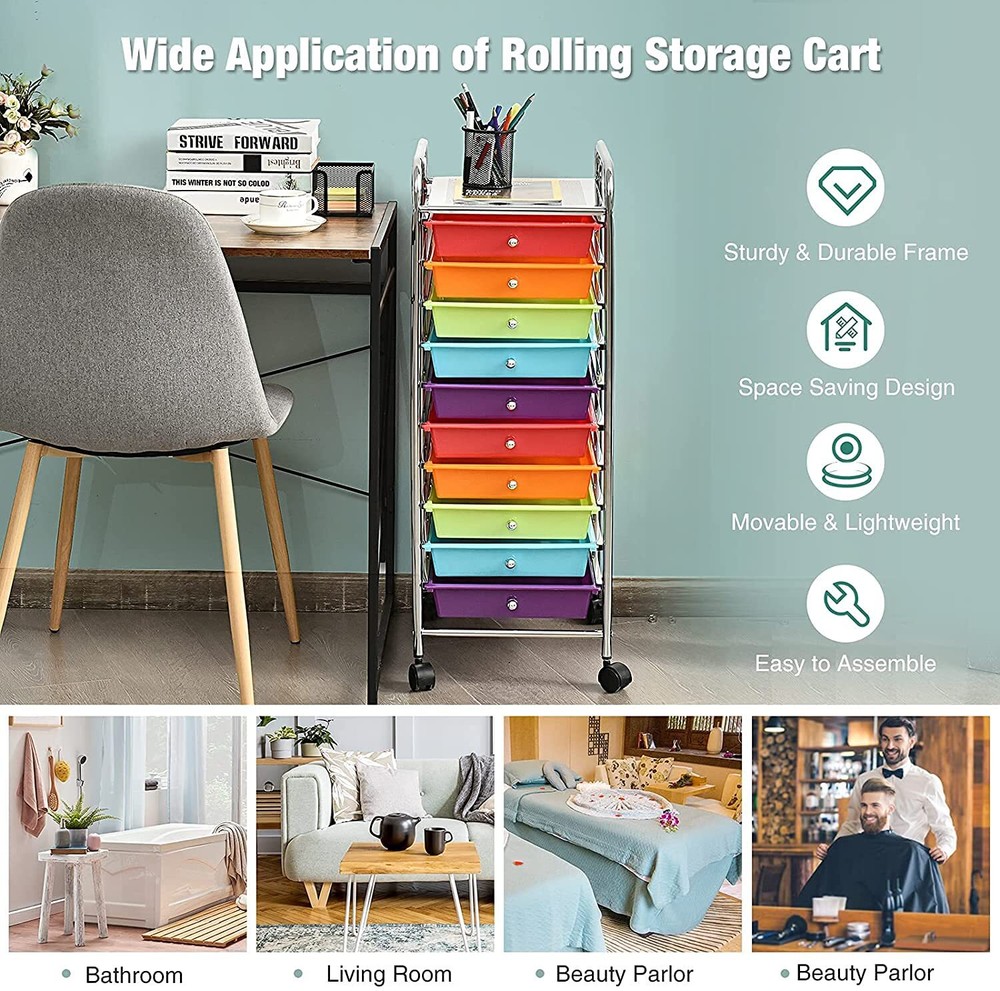 Our rolling storage cart includes 10 drawers, which provide enough storage space. It is Ideal to arrange your different stuff at Office, Home, School and Garage Or Just About Anywhere Organization Is Needed. Made of Chrome Steel Framed and plastic Drawer Organizer, this 10-drawer rolling cart is durable enough to serve you for a long time. Four universal wheels will help you move it easily. Do not hesitate, to buy ! High quality and brand new. 10 moveable drawers for storage. Steel frame and plastic drawers, durable and can serve your for long time. 4 universal wheels(2 with locks) for easy movement and fixation. Drawers slide through metal channels with no resistance. Private, polypropylene drawers protect drawer contents from peeping eyes.