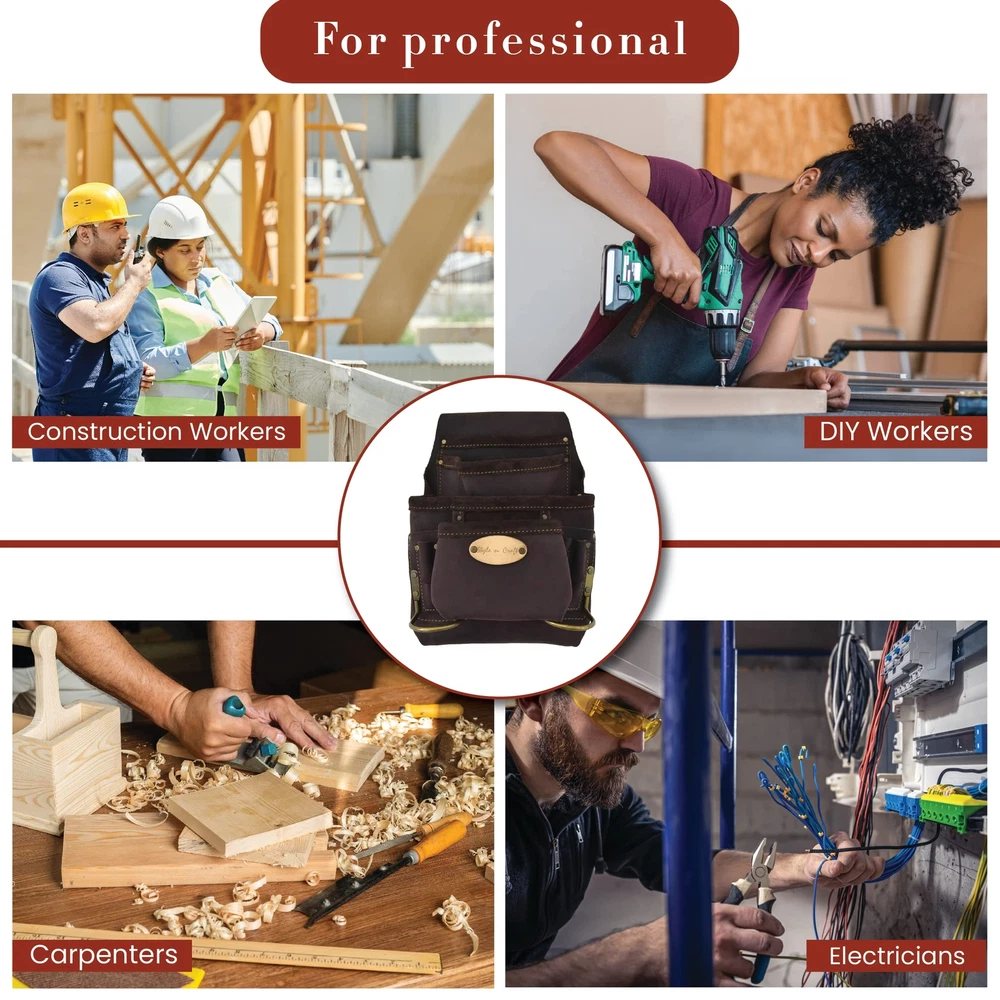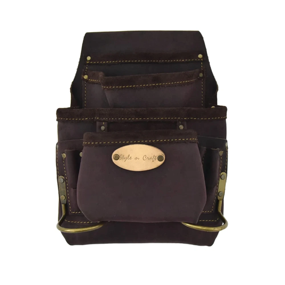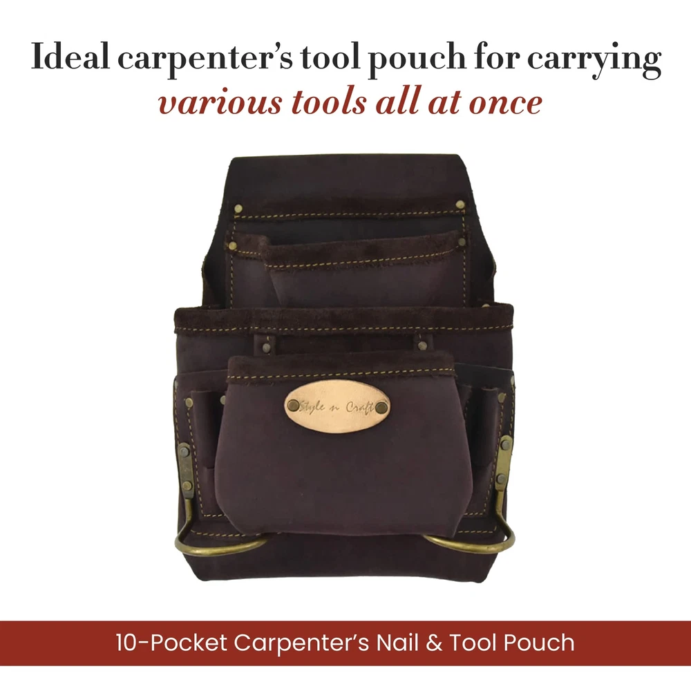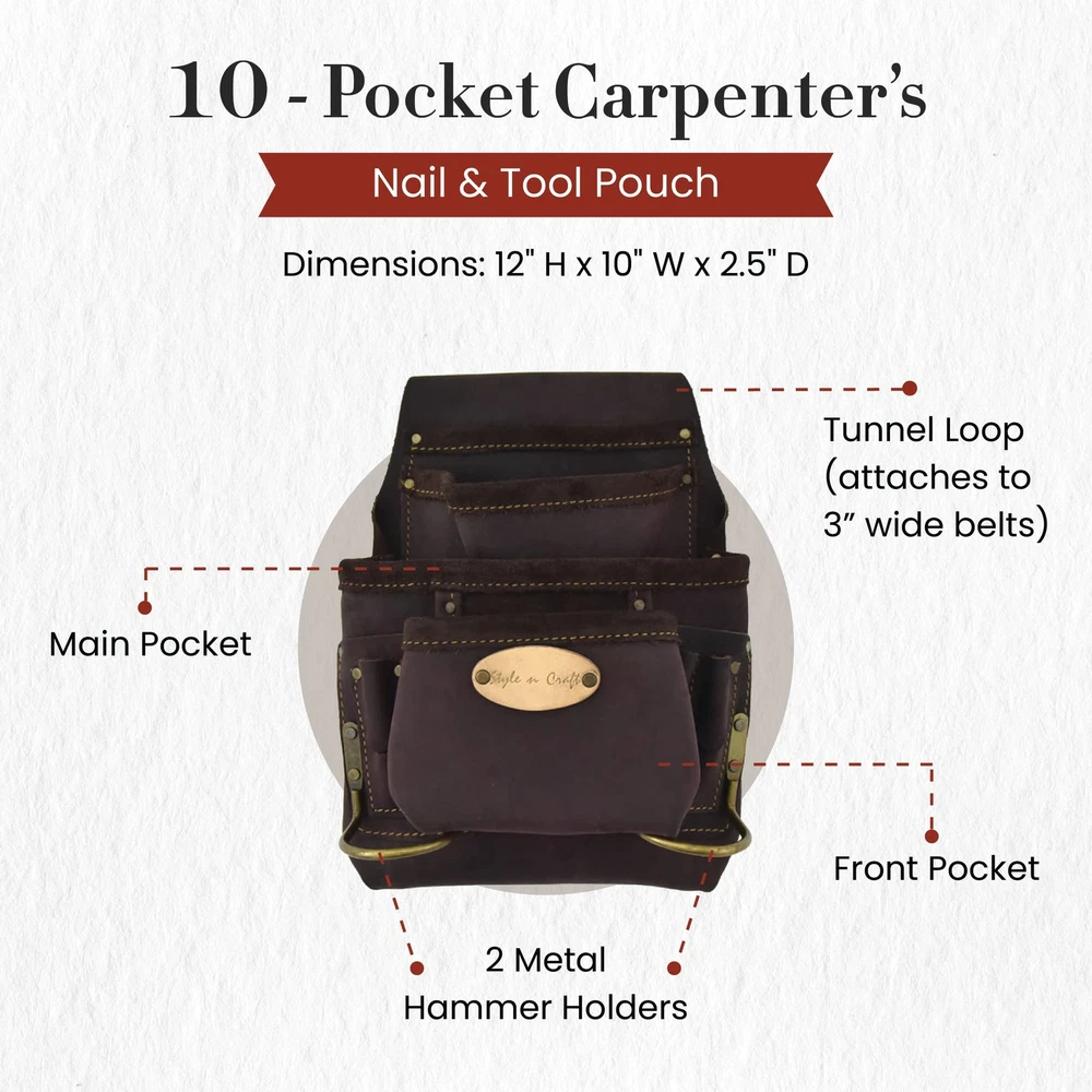 Product Description Stylish and durable, switch to the 10-Pocket Carpenter’s Nail & Tool Pouch now! This tool pouch is made with full-grain oiled leather and features heavy-duty nylon thread contrast stitching that offers extra strength and a stylish appearance. Our carpenter’s tool pouch features reversed main and front pockets for extra storage capacity and will keep your tools, including screwdrivers, chisels, nail sets, pencils, and clamps, among others, protected. The leather pouch is also equipped with 2 metal hammer holders. Reinforced with rivets, our carpenter’s tool pouch is reliable and safe to use. The leather tool pouch comes in brown color, with all its hardware featuring an antique finish. 10-Pocket Carpenter’s Nail & Tool Pouch measures 12" H x 10" W x 2.5" D. Our carpenter’s tool pouch fits belt sizes up to 3” wide and stays intact during your working hours. So forget worrying about your tools falling off or your tool belt sagging while you work. From the Manufacturer 10 pocket nail and tool pouch in heavy duty top grain oiled leather; Contrast stitching with heavy duty nylon thread; Metal hammer holders; Rivets with caps for safety; All hardware in antique finish; Fits belt size up to 2-3/4-Inch wide. Carpenter’s Tool Pouch: Tool pouches can be both stylish and durable. presents a full-grain oiled leather nail and tool pouch for carpenters that features heavy-duty nylon thread contrast stitching for extra strength and a stylish look Spacious: Our Carpenter’s Nail and Tool Pouch features reversed main and front pockets for extra storage and will keep your tools, including screwdrivers, nail sets, and pencils, among others, protected. The leather pouch also has 2 metal hammer holders Leather Pouch: Reinforced with rivet caps and high-quality material, this carpenter’s tool pouch is made with your safety and comfort in mind. Featuring an antique finish on all hardware, the pouch comes in dark brown color Belt Size Fit: Our carpenter’s tool pouch fits belt sizes up to 3” in width and stays in place while you work. With this leather tool pouch, you will not have to worry about your tools falling off or your tool belt sagging Dimensions: 10-Pocket Carpenter’s Nail & Tool Pouch measures 12" H x 10" W x 2.5" D