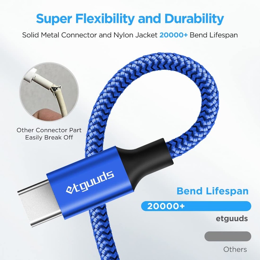 etguuds USB Type C Cable 10ft Fast Charging, 2 Pack Nylon Braided USB A to USB C Charger Cord Compatible with Samsung Galaxy A10e A20 A50 A51 S23 S22 S21 S20 S10 S9 S8 S10E, Note 20 10 9 8, Moto G7 G8 Product Name: USB-A to USB-C Charging Cable Brand: etguuds Color: Blue Length: 10Ft 2Pack Fully Compatible with Devices For Fast Charging(Partial List) -Samsung Galaxy S10 S10+ S10e S8 S9 S8+ S9+ Note 8 Note 9 Note10 A10e A20 A30 A40 A40s A50 A80 A70 A60 A9 A9, A5/A7 (2017), A8/A8+ (2018) -Moto G6 G6 plus Mote G7 G7 Plus G7 Power Moto Z Z Play Moto Z Force -SONY Xperia1/ XZ Premium SONY XZ1 XZ2 XZ3 XZ2 SONY Xperia XA1 XA2 Ultra -LG G5 G6 G7 One G7 G8 ThinQ V30+ V30 V20 V35 -HTC 10 U11+ U12 + Compatible Devices For Limited Charging Speed -Lumia 950/950 XL, Nexus 5X 6P -Google Pixel 2 / XL -OnePlus 3 2 3T 5T 6T -And other Type-C devices WARM NOTE TYPE C CABLES DO NOT WORK WITH MICRO USB DEVICES OR IPHONE! ONLY FOR Type-C Devices! Other 2 basic condition for fast charging Pls confirm your phone and USB adapter (or other recharged devices ) support fast charging,meet QC2.0 QC3.0 standard. 2 IN 1 Function -Charging speed up to 3A,this allow you to charge your phone in the fastest way. -Data transfer Sync, speed up to 480Mb/s,this allow you to download an HD movie or 1000 songs every 5 seconds. Nylon Braided Material and Connector with premium aluminum housing -Adds strong military fiber which can bear 10000+ bending test,Tangle-free nylon braided jacket make our type-c cable more durable,flexible and sturdy! -Seamless molded joint provide reliable conductivity and stability.Reversible connector can be plugged in both ways for your convenient charging! etguuds provide quality pre-sales and after-sales service.If you have any question,please be free to let us know.We would like to provide satisfied solution to you. 【QC3.0 FAST CHARGING & DATA-SYNC】: This 10ft/3m super long cables supports safe high-speed charging 4.2A and data syncing speed up to (480Mb/s). 56kΩ resistor provide outstandingly reliable conductivity &stability and protect your devices and charging adapters from damage. 【DURABLE & HEAVY DUTY】Integral Seamless stretch process, high pressure resistance. Aluminum alloy shell by micro-arc oxidation process makes the shell surface harder and more wearable. Nylon braided with a tested 10000+ bend lifespan,more durable with best price for long life usage. 【REVERSIBLE CONNECTOR】etguuds USB C cable keeps up with the latest trend of USB interface. The user-friendly design allows you to plug into all USB Type-C compatible devices without worrying about the orientation of the port. (Pls Note: This is not Micro port or iphone port) 【WIDELY COMPATIBILITY】:etguuds 10ft USB Type-C cables fast charging well compatible with Galaxy S23 S23+ S23 Ultra S22 S22+ S22 Ultra S21 S21+ S21 Ultra S20 S20+ S20 Ultra S10 S10e S10+ Plus 5G S9 S9+, Note 8/9/10/10+ Plus 5G/20, A10e A20 A30 A40 A50 A51 A60 A70 A80 A90 A91, A9/9s A9 Star A8s(2018)C9 C7Pro C5Pro. G5 G6 V60 V50 V35 ThinQ Stylo 4 5 6. G7/G7 Plus/ G7 Power/G6 /G6 Power/G6 Plus Z Z3 Z4, Mo-toG9 G8 G7/G Stylus/G Power/G Fast/G Play, Pixel 2 3 3a 4 4XL 5 5a 6 6a 7 etc. 【QUALITY PRE-SALES】We reply issue during 24hours and provide satisfied solution in time. Shipping from the USA All of our products are shipped from the USA, ensuring quick delivery to your destination. Payment We offer the following payment methods: PayPal, credit card, bank transfer, and eBay's secure payment system. Free Shipping & Free Returns Shipping within the USA is FREE. Additionally, any return is absolutely free for you. Risk-Free Purchase You have the option to return an item within 30 days without any justification. We cover the return shipping costs! Fast Shipping We ship immediately upon receipt of payment. Generally, the package is delivered within 2-3 days in the USA. If it takes longer, we will contact you. Quality and Costs Made in Europe, USA, China No customs fees or additional charges Total satisfaction guarantee Invoice with declared VAT available upon request in .pdf format Feedback Your feedback is very important to us. After you pay for your purchase, you will automatically receive positive feedback from us.