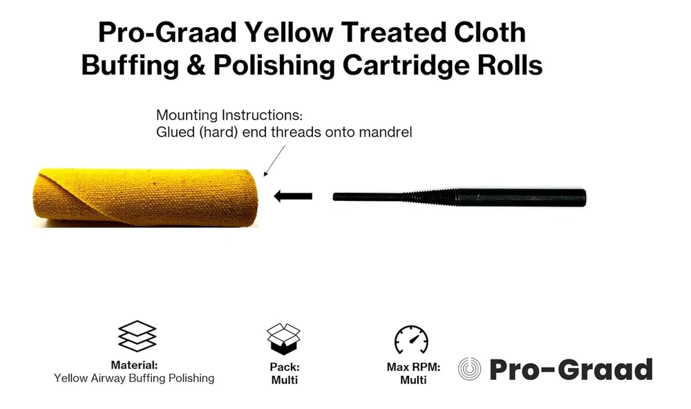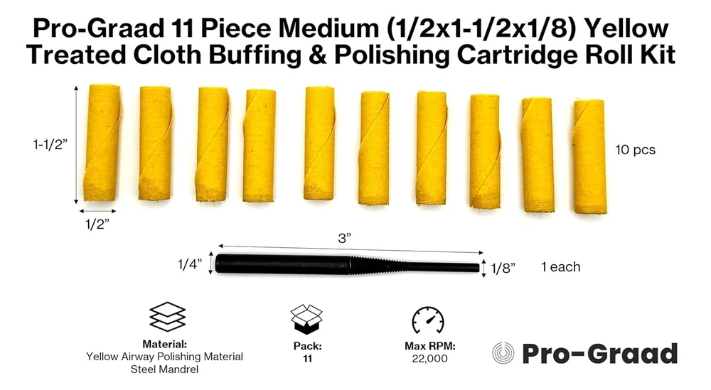 Store New Arrivals Add to Favorite View Feedback Contact 11 Piece Medium (1/2X1-1/2X1/8) Yellow Treated Cloth Buffing & Polishing Cartridge Roll Kit, Ideal for Detail Polishing Hard to Reach Areas, Includes 1/4” Shank Mandrel Description Item dimensions L x W x H 1.5 x 0.5 x 0.1 inches Product Dimensions 1.5 x 0.5 x 0.1 inches; 1.76 ounces Material Aluminum Oxide Country of Origin China Grit Material Yellow Airway Buffing Polishing Grit Type NOTE: Mounting Instructions: Glued (hard) end threads onto mandrel. Brand Pro-Graad Manufacturer Pro-Graad [IN THE BOX]: Includes 10 Small Size (1/2x1-1/2x1/8) Yellow Treated Cartridge Rolls for buffing and polishing, and 1 each 1/4” Shank Mandrel, ensuring a high-quality and professional finish. NOTE: These yellow cloth rolls are specifically designed for use with liquid or bar style buffing compounds (not included) to achieve best performance and results. The Pro-Graad 11 Piece Yellow Treated Cartridge Roll Buffing Polishing Kit offers a comprehensive solution for buffing and polishing tasks, featuring 10 pieces 1/2x1-1/2x1/8 Yellow Treated Cartridge Rolls and a 1/4” Shank Mandrel. Designed for use with liquid or bar buffing compounds (not included), these rolls ensure high-quality and professional results. Crafted from the same material as yellow airway buffing and polishing wheels, they deliver consistent performance. The rolls are durable and self-renewing by tightly wrapping yellow treated polishing cloth around a cylindrical core for long-lasting use. With a focus on precision and performance, the straight cylinder style of the rolls enables effective polishing in recessed and hard-to-reach areas, catering to both cut and coloring buffing and polishing applications. Their unique design guarantees consistent finishes on inside diameters, making them versatile tools for all polishing needs. Mounted on the included cartridge roll mandrel, these rolls provide superior performance, with no detail too small to polish. Ideal for accessing small, intricate spaces, they ensure a professional finish every time. NOTE: Mounting Instructions: Glued (hard) end threads onto mandrel. ABOUT US We offer the best prices around on high quality products. Our E-store includes media such as books, movies, music and games while offering electronics, toys, sporting apparel, clothing, tools, general home, garden items and more. SHIPPING We are always working hard to ensure your package arrives as soon as possible. Please understand that some factors like weather, high postal traffic, and the performance of shipping companies are outside of our control. We offer free shipping to the lower 48 states and ship within 2 business days of payment, usually sooner. We do not accept P.O. Boxes. Please provide a physical address. RETURNS We offer a 30-Day Return Policy on items which you are not completely satisfied with. You have the option for a full-refund or an exchange of the item. No returns are available on items shipped outside of the USA. PAYMENT We accept PayPal. CONTACT US This page content is yet to come Please ad us to your favorite seller and visit again later Thank You CUSTOMER SATISFACTION We try our very best to make sure every customer is completely satisfied. If there's a problem, message us! We're happy to help.