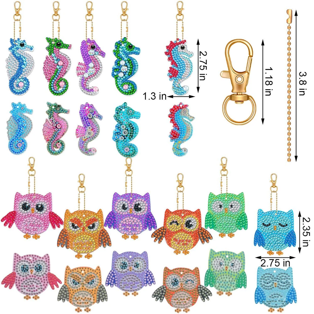 11 Pieces diy diamond painting keychains full round drill 5D diamond painting pendant owl and sea horse shaped diamond painting pendant ornaments for art craft, key ring, phone charm, bag decor Feature: Cultivate your ability: These diamond painting keychains allow you to diy sweet presents by yourself, enable you experience a sense of achievement, learn to reduce stress, emotional adjustment, enhance self-confidence and perseverance, cultivate your hands-on ability, color match recognition, coordination and so on, brighten up your leisure time. Wide applications: Ideal pendant decoration for car keys, mobile phones, wallets, handbags, backpacks or other items you want to decorate, good accessories for parties, anniversary, birthday, Christmas, Thanksgiving Day, Mother's Day, graduation or any other festivals. How to diy: 1. Peel off the protective film of the product. 2. Find the same diamond number according to the list of canvas and place these diamonds on a plate. 3. Put the clay on the diamond drill pen. 4. Use the diamond drill pen to paste the diamond and then paste in the corresponding diamond number. 5. Use a book or your hands to press the diamond to make it more stably. Specification: Material: PVC Pattern: owl, sea horse Color: assorted colors Package include: 11 x Diy diamond painting keychain 2 x Plate 2 x Diamond sticky pens 2 x Clay Note: Please do not fold the canvas to avoid crease. Small and inedible items included, please keep away from little kids to avoid accidental ingestion. Manual measurement, please allow slight errors on size. The colors may exist slight difference due to different screens. Adorable animal pattern: these diamond painting keychains feature three-dimensional beauty and dazzling luster, designed with cute animal patterns like owl and sea horse, various expressions and postures modeling looks vivid and delicate, can be served as nice ornaments to adorn your phone, bag, art crafts and more Durable and reliable: the diamond painting pendant is made of PVC plastic material, durable and waterproof to use, the adhesive is sticky enough to pick the rhinestones up, not easy to fall off, no color fading and not easy to break, durable for long-term use Enjoyable diy process: you should firstly prepare the necessary drill tools on a smooth and neat table, then stick a small amount of clay in the drill pen tip, use the pen to stick the diamond and paste into correct place according to corresponding diamond color number, finally use the key chain to buckle the finished diamond painting mould, easy to complete a beautiful diamond painting keychain Applicable occasions: these adorable diamond painting keychains can be attached to your keys, schoolbags, pencil cases, smartphones, manual crafts, handbags, backpacks and wallets, nice decorations to add charms and vitality to your personal items Complete diamond painting kit: you will receive 11 pieces diamond painting keychains in 2 styles, 2 pieces of plates, 2 pieces of drill pens and 2 pieces of clays in this package, complete diamond painting kit to satisfy your use and replacement