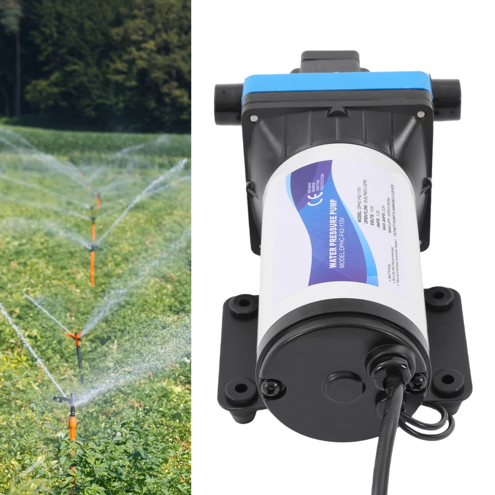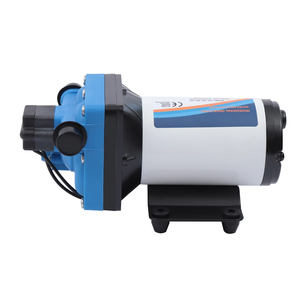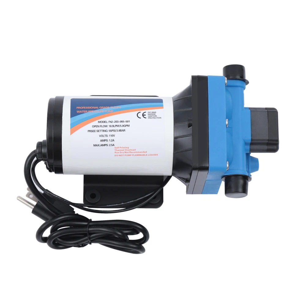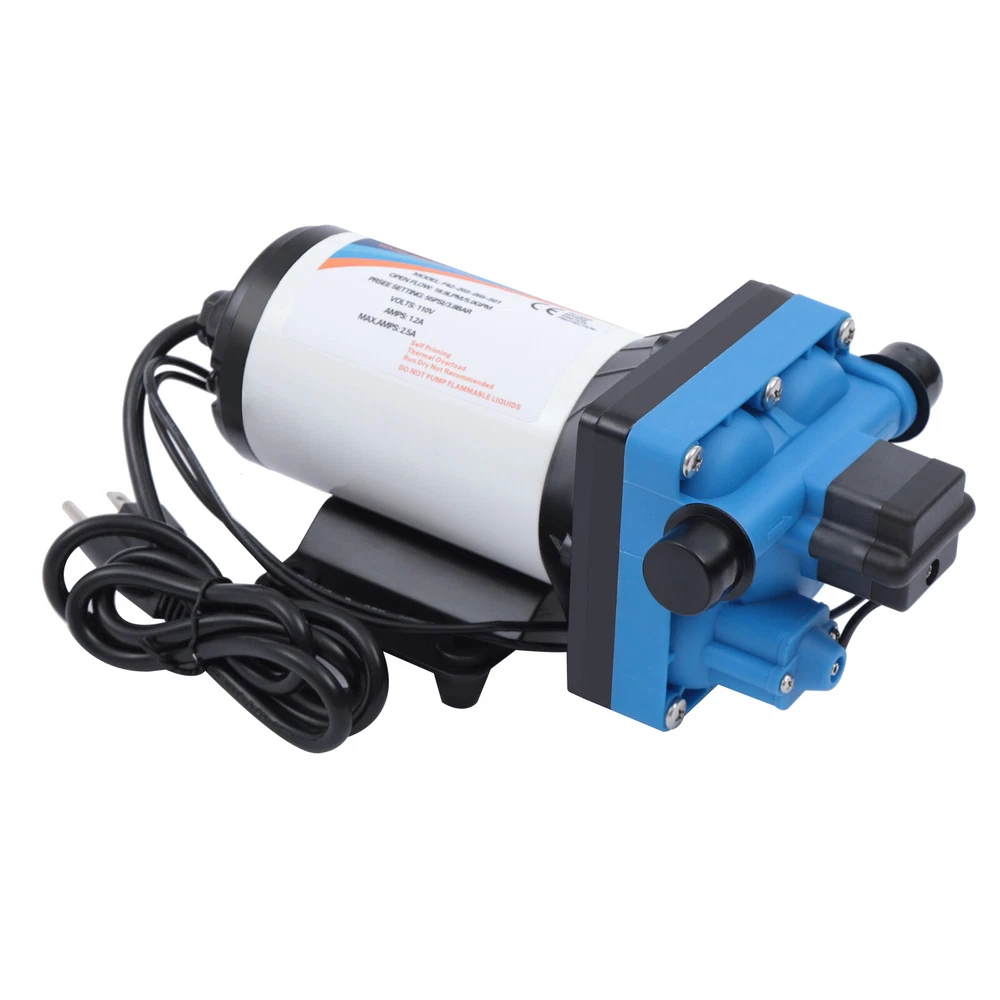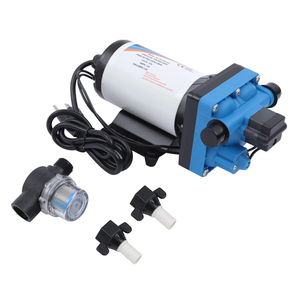 110V Self Priming Water Pressure Diaphragm Pump 55 PSI for Home/Caravan/Marine Description Self Priming Water Pressure Diaphragm Pump 18.9L/min 55 PSI Caravan/Marine Description If you are looking for a high flow, high efficiency, portable and durable high-quality water pump to help pump water, you can't go wrong with our professional water pump. This water pump uses a pure copper motor to provide it with powerful and stable power. With a rated head of 124.67 feet, it can water farmland and vegetation over long distances, saving time and effort on manual transportation. The pump's 4.99 GPM flow rate makes pumping water even faster. Key Features High-quality Materials : The water pump's body is made of engineering plastic, while the valve is made of EPDM. The excellent anti-aging and corrosion resistance of engineering plastic and EPDM make this pump strong and durable. Automatic Start/Stop : The water pump features an automatic start/stop design, which allows the pump to turn on/off automatically when you turn the faucet on/off. The auto start/stop design is easy to operate and reduces power consumption. Pure Copper Motor : The coil of the motor is made of pure copper, which is more stable and durable because it has less resistance compared to aluminum. Remote Irrigation : With a maximum head of 124.67 feet, the water pump can water farmland and vegetation over long distances, saving time and effort in manual transportation. Sturdy and Durable : The water pump features a built-in bypass return design. When the actual flow rate used is less than the pump output, the pressure relief cycle is activated. This effectively protects the pressure switch to extend the product's life. Standard Fittings : The water pump uses 1/2" standard fittings to fit most equipment sizes. This is easy to install and use. Adjustable Pressure : The automatic pressure switch has an adjustable range of 2.20-9.03 lbs. This adjustable automatic pressure switch can be applied to more scenarios. High Safety : The water pump is equipped with overheat and overload protection. When the pump generates too much heat or overloads, the pump will automatically disconnect the circuit. Such a good protection design greatly enhances its safety in use. Easy to Carry : The water pump's 6.17 pounds weight and compact size make it very easy to carry and use. Details Iron Plate Mounting Feet : The water pump's mounting feet are made of iron, which is strong and durable. The iron mounting feet can significantly reduce the working noise and improve the working environment. Moreover, the surface of the iron plate is galvanized, which makes it less likely to rust and corrode. Filter : The filter can effectively filter out debris and other particles from the pump. And its detachable design makes it easy to clean and assemble. PA Pump Head : The head of this pump is made of PA, whose excellent toughness and fatigue resistance can extend the service life of the pump. Arrow Indication : The surface of the water pump is equipped with an interface arrow indication, which makes it easy to connect external equipment. Interface Protective Cover : The water pump is equipped with a protective cover at the interface, which can effectively protect the interface from being damaged in transit. Application The water pump is suitable for filling equipment, agricultural irrigation, dishwashers, spray equipment, etc. Specification Pump Body Material: Engineering Plastic Color: Blue Valve Material: EPDM Diaphragm Material: TPE Pump Head Material: PA Valve Seat Material: POM Plastic Voltage: 110V Current: 2.5A Power Frequency: 50HZ Rated Power: 275W Connection Method: Thread Voltage Fluctuation Range: +-10% of rated value Volume of Solid Impurities In the Medium: <=0.1 Media Containing Solid Impurities In the Particles: <0.2mm/0.004in Stop Pressure: 55PSI/3.8BAR Control Mode: Pressure/Return Switch Wiring Method: Double-core Wire Ambient Temperature: Less than or Equal to 50℃ Medium Temperature: 0-65℃ Medium PH: 5.0-10 Rated Flow Rate: 18.9L/min Rated Head: 38m/124.67ft Inlet Size: 1/2in-14 Male Threaded Interface Pressure Adjustment Range: 1-4.1kg/2.20-9.03lbs Product Size: 23.3*12.6*10.9cm/9.2*5*4.3in Package Size: 29.9*14.6*12.8cm/11.77*5.74*5.03in Net Weight: 2.80kg/6.17 lbs Gross Weight: 2.84kg/6.26lbs Pressure Switch Adjustment Method 1. Open the pressure switch cover with a screwdriver. 2. Locate the internal hexagonal screw hole in the center of the switch. 3. Turn it clockwise to increase the pressure, and counterclockwise to decrease the pressure. Operating Instructions 1. Connect the pump with the inlet and outlet pipes, and make sure that the inlet and outlet pipes are tightly connected, otherwise, it will cause low pressure, no water suction, water leakage, and other problems. 2. Install a filter at the inlet end. The density of filtration is better than 50 mesh. 3. The pump is connected to the power supply, and the output parameters of the connected power supply must meet the input requirements of the motor. 4. Turn on the power, and the pump starts to run out of water for 5-10 seconds. Drain the air in the pump and pipeline. When the water is stable, turn off the power temporarily. Then connect the water gun, faucet, shower, and other related tools. 5. When you stop using, just turn off the water outlet faucet. The water pump has a pressure switch automatic start/stop function. You just open the faucet for the next use. Package Included 1*Water Pump 1*Strainer 2*Connectors Notes 1. When the pump is working, it is necessary to ensure smooth drainage of the pump to avoid holding the pump and causing damage to the pressure switch. 2. If you hear the switch ticking in operation, please turn off the pump immediately and adjust the pressure appropriately. 3. The motor has a slight waterproof function, splashed with a little water do not need to worry too much (dry can be), but the pump motor is strictly prohibited to immerse in water. If the pump
