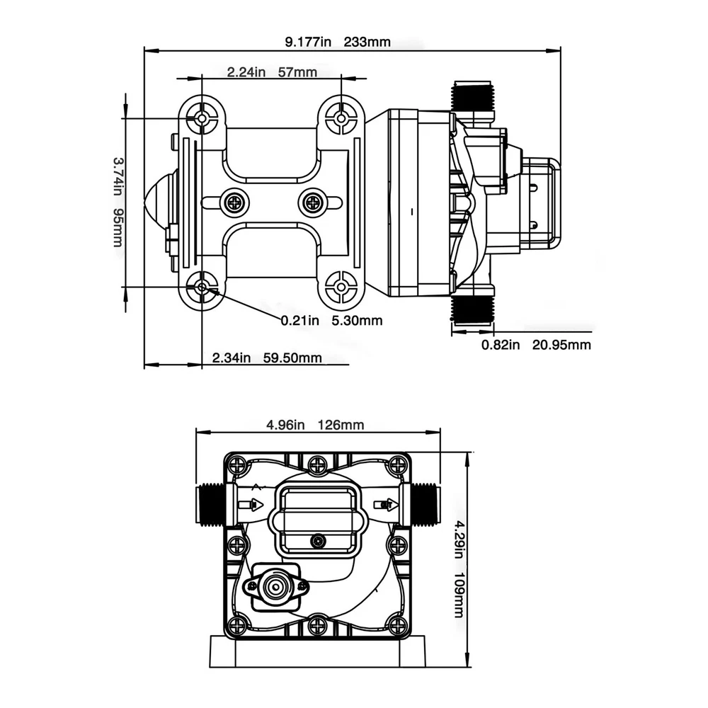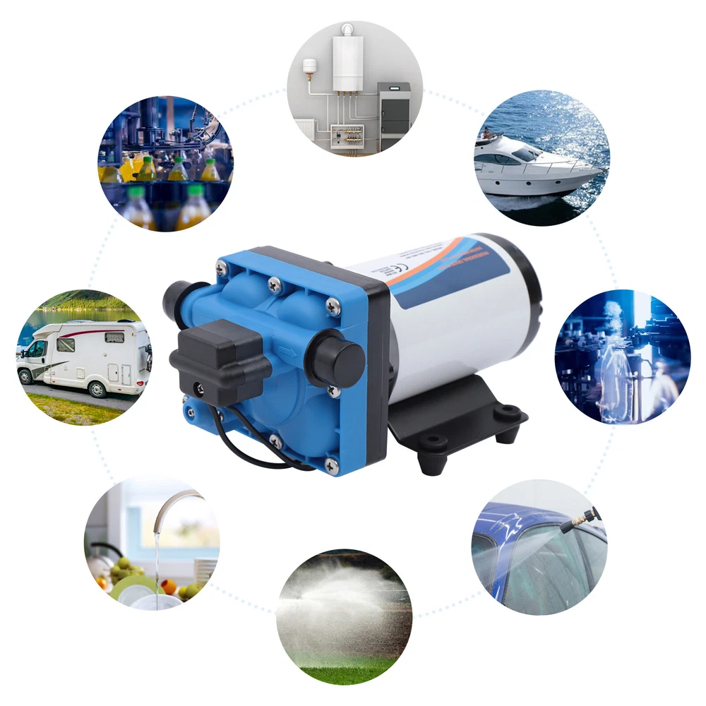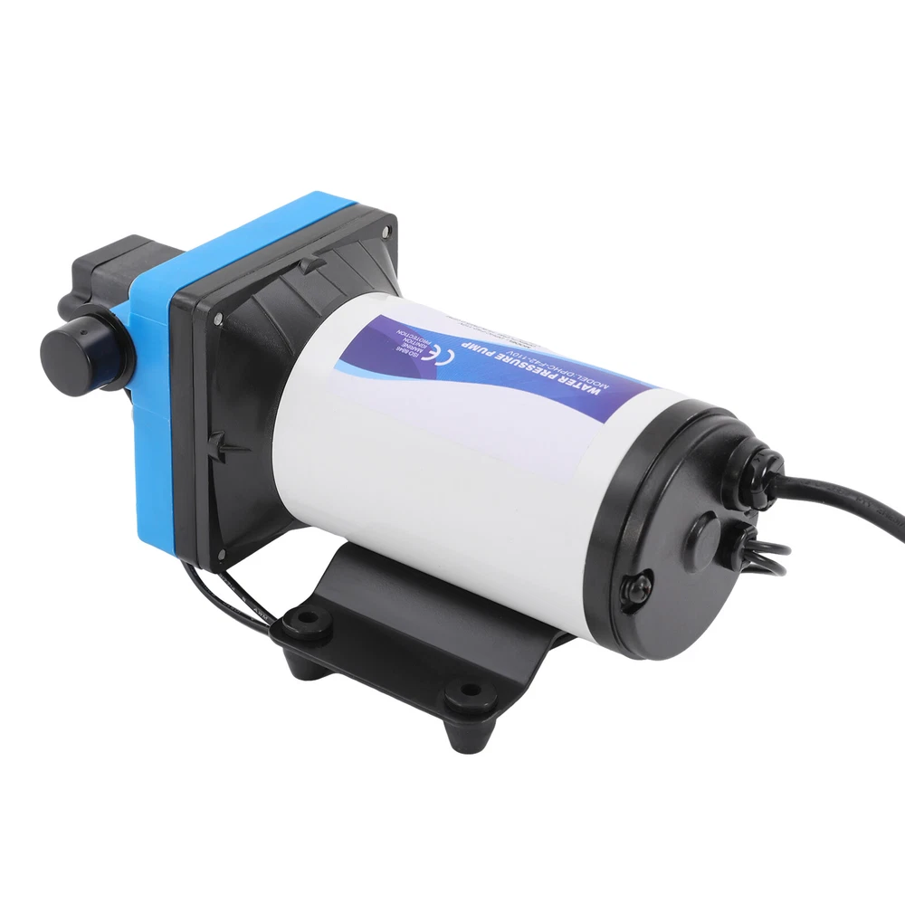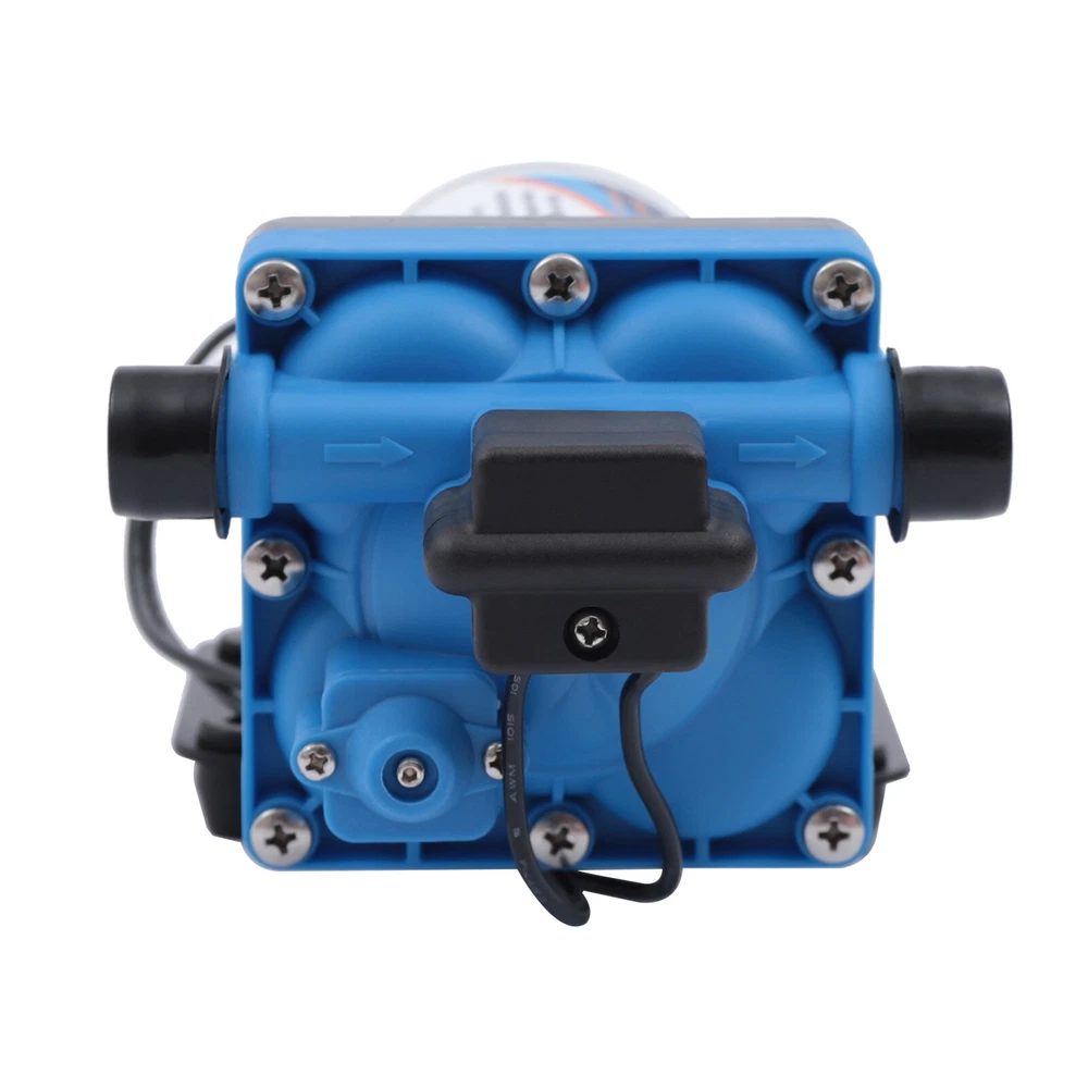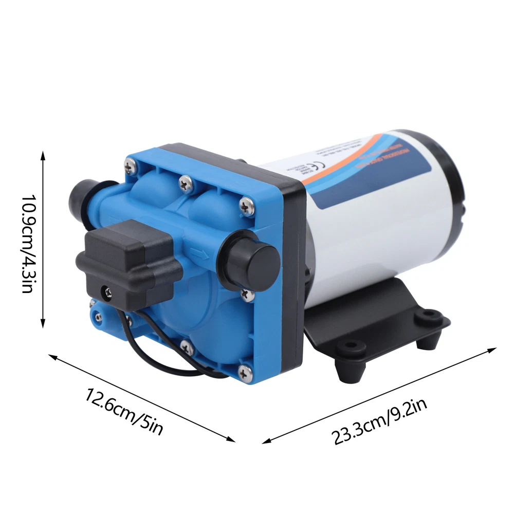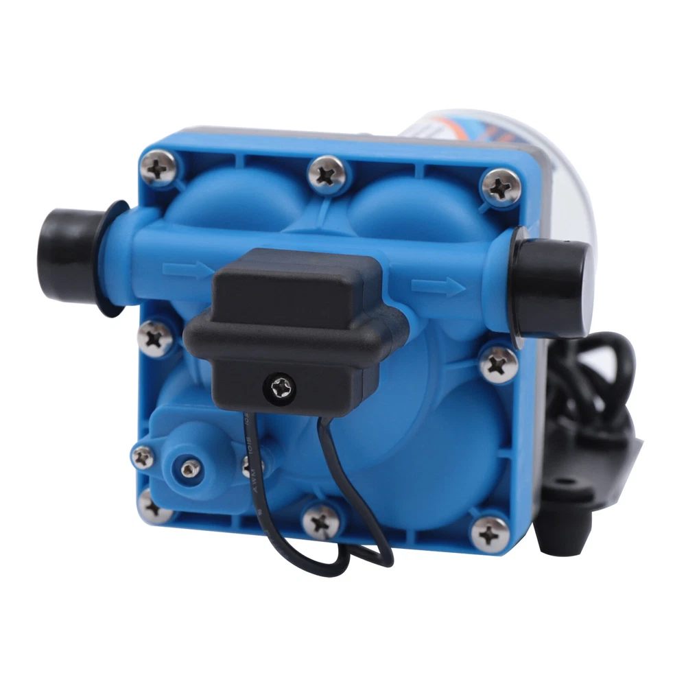 110V Self Priming Water Pressure Diaphragm Pump 55 PSI for Home/Caravan/Marine Description Self Priming Water Pressure Diaphragm Pump 18.9L/min 55 PSI Caravan/Marine Description If you are looking for a high flow, high efficiency, portable and durable high-quality water pump to help pump water, you can't go wrong with our professional water pump. This water pump uses a pure copper motor to provide it with powerful and stable power. With a rated head of 124.67 feet, it can water farmland and vegetation over long distances, saving time and effort on manual transportation. The pump's 4.99 GPM flow rate makes pumping water even faster. Key Features High-quality Materials : The water pump's body is made of engineering plastic, while the valve is made of EPDM. The excellent anti-aging and corrosion resistance of engineering plastic and EPDM make this pump strong and durable. Automatic Start/Stop : The water pump features an automatic start/stop design, which allows the pump to turn on/off automatically when you turn the faucet on/off. The auto start/stop design is easy to operate and reduces power consumption. Pure Copper Motor : The coil of the motor is made of pure copper, which is more stable and durable because it has less resistance compared to aluminum. Remote Irrigation : With a maximum head of 124.67 feet, the water pump can water farmland and vegetation over long distances, saving time and effort in manual transportation. Sturdy and Durable : The water pump features a built-in bypass return design. When the actual flow rate used is less than the pump output, the pressure relief cycle is activated. This effectively protects the pressure switch to extend the product's life. Standard Fittings : The water pump uses 1/2" standard fittings to fit most equipment sizes. This is easy to install and use. Adjustable Pressure : The automatic pressure switch has an adjustable range of 2.20-9.03 lbs. This adjustable automatic pressure switch can be applied to more scenarios. High Safety : The water pump is equipped with overheat and overload protection. When the pump generates too much heat or overloads, the pump will automatically disconnect the circuit. Such a good protection design greatly enhances its safety in use. Easy to Carry : The water pump's 6.17 pounds weight and compact size make it very easy to carry and use. Details Iron Plate Mounting Feet : The water pump's mounting feet are made of iron, which is strong and durable. The iron mounting feet can significantly reduce the working noise and improve the working environment. Moreover, the surface of the iron plate is galvanized, which makes it less likely to rust and corrode. Filter : The filter can effectively filter out debris and other particles from the pump. And its detachable design makes it easy to clean and assemble. PA Pump Head : The head of this pump is made of PA, whose excellent toughness and fatigue resistance can extend the service life of the pump. Arrow Indication : The surface of the water pump is equipped with an interface arrow indication, which makes it easy to connect external equipment. Interface Protective Cover : The water pump is equipped with a protective cover at the interface, which can effectively protect the interface from being damaged in transit. Application The water pump is suitable for filling equipment, agricultural irrigation, dishwashers, spray equipment, etc. Specification Pump Body Material: Engineering Plastic Color: Blue Valve Material: EPDM Diaphragm Material: TPE Pump Head Material: PA Valve Seat Material: POM Plastic Voltage: 110V Current: 2.5A Power Frequency: 50HZ Rated Power: 275W Connection Method: Thread Voltage Fluctuation Range: +-10% of rated value Volume of Solid Impurities In the Medium: <=0.1 Media Containing Solid Impurities In the Particles: <0.2mm/0.004in Stop Pressure: 55PSI/3.8BAR Control Mode: Pressure/Return Switch Wiring Method: Double-core Wire Ambient Temperature: Less than or Equal to 50℃ Medium Temperature: 0-65℃ Medium PH: 5.0-10 Rated Flow Rate: 18.9L/min Rated Head: 38m/124.67ft Inlet Size: 1/2in-14 Male Threaded Interface Pressure Adjustment Range: 1-4.1kg/2.20-9.03lbs Product Size: 23.3*12.6*10.9cm/9.2*5*4.3in Package Size: 29.9*14.6*12.8cm/11.77*5.74*5.03in Net Weight: 2.80kg/6.17 lbs Gross Weight: 2.84kg/6.26lbs Pressure Switch Adjustment Method 1. Open the pressure switch cover with a screwdriver. 2. Locate the internal hexagonal screw hole in the center of the switch. 3. Turn it clockwise to increase the pressure, and counterclockwise to decrease the pressure. Operating Instructions 1. Connect the pump with the inlet and outlet pipes, and make sure that the inlet and outlet pipes are tightly connected, otherwise, it will cause low pressure, no water suction, water leakage, and other problems. 2. Install a filter at the inlet end. The density of filtration is better than 50 mesh. 3. The pump is connected to the power supply, and the output parameters of the connected power supply must meet the input requirements of the motor. 4. Turn on the power, and the pump starts to run out of water for 5-10 seconds. Drain the air in the pump and pipeline. When the water is stable, turn off the power temporarily. Then connect the water gun, faucet, shower, and other related tools. 5. When you stop using, just turn off the water outlet faucet. The water pump has a pressure switch automatic start/stop function. You just open the faucet for the next use. Package Included 1*Water Pump 1*Strainer 2*Connectors Notes 1. When the pump is working, it is necessary to ensure smooth drainage of the pump to avoid holding the pump and causing damage to the pressure switch. 2. If you hear the switch ticking in operation, please turn off the pump immediately and adjust the pressure appropriately. 3. The motor has a slight waterproof function, splashed with a little water do not need to worry too much (dry can be), but the pump motor is strictly prohibited to immerse in water. If the pump