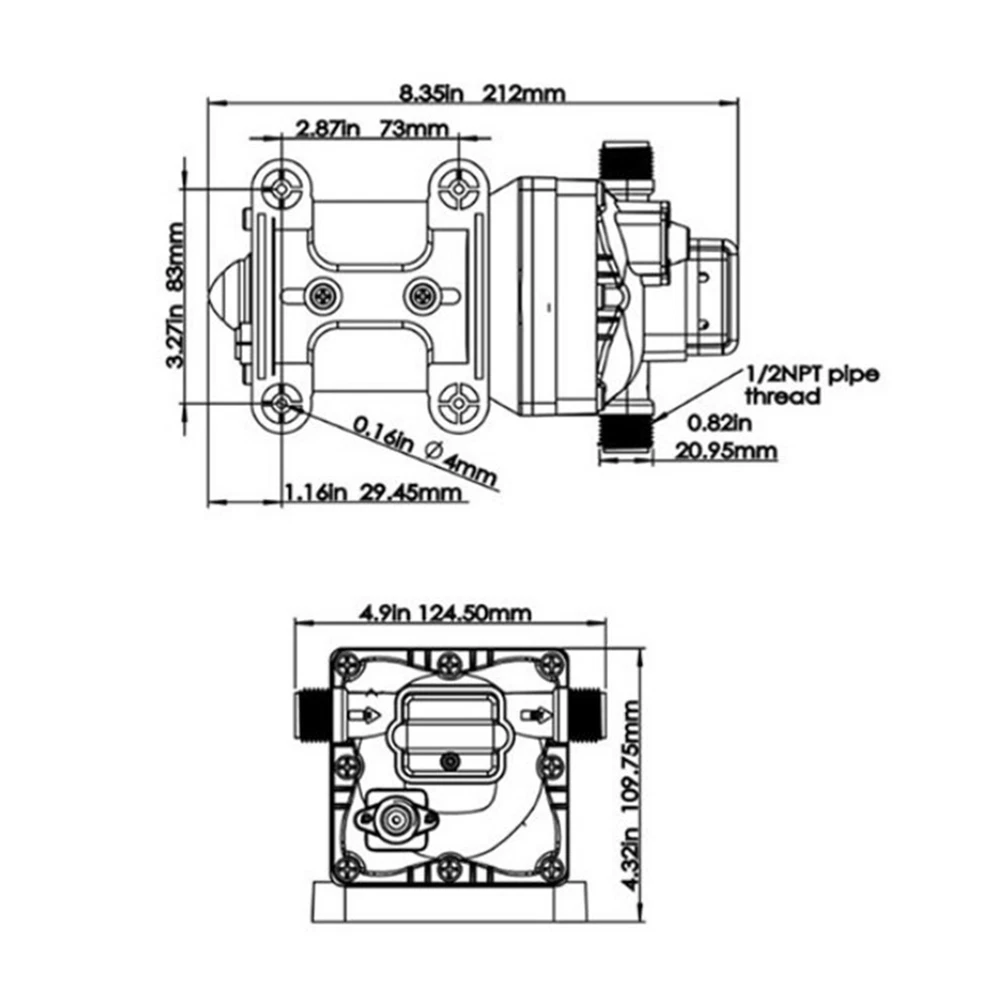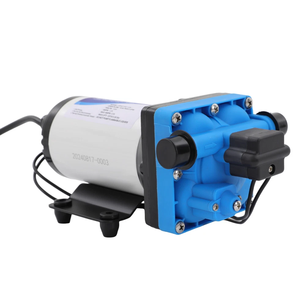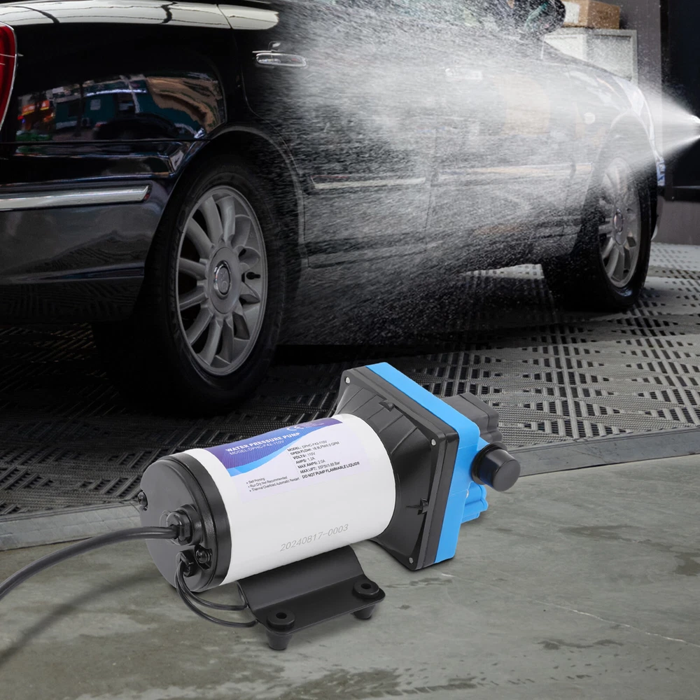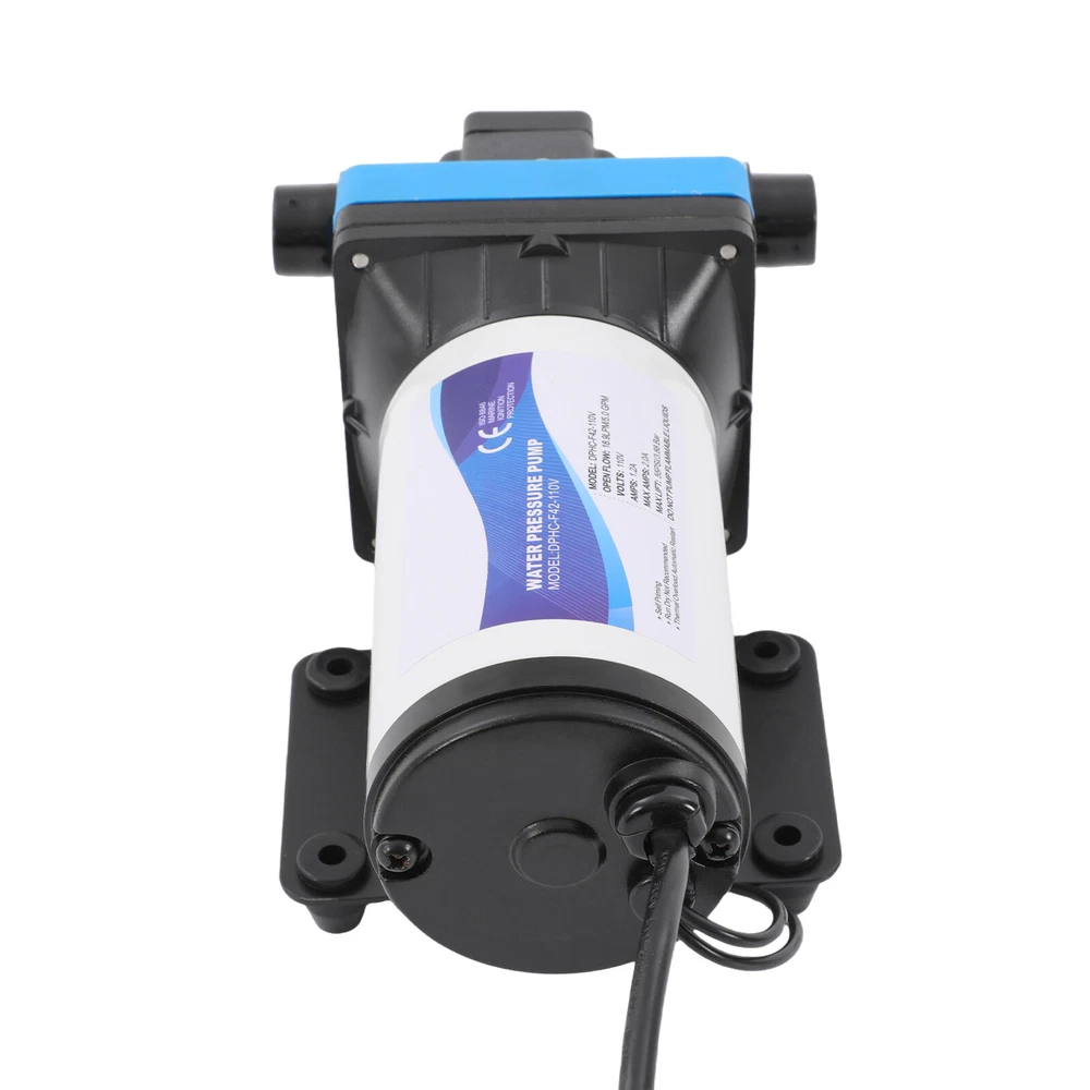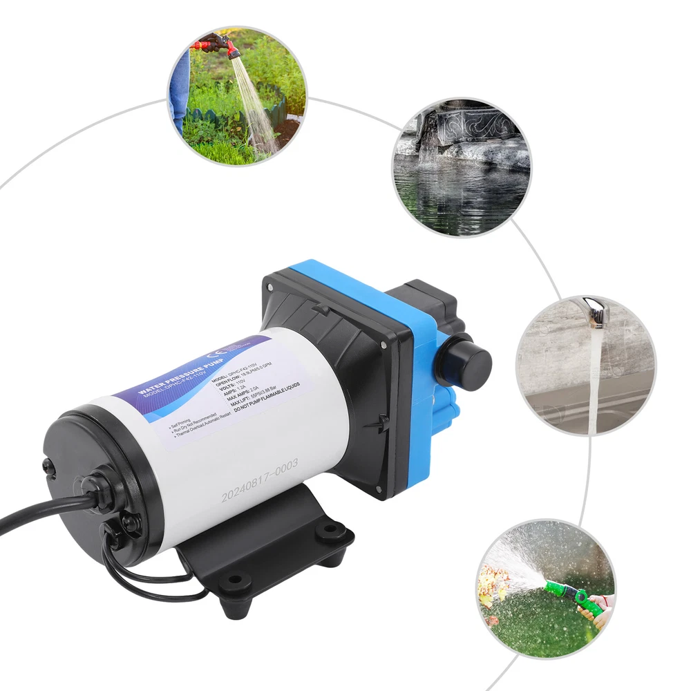 Specification Pump Body Material: Engineering Plastic Color: Blue Valve Material: EPDM Diaphragm Material: TPE Pump Head Material: PA Valve Seat Material: POM Plastic Voltage: 110V Current: 2.5A Power Frequency: 50HZ Rated Power: 275W Connection Method: Thread Voltage Fluctuation Range: +-10% of rated value Volume of Solid Impurities In the Medium: <=0.1 Media Containing Solid Impurities In the Particles: <0.2mm/0.004in Stop Pressure: 55PSI/3.8BAR Control Mode: Pressure/Return Switch Wiring Method: Double-core Wire Ambient Temperature: Less than or Equal to 50℃ Medium Temperature: 0-65℃ Medium PH: 5.0-10 Rated Flow Rate: 18.9L/min Rated Head: 38m/124.67ft Inlet Size: 1/2in-14 Male Threaded Interface Pressure Adjustment Range: 1-4.1kg/2.20-9.03lbs 110V Self Priming Water Pressure Diaphragm Pump 55 PSI for Home/Caravan/Marine 12 Volt 5.0 GPM Marine Water Pump 110V 55PSI High Pressure RV/Boat/Marine Description If you are looking for a high flow, high efficiency, portable and durable high-quality water pump to help pump water, you can't go wrong with our professional water pump. This water pump uses a pure copper motor to provide it with powerful and stable power. With a rated head of 124.67 feet, it can water farmland and vegetation over long distances, saving time and effort on manual transportation. The pump's 4.99 GPM flow rate makes pumping water even faster. Key Features High-quality Materials : The water pump's body is made of engineering plastic, while the valve is made of EPDM. The excellent anti-aging and corrosion resistance of engineering plastic and EPDM make this pump strong and durable. Automatic Start/Stop : The water pump features an automatic start/stop design, which allows the pump to turn on/off automatically when you turn the faucet on/off. The auto start/stop design is easy to operate and reduces power consumption. Pure Copper Motor : The coil of the motor is made of pure copper, which is more stable and durable because it has less resistance compared to aluminum. Remote Irrigation : With a maximum head of 124.67 feet, the water pump can water farmland and vegetation over long distances, saving time and effort in manual transportation. Sturdy and Durable : The water pump features a built-in bypass return design. When the actual flow rate used is less than the pump output, the pressure relief cycle is activated. This effectively protects the pressure switch to extend the product's life. Standard Fittings : The water pump uses 1/2" standard fittings to fit most equipment sizes. This is easy to install and use. Adjustable Pressure : The automatic pressure switch has an adjustable range of 2.20-9.03 lbs. This adjustable automatic pressure switch can be applied to more scenarios. High Safety : The water pump is equipped with overheat and overload protection. When the pump generates too much heat or overloads, the pump will automatically disconnect the circuit. Such a good protection design greatly enhances its safety in use. Easy to Carry : The water pump's 6.17 pounds weight and compact size make it very easy to carry and use. Details Iron Plate Mounting Feet : The water pump's mounting feet are made of iron, which is strong and durable. The iron mounting feet can significantly reduce the working noise and improve the working environment. Moreover, the surface of the iron plate is galvanized, which makes it less likely to rust and corrode. Filter : The filter can effectively filter out debris and other particles from the pump. And its detachable design makes it easy to clean and assemble. PA Pump Head : The head of this pump is made of PA, whose excellent toughness and fatigue resistance can extend the service life of the pump. Arrow Indication : The surface of the water pump is equipped with an interface arrow indication, which makes it easy to connect external equipment. Interface Protective Cover : The water pump is equipped with a protective cover at the interface, which can effectively protect the interface from being damaged in transit. Application The water pump is suitable for filling equipment, agricultural irrigation, dishwashers, spray equipment, etc. Specification Pump Body Material: Engineering Plastic Color: Blue Valve Material: EPDM Diaphragm Material: TPE Pump Head Material: PA Valve Seat Material: POM Plastic Voltage: 110V Current: 2.5A Power Frequency: 50HZ Rated Power: 275W Connection Method: Thread Voltage Fluctuation Range: +-10% of rated value Volume of Solid Impurities In the Medium: <=0.1 Media Containing Solid Impurities In the Particles: <0.2mm/0.004in Stop Pressure: 55PSI/3.8BAR Control Mode: Pressure/Return Switch Wiring Method: Double-core Wire Ambient Temperature: Less than or Equal to 50℃ Medium Temperature: 0-65℃ Medium PH: 5.0-10 Rated Flow Rate: 18.9L/min Rated Head: 38m/124.67ft Inlet Size: 1/2in-14 Male Threaded Interface Pressure Adjustment Range: 1-4.1kg/2.20-9.03lbs Product Size: 23.3*12.6*10.9cm/9.2*5*4.3in Package Size: 29.9*14.6*12.8cm/11.77*5.74*5.03in Net Weight: 2.80kg/6.17 lbs Gross Weight: 2.84kg/6.26lbs Pressure Switch Adjustment Method 1. Open the pressure switch cover with a screwdriver. 2. Locate the internal hexagonal screw hole in the center of the switch. 3. Turn it clockwise to increase the pressure, and counterclockwise to decrease the pressure . Operating Instructions 1. Connect the pump with the inlet and outlet pipes, and make sure that the inlet and outlet pipes are tightly connected, otherwise, it will cause low pressure, no water suction, water leakage, and other problems. 2. Install a filter at the inlet end. The density of filtration is better than 50 mesh. 3. The pump is connected to the power supply, and the output parameters of the connected power supply must meet the input requirements of the motor. 4. Turn on the power, and the pump starts to run out of water for 5-10 seconds. Drain the air in the pump and pipeline. When the water is stable, turn off the power temporarily. Then connect the water g