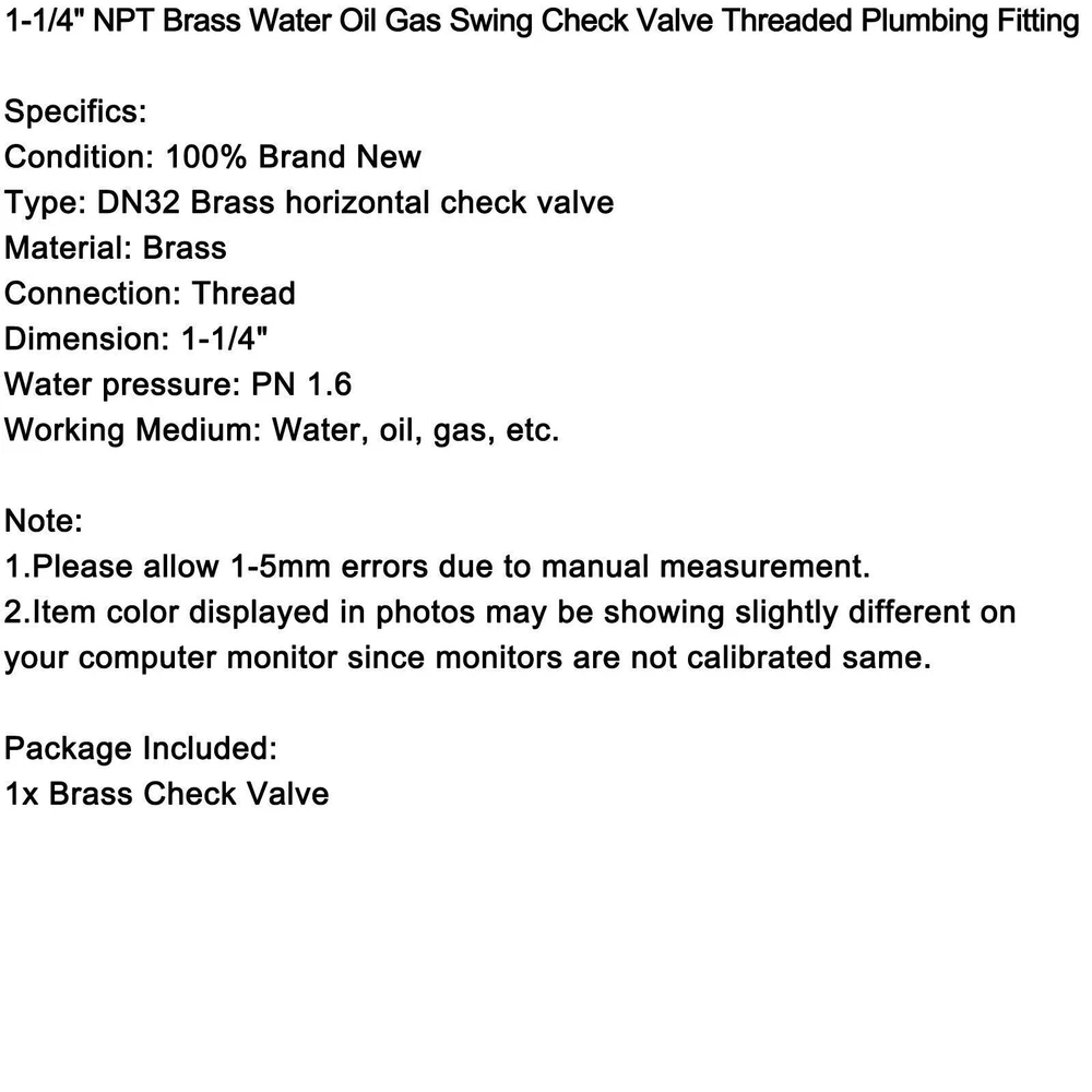 You may also like Solenoid Valve Coil 24VDC Fit For Daewoo DH300-5 Excavator Digger Parts 34.85 USD Free shipping 4V410-15 5 Way 2 Position PT1/2"AC 220V Pneumatic Electric Solenoid Air Valve 35.85 USD Free shipping 3/4" NPT Inline Check Foot Valve Brass Spring Loaded With Filter 200 PSI 14.11 USD 14.85 USD Free shipping 5% off 3/4" Female Thread Brass Horizontal DN20 One-Way Non-Return Swing Check Valve US 13.85 USD Free shipping DN15 Adjustable Brass NPT 1/2" Water Pressure Regulator Reducer w/Gauge Meter A 31.85 USD Free shipping 4V310-10 5 Way 2 Position PT3/8" DC 24V Pneumatic Electric Solenoid Air Valve 23.85 USD Free shipping DN25 1" Brass Adjustable Water Pressure Reducing Regulator Valves With Gauge 35.85 USD Free shipping 4V210-08 5 Way 2 Position Dc 24V Pneumatic Electric Solenoid Air Valve 19.85 USD Free shipping 1/4" DC 12V Brass Normally Closed Electric Solenoid Valve BSP Water Air N/C 19.85 USD Free shipping 1/2" Brass Swing Check Valve NPT Threaded Plumbing Fitting USA 12.85 USD Free shipping 1Pcs 12V Dc Solenoid Valve Coil Fits Hyundai R55 Excavator Diggers Parts 17.85 USD Free shipping Ac220V 1/2" Multifunction Auto Electronic Timed Air Compressed Drain Valve 35.85 USD Free shipping 1-1/4" NPT Brass Water Oil Gas Swing Check Valve Threaded Plumbing Fitting Feature: 1: Made of high quality brass, sturdy and durable for long term use. 2: With good resistance to corrosion and oxidation. 3: This is a check valve that allows water to flow through it in only one direction. 4: Brass Swing Check Valves are Used to Prevent Reverse Fluid Flow in Water and Steam Applications. Specifics: Condition: 100% Brand New Type: DN32 Brass horizontal check valve Material: Brass Connection: Thread Dimension: 1-1/4" Water pressure: PN 1.6 Working Medium: Water, oil, gas, etc. Note: 1.Please allow 1-5mm errors due to manual measurement. 2.Item color displayed in photos may be showing slightly different on your computer monitor since monitors are not calibrated same. Package Included: 1x Brass Check Valve -About US Founded in 2012, VIPJQ have professional development and sales, and are involved in various products, providing customers with various high-quality products. Since its establishment, VIPJQ has always adhered to the service concept of "customer first" and the management concept of "pursuit of quality", and is committed to providing customers with high-quality original designs. We commit to provide you the best innovative, quality products & professional services with competitive prices. We value every customer, and we look forward to providing solutions for your business needs to help your business achieve its goals, please contact us immediately! We are all about you! We are a Japanese seller,but with large warehouse in USA. We are profesional on Auto Parts,Car Parts,Motorcycle Parts,3C,other hot sale items and so on. We aim to provide to customers high quality product and best service. -About Shipment&Returns The item usually will be dispatched within 3 days after you ordered.All are free shipping. And it usually takes 3-10 working days to delivery depends on buyers' address or other majeure on the way. If you are not satisfied with the items and want to return the item,we hope you could message us first,we will give you the return details, we think we could give you the best service to save your time and money.Thank you. -About Feedback&Customer Service If you are enjoy your shopping here,not only enjoy the items but also the service,we are appreciate you could give us a 5-star feedback. If you are not satisfied with the item,before you give us the negative feedback,we hope we could give you the best solution through our commutication. We think we could do it if you give us the chance.Thank you.