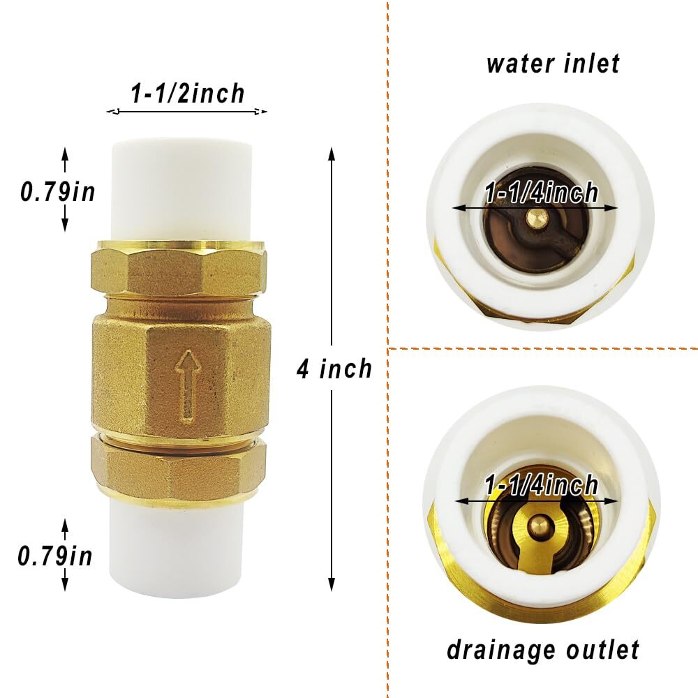 eBay Product Listing Welcome to Your Favorite My Store Your satisfaction is our top priority – Shop confidently Brass In-Line Check Valve 1-1/4 inch,One Way Valve for Connection with PVC Pipes,Prevent the Medium Backflow,Suitable for with ID 1-1/4 in PVC Pipes Item Gallery Item Description This valve Can be mounted horizontally or vertically and vertically and the PVC connections at both ends have an inside diameter of 1-1/4" and are suitable for connection to PVC pipe with an outside diameter of 1-1/4" This check valve comes with PVC fittings on both ends and can be connected directly to PVC pipe by simply applying glue. Tip: The inner diameter of the PVC fitting may be too small, so you need PVC pipe extender to enlarge it for installation. Valves are made of brass and are not susceptible to rust and corrosion. Often used in various water and oil transportation pipe The brass quiet check valve inner wall polishing treatment, smooth surface, no scaling, no clogging, durable and reliable Leak-Proof Performance: Precision-engineered to prevent backflow and ensure efficiency SAFETY: The valve is lead-free and suitable for all potable water supply, Easy to install Special Features 1 Our Guarantee To You We offer fast shipping, free delivery, and 100% customer satisfaction guarantee. Not satisfied? Return your item for free within 30 days. 30-Day Free Returns Shipping Details Items will be sent to your eBay address. Please verify before purchasing. Typical delivery within 3-7 business days. Professional shipping services used for all orders. We ship to the continental US (48 states only). Unable to deliver to Alaska, Hawaii, or territories. No APO/FPO or PO Box deliveries available. We use eco-friendly packaging Payment Options We accept these secure payment methods: All transactions securely processed through eBay's payment system. Simple Returns 30-Day Satisfaction Promise Contact us through eBay messages within 30 days of delivery. We'll provide return instructions and our address. Return the item in its original condition. We'll process your refund within 48 hours of receiving the item. Get In Touch Have questions about your order? Contact us through eBay messaging for prompt assistance. We typically respond within 24 hours.