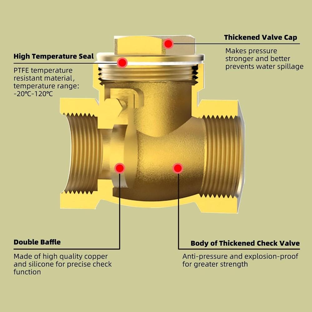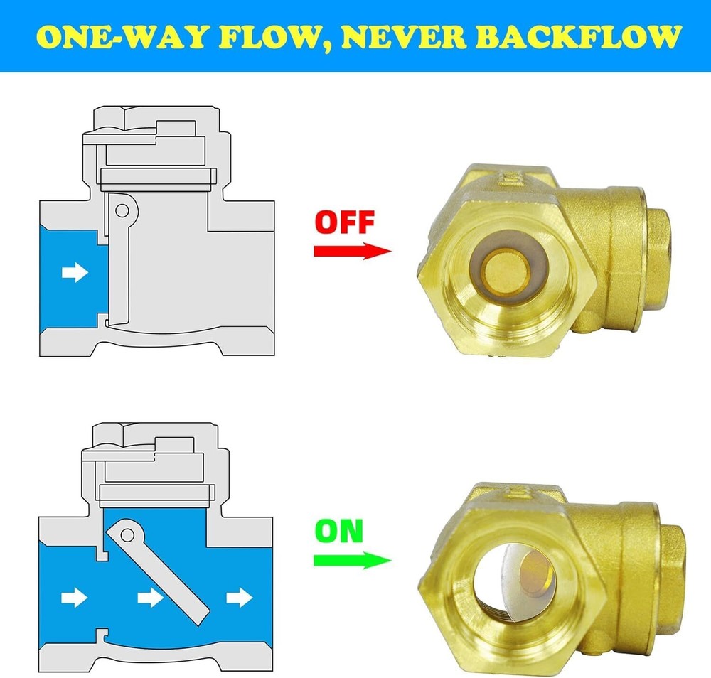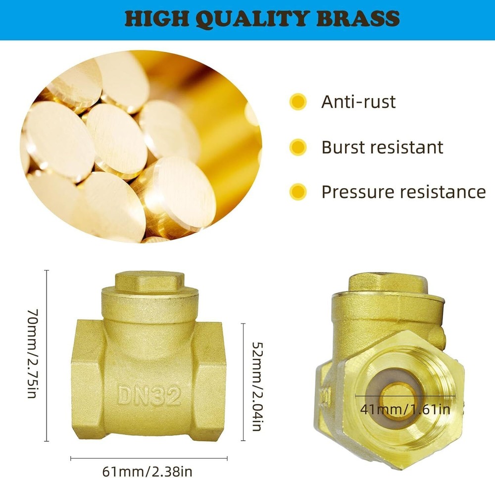 eBay Product Listing Welcome to Your Favorite My Store Your satisfaction is our top priority – Shop confidently NPT Check Valve, 1-1/4" Female Horizontal Brass Check Valve for Water Backflow Prevention, Suitable for Sewage Pumps and Air Compressors, DN32 Item Gallery Item Description 【BRASS CHECK VALVE】 It is a valve that relies on its own gravity and medium pressure to prevent the return of the medium. Only one medium is allowed to flow in one direction, preventing media backflow. 【EXPLOSION-PROOF, WEAR-RESISTANT】 The all-brass valve body has the characteristics of pressure resistance, explosion-proof, high temperature resistance and durability. Uniform wall thickness, high wear strength, long service life and good use effect. 【NOT EASY TO SCALE】 The inner wall of brass check valve is polished, all copper, smooth surface, no scaling, no blockage, practical and durable. 【WIDE APPLICATION】 Available in a variety of specifications for most piping systems. Widely used in chemical, construction, petroleum, light and heavy industry, fire protection, electric power, water power, aerospace, shipbuilding... 【NOTE】Applicable temperature: 14°F≤T≤248°F, flow direction: unidirectional, medium range: water, oil, non-corrosive flammable gas. Please refer to the size chart on the product detail page to select the appropriate size check valve. Special Features Our Guarantee To You We offer fast shipping, free delivery, and 100% customer satisfaction guarantee. Not satisfied? Return your item for free within 30 days. 30-Day Free Returns Shipping Details Items will be sent to your eBay address. Please verify before purchasing. Typical delivery within 3-7 business days. Professional shipping services used for all orders. We ship to the continental US (48 states only). Unable to deliver to Alaska, Hawaii, or territories. No APO/FPO or PO Box deliveries available. We use eco-friendly packaging Payment Options We accept these secure payment methods: All transactions securely processed through eBay's payment system. Simple Returns 30-Day Satisfaction Promise Contact us through eBay messages within 30 days of delivery. We'll provide return instructions and our address. Return the item in its original condition. We'll process your refund within 48 hours of receiving the item. Get In Touch Have questions about your order? Contact us through eBay messaging for prompt assistance. We typically respond within 24 hours.