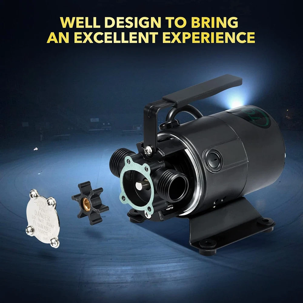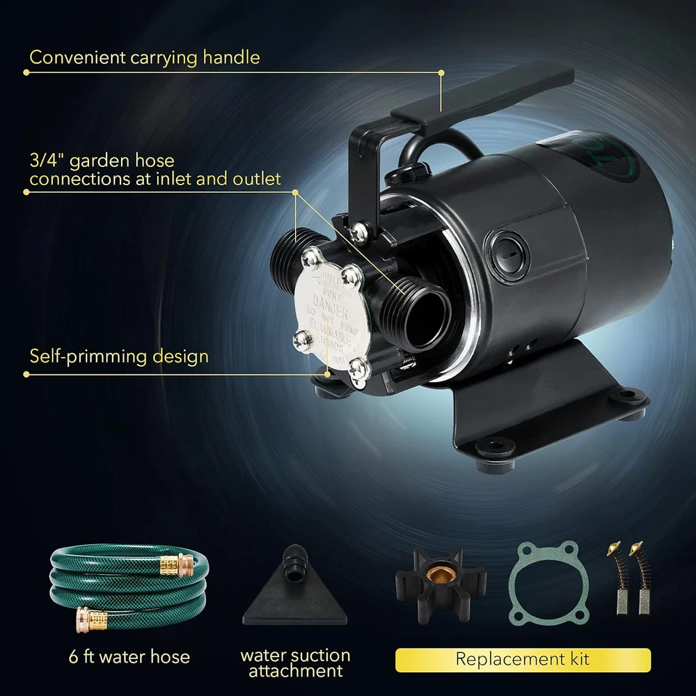 SELF-PRIMING AND EASY-TO-USE: Add some water in the pump and place the intake hose attachment in the water. Activate the pump and transfer water at a rate up to 330GPH. ULTRA-LIGHT AND PORTABLE: Light-weight and compact pump with 6ft cord line, this mini pump is easy to carry where you need it. POWERFUL: Large lifting capacity. Transfer water up to 330 GPH and the maximum head up to 44ft, remove water down to 1/8 inch of surface. DURABLE AND STURDY: Fully aluminium alloy pump body and pump bottom, good rust prevention, anti-fragile, easy for clean-up and maintenance and ensures an extension of service life. MULTI-PURPOSE: Perfect choice for transfering water from acquariums, flooding and leaking areas, water beds, clogged sinks, bathtub, etc. Product Description The TOXIC INC 115V 330 GPH non-submersible self-priming transfer pump is perfectly designed for water transfer and removal tasks. This mini pump can help to remove water from flooded areas, window wells, basements, basins, water tanks, bathtubs, leaking boats, etc. This product includes: 1. Water Pump with 6 ft. suction hose 2. Water suction strainer attachment 3. Replacement motor brush set (including impeller, gasket and brush) 4. User manual 5. Package box PLEASE NOTE: 1. This transfer pump is ONLY available for clear water transfer/removal. 2. NOT intended for use in sewage or septic systems 3. NOT intended for fuel or other flammable liquids. 4. To help extend service-life, before FIRST-TIME used or LONGTIME NOT used, the chamber needs to be filled with liquid prior to first-time operation to achieve better lubrication and sealing. We have to remind you that: This pump is self-priming, but we highly recommend you to add some water in the chamber before first-time operation, or long-term idle after use, which could bring better lubrication and sealing. This pump is not a submersible pump, do not submerge in water or other liquids, please always keep it dry. Please only use this pump to transfer clear water. Sewage and flammable or explosive fluids such as gasoline, fuel oil, kerosene, etc. are not applicable. Product features Scientific design High quality and performance Durable structure Multiple Application
