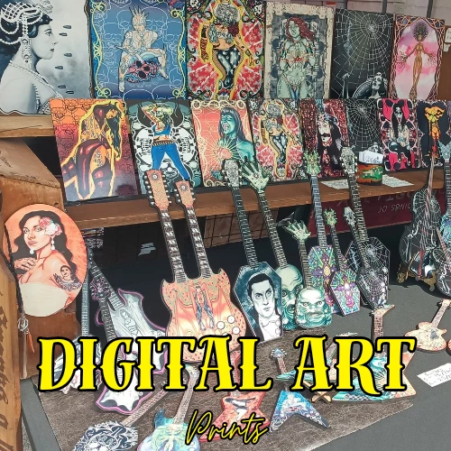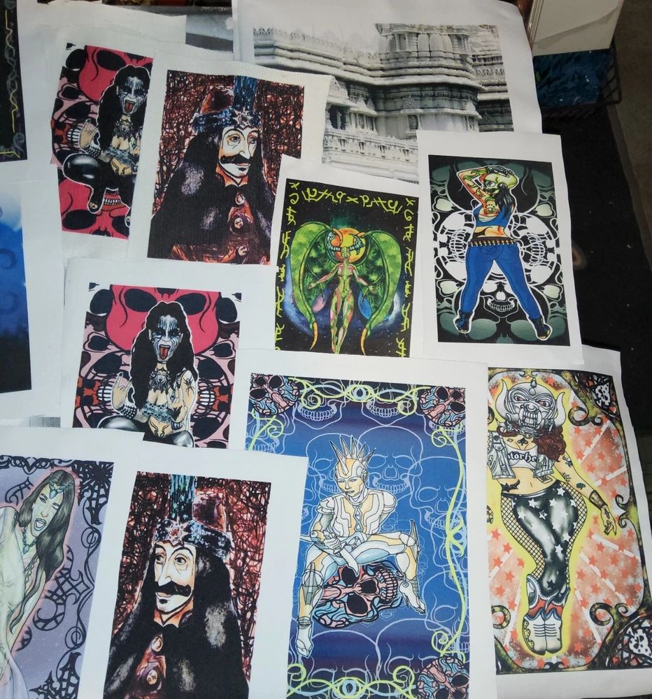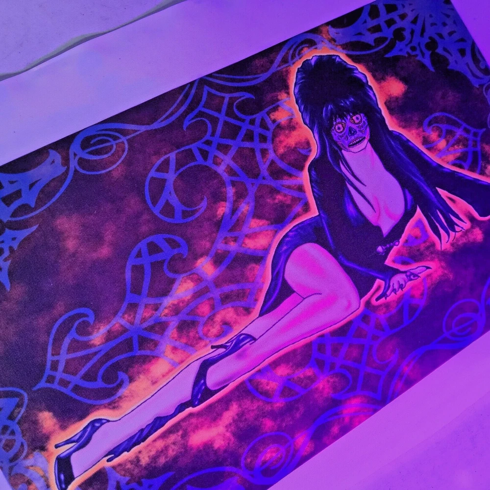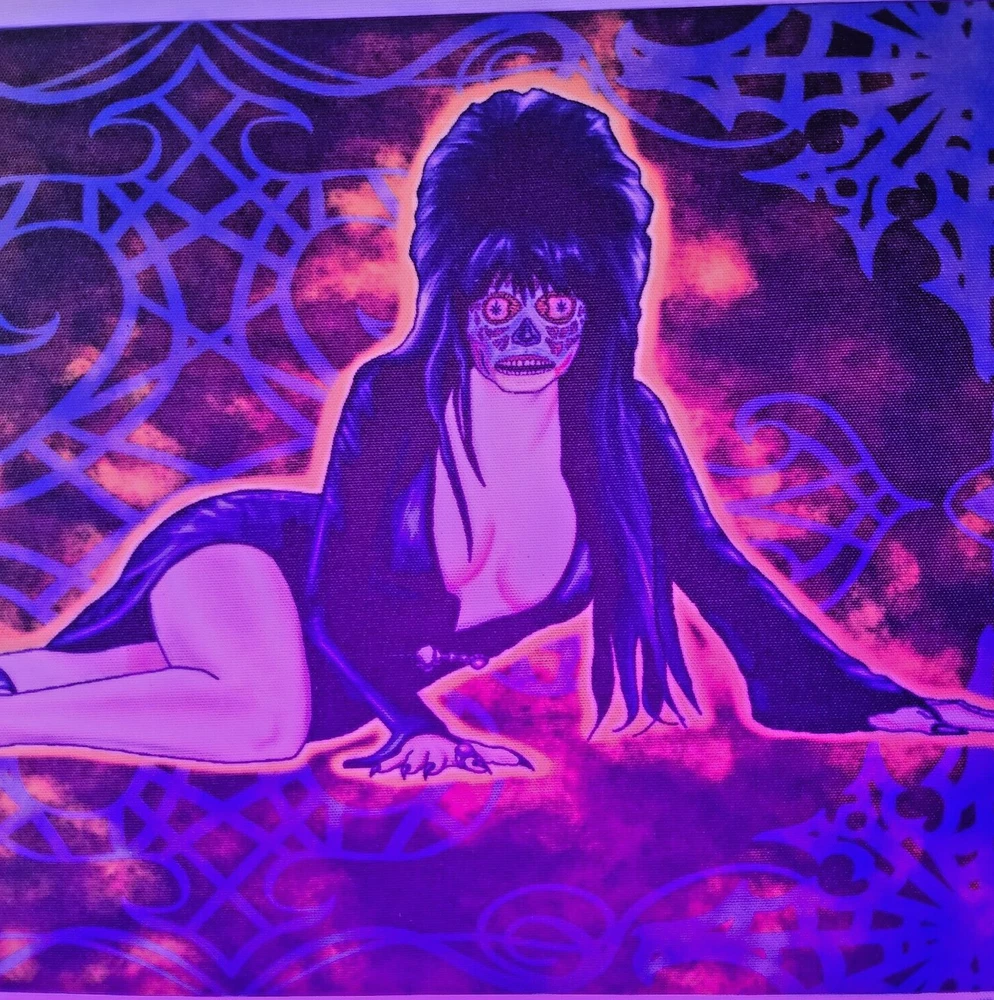 11x7 elvira as they live alien goth pinup halloween digital art prints by me,the artist. Decided that Elvira would still make a hot alien so drew her up as a "They live" baddie just straight chillin'. She gets a pass for being Elvira. Made some sublimation prints so we can all enjoy this piece. Check out other prints of my art in my shop. ***Treasure Suite offers you many pieces of my art prints now*** ###This section is for large sized sublimation prints of my digital art. measurements are 15"hx12"w. ### *Welcome to my unique collection of digital art, where creativity meets craftsmanship! Each piece in this category features my original designs, heat pressed into vibrant sublimation prints on polyester canvas material. These art pieces are not just decorations, they are collectibles that bring a touch of gothic, rock and roll, horror, pin-up, and lowbrow art into your space. *I leave extra fabric border so you can gallery wrap on frame,cut to size, or sew onto clothes. Sublimation printing is what's done on clothing, like all over sweaters,tshirts,banners,etc. So that means it can be used on clothing and washed. If print gets wrinkled, you can steam it. *These pieces are perfect for adding a distinctive edge to your home or office, and they make fantastic gifts for art enthusiasts and collectors alike. Who doesn't enjoy vibrant digital art of out of this world space huntresses, demon witches, cyberpunk vixen cyborgs, spooky mistresses,and so on?