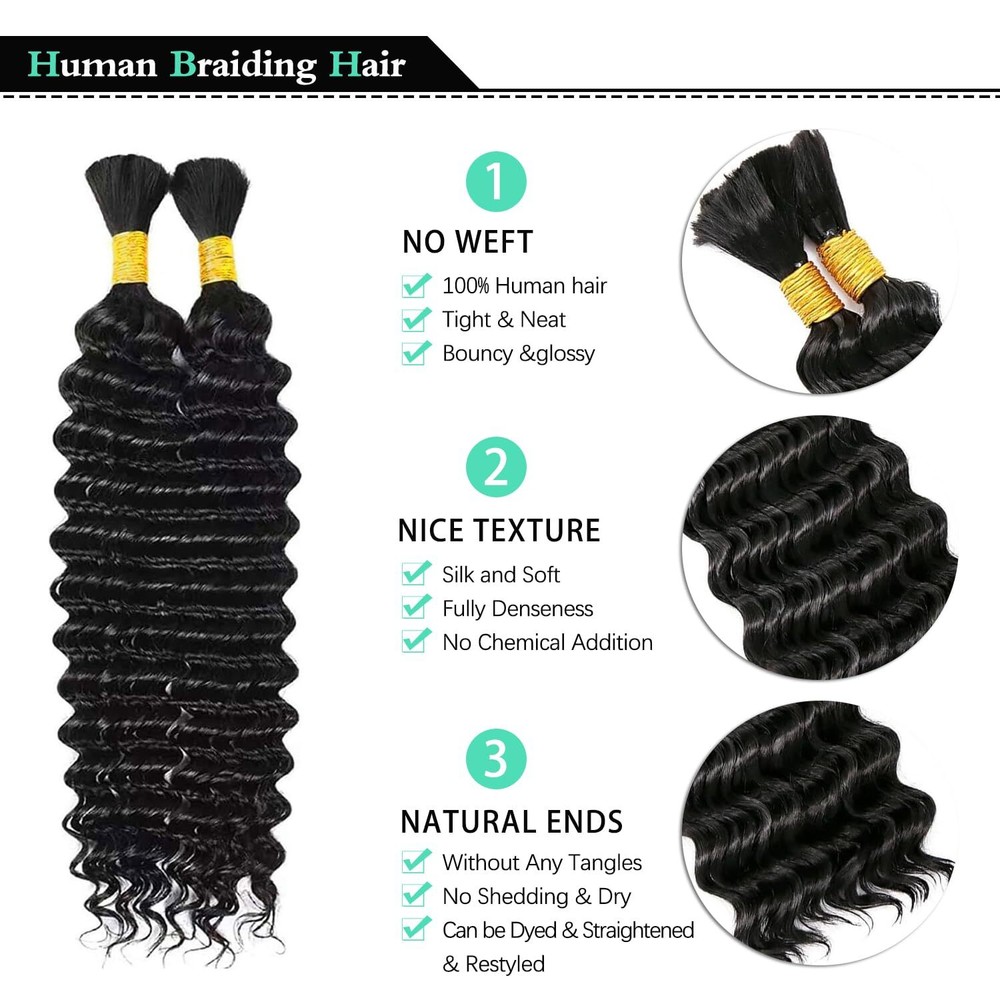 Human Hair Braiding Hair Specifications Brand Name: Beautypro Item Type: Bulk human hair for braiding no weft Color: #1B Black Weight: 100g (50g/bundles) deep bulk human hair for boho braids Length: 12inch Hair Mate rial : 100% Unprocessed Brazilian Virgin Human Hair Suggestion: For a full head braids , we recommend 2-3 bundles For a long and fuller head braids, we recommend 3-4 bundles If you need more other color s ,Human Hair Bulk, please click here .