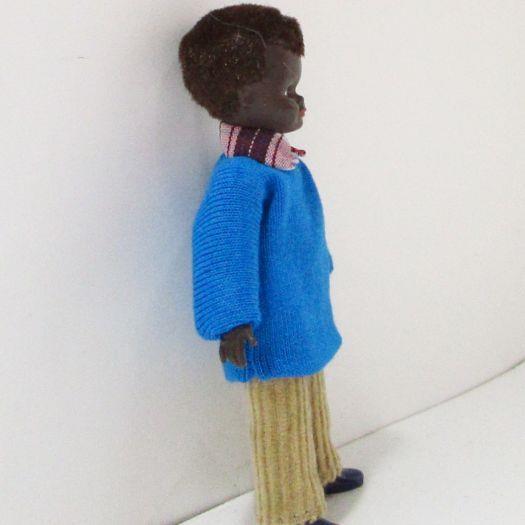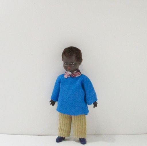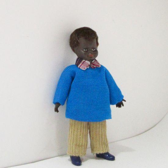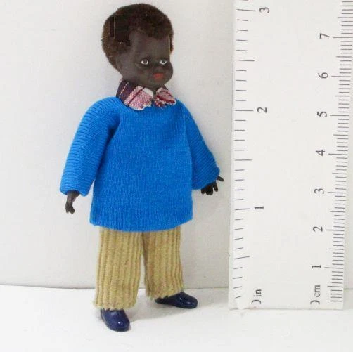Please read entire description and see all pictures. Please read entire description and see all pictures. Click image to enlarge Description FLEXIBLE DOLLS B END INTO MANY POSITIONS Most Caco dollhouse dolls are NOT as tall as Heidi Ott or Erna Meyer dolls. But Caco dolls are 1:12 scale. miniature Black ethnic little boy doll tan corduroy pants turquoise sweater plaid shirt collar approx 3 1/8 in. flexible, posable body clothing is not removable The Caco dolls have wrapped limbs, shoes are attached/painted-on One thing I especially like about the Caco dolls is that there is such a variety of clothing from different eras, in a variety of styles and fabrics. PLEASE NOTE: Caco dolls have always been 1/12th scale (1 in. = 1 foot) even though they are not as tall as Heidi Ott or Erna Meyer dolls. (I don't know how Caco dolls compare with any other brand.) Please look in this listing for the approx. size of this Caco doll. If you have another brand of doll in your dollhouse, please keep in mind that there will probably be a size difference. PLEASE NOTE: Because the faces are handpainted, they may vary a little from the picture. THIS IS AN ADULT COLLECTIBLE. IT IS NOT SUITABLE FOR CHILDREN. see other Caco dollhouse dolls see other dressed dollhouse dolls Helpful information is below; be sure to read to the bottom of the page. Check out the other items in my Store, gemjane's dollhouse miniatures . Collectible name brands and more, including some unusual and hard-to-find miniatures Sign up for my email newsletters by adding my eBay Store to your Favorites Shipping Several dollhouse miniatures may fit in one package for the same postage that one mini would require. I offer USPS First Class Shipping (unless pkg is big enough to require Priority). The USA choice comes with Delivery Confirmation and a Tracking Number. All of my products are in my possession in a smoke-free, pet-free environment. I ship quickly--same or next business day after (cleared) payment. INTERNATIONAL BUYERS ARE WELCOME -- Please contact me for the First Class International Mail rate to your country. PLEASE NOTE: For international shipping, I am required to state the actual value of the package contents, so please do not ask me to state otherwise. The value of the item is automatically printed on the international label--permanently--cannot be changed. Please be aware that you are responsible for all customs fees. About Us Reasons to purchase from gemjane's dollhouse miniatures: A great variety of dollhouse miniatures Fast shipping, careful packing Great, friendly customer service Custom listings, custom orders Returns accepted All items from a pet-free and smoke-free home, and in my possession Emails/messages answered in a timely manner If you don't see the dollhouse miniature you're looking for, ask me--I may have it on hand or I may be able to order it. Contact Us I check my messages frequently. If you have questions, feel free to contact me through Ask a Question. If there is any problem with the transaction, be sure to contact me about it, and I will work with you to resolve the problem to our mutual satisfaction. Images sell! Get Supersized Images & Free Image Hosting Create your brand with Auctiva's Customizable Templates. Attention Sellers - Get Templates Image Hosting, Scheduling at Auctiva.com.