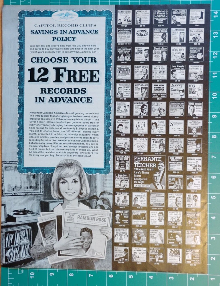 This vintage 1960s Capitol Recording Club ad is a fantastic blast from the past! The 2-page spread perfectly captures the charm of old-school advertising, offering a nostalgic glimpse into music marketing of the era. Great condition with clear details, it’s a must-have for collectors of music memorabilia or retro decor. The seller provides helpful notes about condition and origin—definitely a cool piece for any vintage enthusiast!