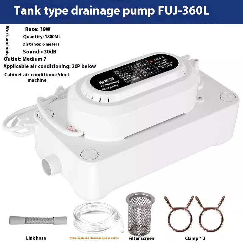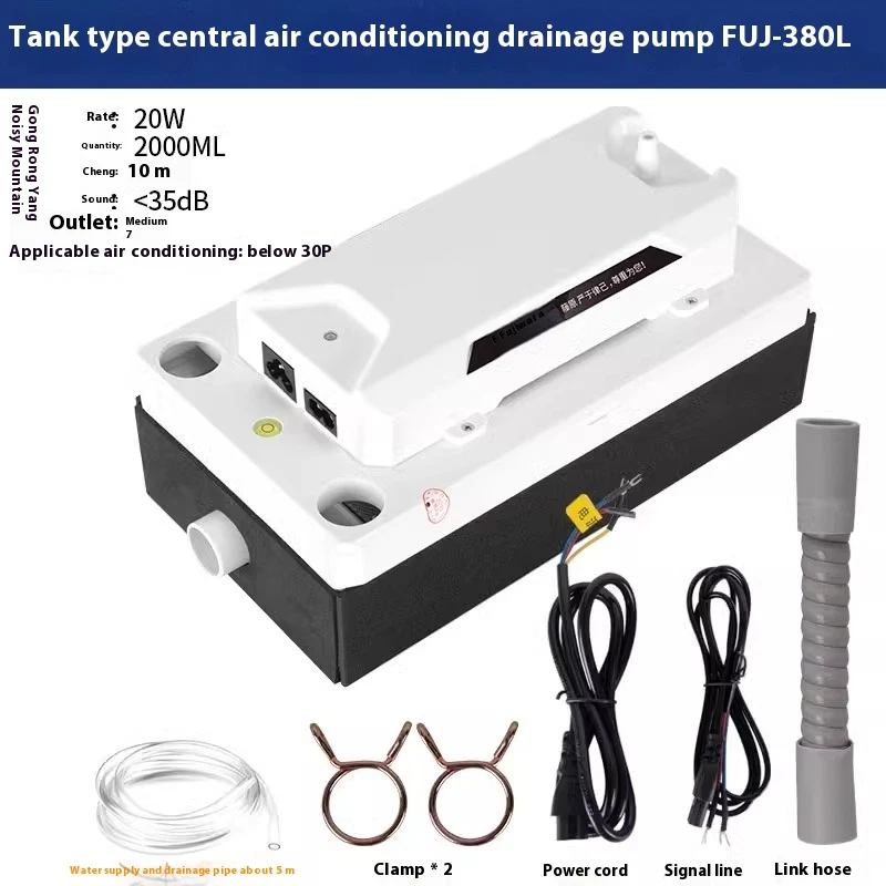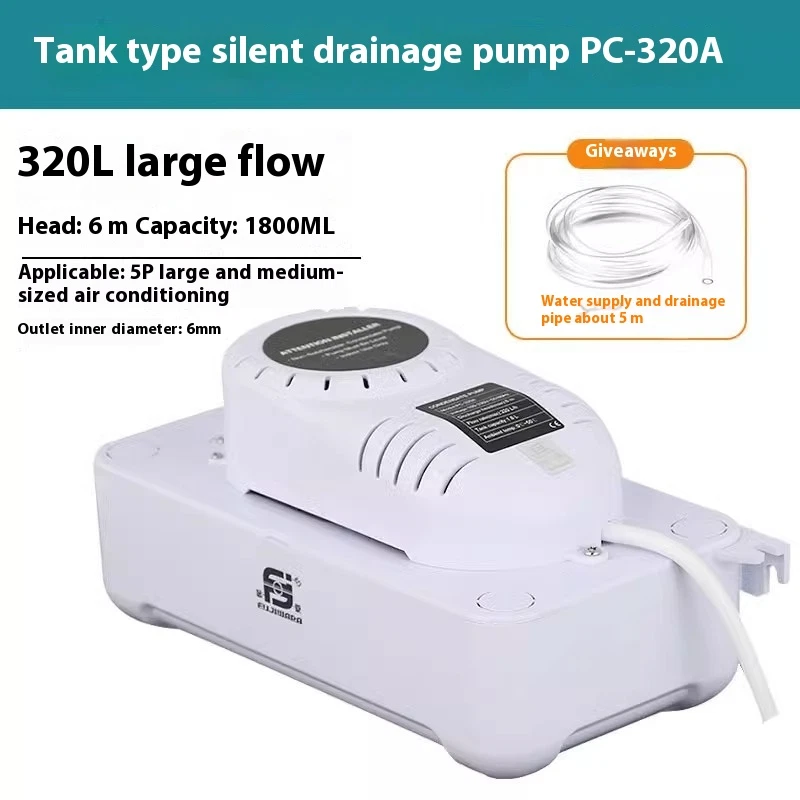1/2 Gallon Tank HVAC AC Condensate Removal Water Pump for Split Air Conditioner Model: PC-320A 100v to 230V 60hz 50hz Flow Rate: 84 GPH (320L/H) Discharge Head: 6m Max Keep that condensate out of your atmosphere For removal of condensate air from air conditioners, gas furnaces, and condensing boilers, this PC320A pump gets the job done. It has a half gallon ABS tank, motor cover, volute, stainless steel shaft, and a snap action switch.It features 4 inlet drain holes and thermal overload protection. PC-320A Series condensate removal pump For removal of condensate from an air conditioner or any Coolers suitable for high efficiency, gas furnace condensation, and condensing boilers 1/50 HP high performance motor ABS tank, motor cover, and volute 1/2 gallon tank capacity Big flow rate suits for large AC Easy for install and maintenance with alarmed and control the air conditioning function Check valve inside Model: PC-320A 100v to 230V 60hz 50hz Flow Rate: 84 GPH (320L/H) Discharge Head: 6m Max ABS tank, motor cover, and volute 1/2 gallon tank capacity Stainless steel shaft Snap action switch Removable 0.38 inch (9.5 mm) barbed check valve 4 inlet ports suite for different position top or side Thermal overload protection cCSAus Cord: 3 feet 10" x 5" x 5" approx