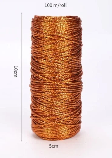 Listing for 120 yards Metallic Lurex Rope Twisted Thread Macrame Cord Rope 1.5mm. Unique yarn/rope/cord! Thickness: 1.5 mm Gold Cored lurex Rope: 1.5 mm Round Rope for Craft Jewelry Making, Thread Cord, Garment Sewing. Bobbin size: 10 cmX5 cm Each bobbin contains 120 yards. Material: The rope is made of high-quality lurex, ensuring strength and durability for long-term use. Gift Idea: This rope makes a perfect gift for your family and friends. You can use it to create handmade jewelry. These beautiful ropes are versatile additions to various projects, including home decor, wedding bouquets, crafts, handmade cards, scrapbook pages, and nursery items. You can also use them to trim a bassinet, decorate lampshades, or add interest and soft sheen to almost any project. Get creative and make tiny hair wreaths for dolls with these adorable ropes Once you try, you will love!
