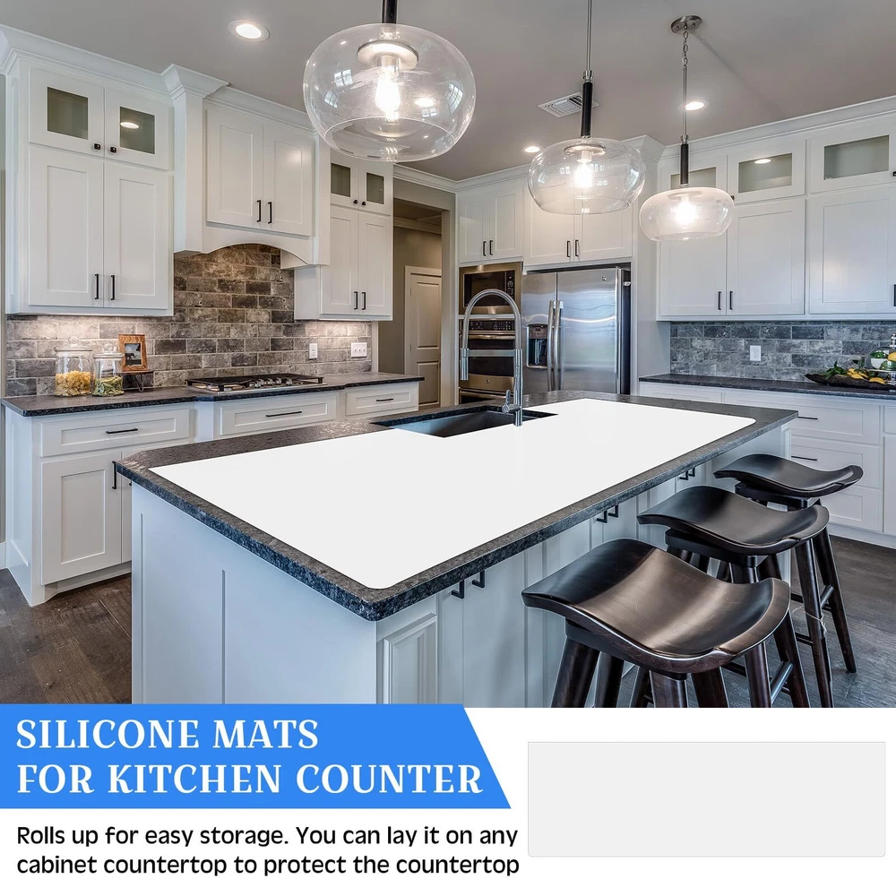 Features: Keep your counter safe and clean: Revel in the sleek sophistication of our dark gray silicone cutting boards for kitchen. Its single side frosted design not only offers a trendy touch but also provides anti slip protection. Easy to clean: Cleanup is a breeze with this dishwasher safe gem. When not in use, tuck it away easily, just roll it up and store. Specifications: Material: silicone Color: as picture shows Size: about 120 x 24 inches/ 304.8 x 61 cm Package includes: 1 Roll silicone counter mat Notes: Manual measurement, please allow slight errors on size. The color may exist a slight difference due to different screen displays. Quality Material: the silicone cutting mats provide a sturdy and solid base for your kitchen needs; Made of durable silicone, it's flexible, durable, and designed to last; Resistant to wear and tear, making it an ideal choice for busy kitchens or dining areas Versatile Design: in a classic white, the silicone pad fits into most kitchen decoration or color scheme, and mixes well with stainless steel, wood, stone and other counter surfaces; Measuring about 120 x 24 inches/ 304.8 x 61 cm, the size is suitable for a variety of kitchen tasks; Its frosted design adds an upscale touch, making it not just useful, but a stylish accessory for your kitchen too Convenient and Compact: the kitchen counter mats and protectors comes rolled up, making it convenient for storage when not in use; It's lightweight, portable and compact in shape, not occupying too much space in your home; Unroll it whenever you need extra counter space for meal preparations, serving or dining Multipurpose in function: this kitchen countertop protector adeptly protects your counters from heat, scratches and spills; It's ideal for placing hot pans, preventing oil contamination, and protecting your furniture from cutting knives; It is safe and slip resistant; It's not just for use in kitchens but is also suitable for dining tables, ovens and more Easy Cleaning: the silicone table mat is not only safe for use, but is also easy to clean; Its smooth surface allows for easy removal of stains or dust, and it is dishwasher safe; This means you can keep your kitchen clean; Follow the straightforward cleaning instructions provided, and your silicone counter mat will maintain its looks and function for years to come
