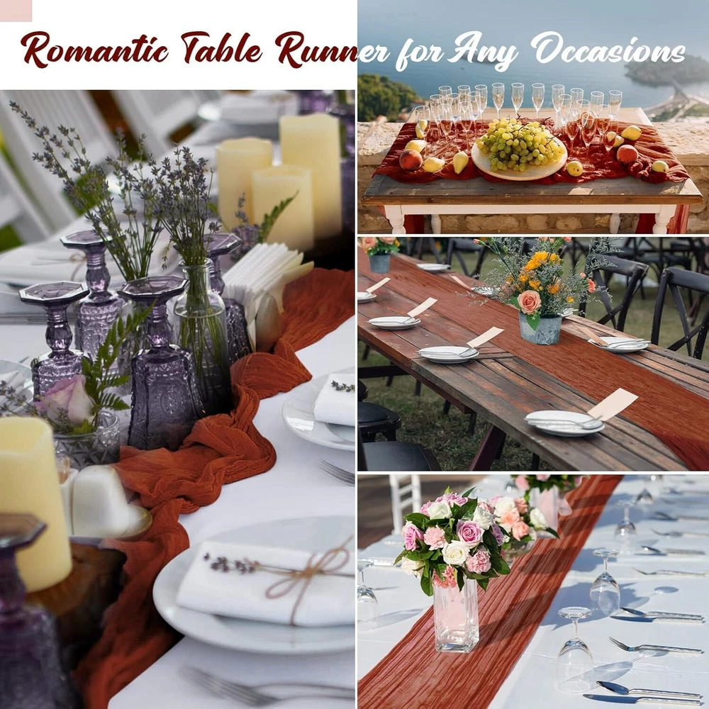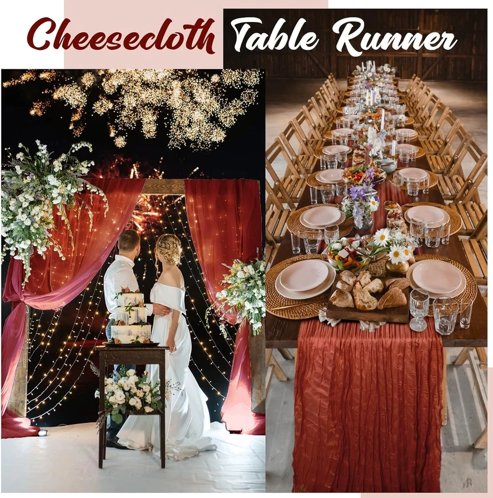 120"x29" Rustic Cheesecloth Set - 24 Light Weight Table Runners in Rust Color ‹ › ‹ › ‹ › ‹ › ‹ › ‹ › ‹ › ‹ › ‹ › 120" x 29" Rustic Cheesecloth Set - 24 Light Weight s in Rust Color Product Highlights: Sufficient Quantity: Enjoy a generous set of 24 exquisite cheesecloth s, each measuring 120 x 29 inches (10 ft long), perfect for all your decorating needs. Quality Material: Crafted from quality polyester, these boho s boast a sophisticated touch—lightweight yet robust, combining transparency with comfort. Table Decor: Edges are tightly stitched for durability, resists abrasion and maintains structure, making them ideal for various festive occasions. Gorgeous Colors: Choose from an enchanting array of colors including rust, light blue, and peach coral; harmonious combinations with fragrant flowers for a striking table presentation. Easy to Style: Versatile and chic, these runners enhance any theme—be it boho, rustic, country, or retro—delivering elegance whether for weddings or everyday dining experiences. Transform Your Events: Indulge in the beauty of your gatherings with the 120" x 29" Rustic Cheesecloth Set, designed to elevate any table setting with a touch of sophistication. Perfect for baby showers, weddings, holiday parties, or intimate dinners, these runners bring a romantic ambience that captivates guests at first sight. The romantic drape and delicate folds create a picturesque dining atmosphere. Hand-washable for easy maintenance, remember to keep them away from bleach and irons. Whether it’s an elegant wedding reception or a cozy candlelight dinner, these runners are the quintessential decor piece that emphasizes style and warmth. Why Choose Our Rustic Cheesecloth Runners? Stand out with our collection! The combination of functionality and aesthetic appeal makes these s a must-have for anyone looking to enhance their events and daily life. Add the final touch to your tablescape and let your gatherings shine with elegance—order your Rustic Cheesecloth Set today! Shipping Free & Fast Shipping - We offer free shipping to most of the USA with a normal delivery time of 3-7 days. However, due to the current situation, additional delivery time (up to 3 weeks) may be required for some items. Alternative Carriers - We may use alternative carriers (e.g. USPS, FedEx, UPS, etc.) to ensure your package arrives safely and on time. Due to the use of multiple carriers, we are unable to provide a tracking number automatically. Handling Time - Orders are processed and shipped within 1-2 business days of receiving cleared payment. Shipping Restrictions - Shipping to Alaska, Hawaii, Puerto Rico, Guam, and other US territories may incur shipping charges or delivery restrictions. Please contact us before ordering, or your order can be refunded/cancelled. State Restrictions - There may be restrictions based on your state of purchase. For example, certain items may not be shipped to California due to state regulations. Contact for Tracking Updates - If you require tracking updates or have any concerns about the delivery of your order, please feel free to contact us, and we will be happy to assist you. Return Please see our eBay Return Policy. Thank you. Payment We accept all major credit cards, PayPal, and Apple Pay for your convenience. Your payment information is secure and encrypted to ensure a safe and seamless transaction. Please complete your payment within 3 days of purchase to avoid any delays in shipping. Feedback Your feedback is extremely important to us. We strive to provide the best products and customer service possible. If you are satisfied with your purchase, please take a moment to leave us a positive review. If you have any concerns or issues with your order, please contact us before leaving negative feedback. We are committed to resolving any problems and ensuring your satisfaction. Contact Us If you have any questions or concerns, please feel free to reach out to our customer support team. You can contact us through the eBay messaging system. We are available Monday to Friday, 9:00 am to 5:00 pm EST, and we will do our best to respond to your inquiry within 24 hours. Thank you for supporting our small family business! UPC: Not Set Unit Quantity: 24 Material: 100% Polyester,Polyester,Cheesecloth Theme: Not Set Occasion: Anniversary,Apology,Baby Shower,Bar Mitzvah,Birthday,Christmas,Congratulations,Easter,Engagement,Funeral,Get Well,Good Luck,Halloween,International Women's Day,Labor Day,Mother's Day,Multipurpose,New Home,Party,Retirement,Romance,Surprise,Sympathy,Wedding,Thanksgiving Features: Hand Wash Only,Abrasion Resistant,Fade Resistant,Shrink Resistant,Deform Resistant,Light Weight,Comfortable Touch,Romantic Style Department: Adults,Boys,Girls,Kids,Men,Teens,Unisex,Unisex Baby & Toddler,Women Character: Not Set Brand: Unbranded Color: Rust Type: Table Runner Pattern: Solid Shape: Rectangular Style: Boho MPN: Not Set Item Length: Not Set Country/Region of Manufacture: Not Set Character Family: Not Set Item Width: Not Set Model: Not Set Unit Type: Unit Care Instructions: Hand Wash Only Personalize: Not Set