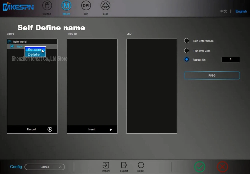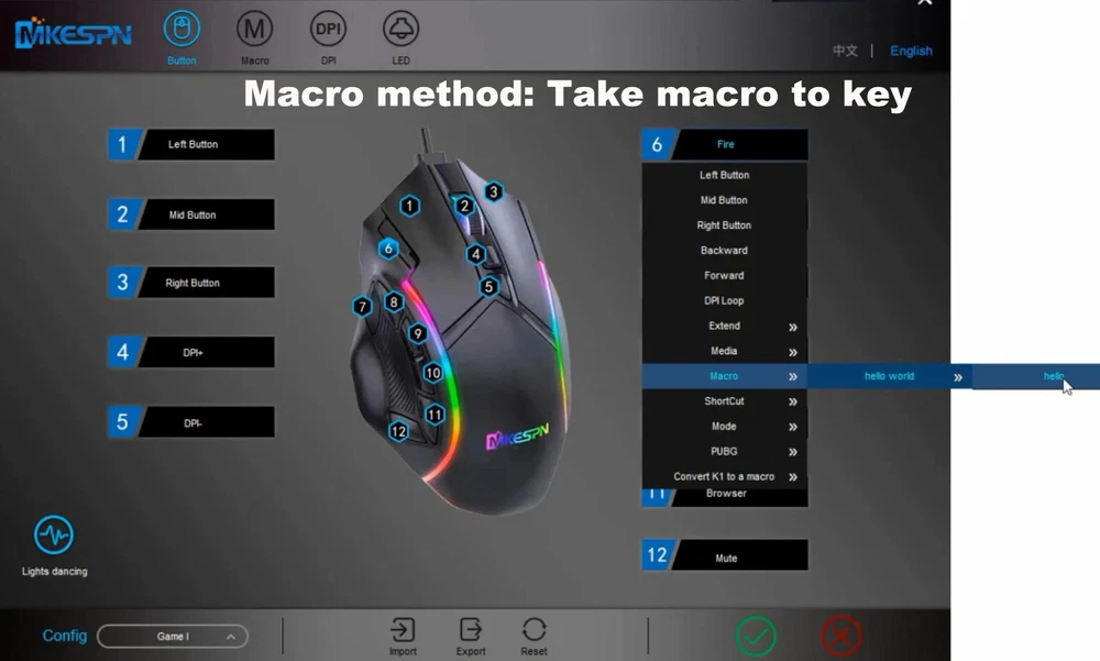 12800DPI Free Weight Macro RGB Gaming Mouse 12 Programmable Keys Game Mouse RGB Light Max to 6 levels For pc mac gun PUBG Laptop 13 kinds RGB backlight Equipped with 13 knids of RGB cool lighting effects of about 16.8 million colors. Between the illuminating of light and shadow, the trend becomes extraordinary. SKIN-LIKE FEEL COMFORTABLE Ergonomic design, the streamline curve fits the player's fingers better, Skin-like feel, comfortable grip, quicker operation. FREE WEIGHT ADJUST ABLE FEEL In order to adapt players with different hand feel, 5g-10g-15g counterweight irons are equipped. Give it a better feel and stability by customizing the weight. How To Macro 1.Click Macro 2.Build New Group 3. Build New macro 3. Define new name 4. Click the record button. 5. Type the keys you want to program. When finishing, please type Stop. 6. THIS IS VERY IMPORTANT. There are 2 ways to upload the macro, Macro and Convert K1. If you choose Macro, you only need type Programmed key on mouse. It will show the programmed information. Take an example, We take "hello" macro to key 6. If you press key 6,it will show "hello". Convert K1 like a switch. If you choose it, you type Programmed key on mouse,liking open switch, and than you press left button. It will show the programmed information. Finally, you type the Programmed key again, liking close switch. You press left button, there is no information out. It likes a switch. When you use, you open it. Take an example, We take "hello" macro to key 6. If you press key 6 and than type left button. it will show "hello". If you do not press left button, it will show nothing. You press key 6 again, meaning close switch. 7. Click √ to save. GUN GAME